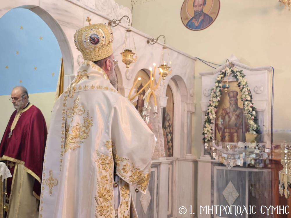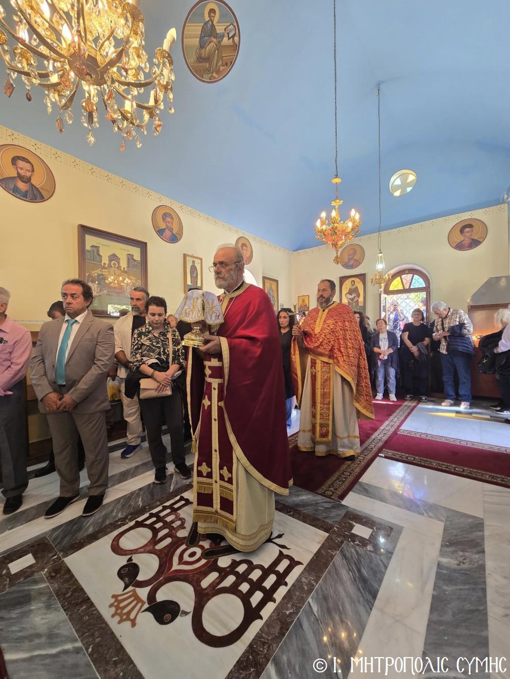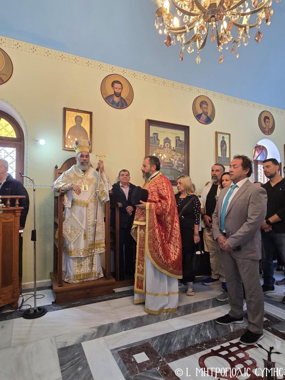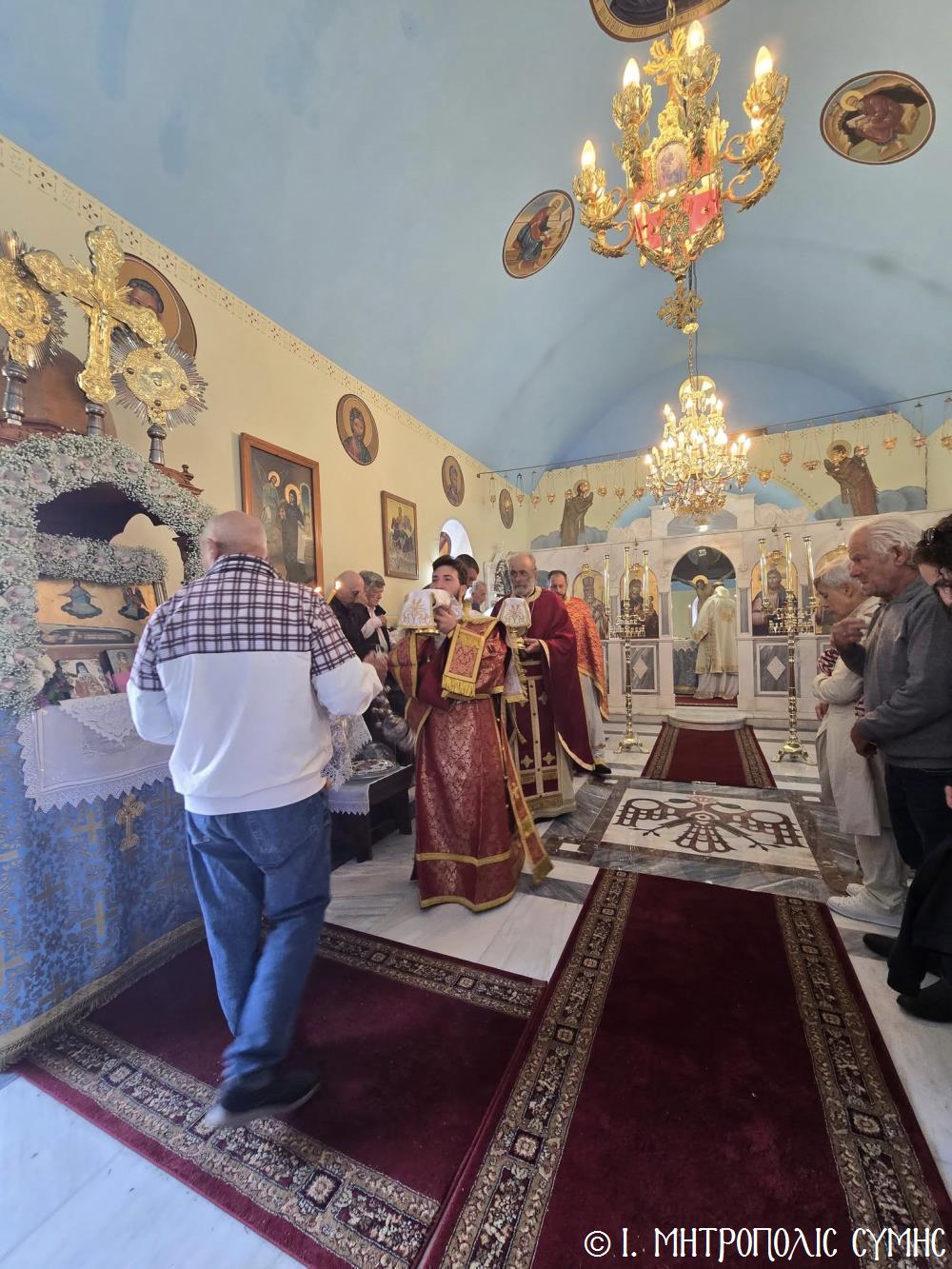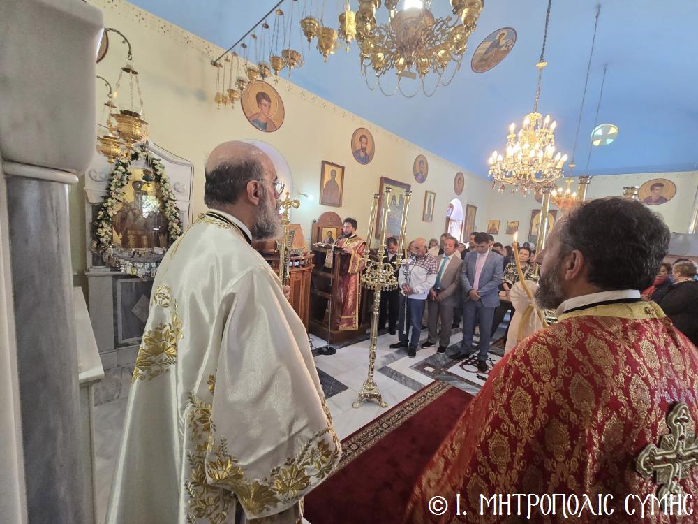 Ὁ Σεβ. Μητροπολίτης μας κ. Χρυσόστομος ἀφίχθη στόν πανηγυρίζοντα Ἱ. Ναό, κομίζοντας χαριτόβρυτο τεμάχιο Ἱεροῦ Λειψάνου τοῦ Ἁγίου Νεκταρίου, τοποθετημένο σέ περίτεχνη θήκη, προκειμένου οἱ πιστοί νά προσκυνήσουν καί νά λάβουν τήν εὐλογία τῆς Χάρης Του. Ἐν συνεχείᾳ χοροστάτησε στόν Ὄρθρο, εὐλόγησε τούς προσφερομένους Ἄρτους καί τέλεσε τήν Θεία Λειτουργία, ὡς καί τήν Διακονία τοῦ θείου λόγου, μέ συλλειτουργούς του τόν π. Στέφανο Μακρῆ Γεν. Ἀρχιερατικό Ἐπίτροπο, τόν π. Ἀντώνιο Μανιᾶ καί τόν Ἱεροδιάκονο π. Παῦλο Τερεζάκη. Τό ἱ. ἀναλόγιο διακόνησαν οἱ Ἱεροψάλτες, πατήρ καί υἱός, κ. Δημοσθένης καί Μερκούριος Γιανναρᾶς, ἐνῶ μεταξύ ἄλλων ἐκκλησιάστηκαν ὁ Δήμαρχος Σύμης κ. Ἐλευθέριος Παπακαλοδούκας καί ὁ Δκτης ΔΑΝ Σύμης Συνταγματάρχης κ. Χαράλαμπος Κατηφόρης.