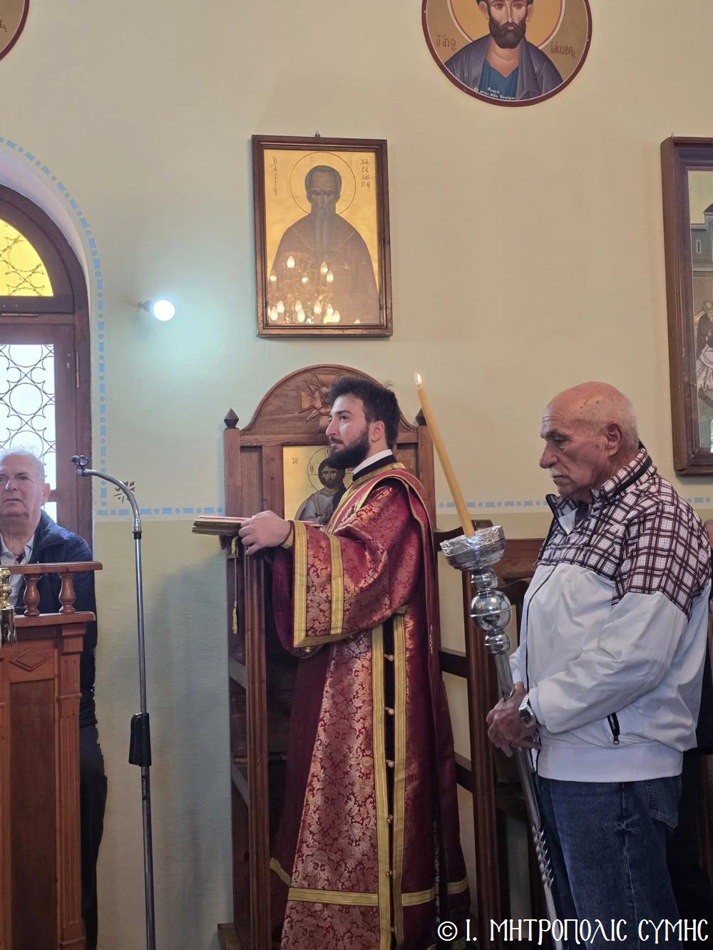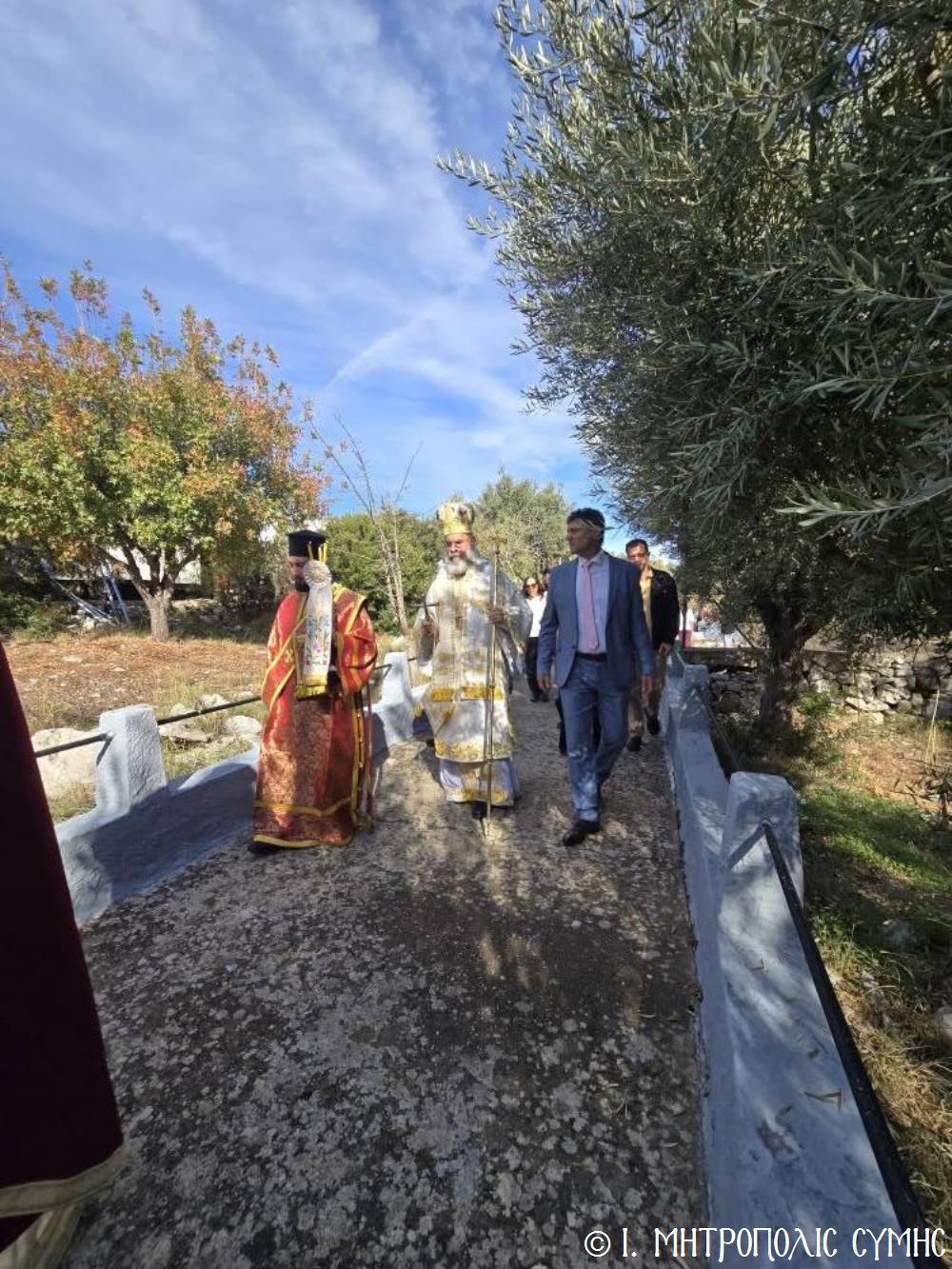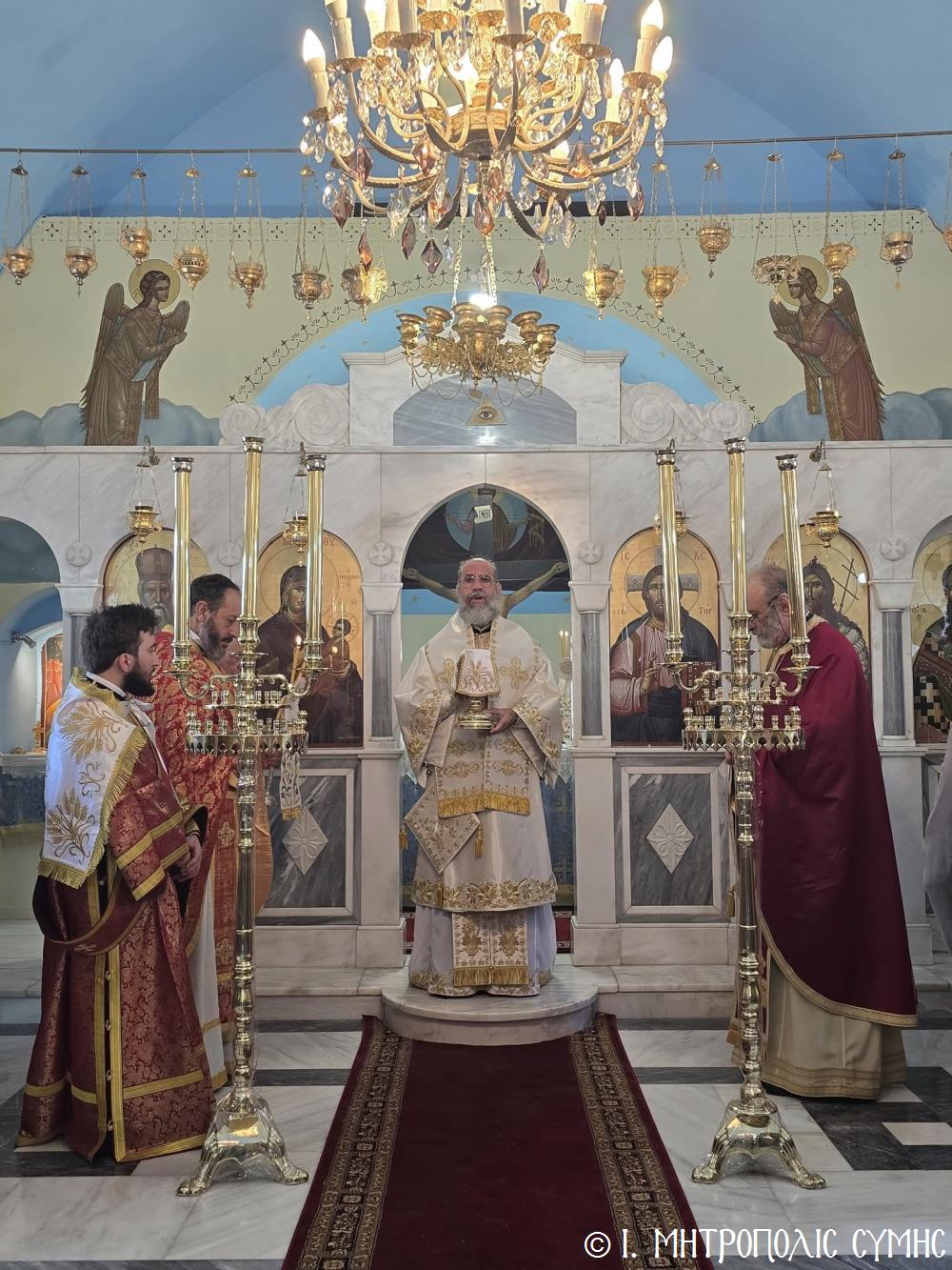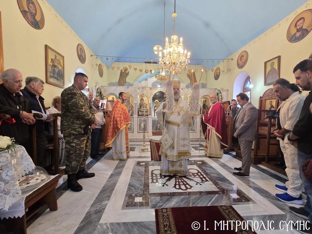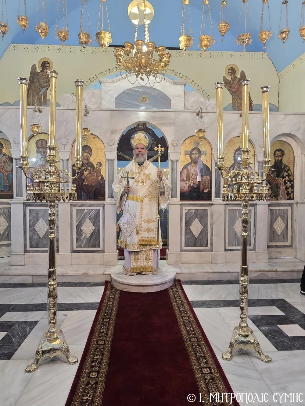 Ὁ Σεβ. Μητροπολίτης μας κ. Χρυσόστομος ἀφίχθη στόν πανηγυρίζοντα Ἱ. Ναό, κομίζοντας χαριτόβρυτο τεμάχιο Ἱεροῦ Λειψάνου τοῦ Ἁγίου Νεκταρίου, τοποθετημένο σέ περίτεχνη θήκη, προκειμένου οἱ πιστοί νά προσκυνήσουν καί νά λάβουν τήν εὐλογία τῆς Χάρης Του. Ἐν συνεχείᾳ χοροστάτησε στόν Ὄρθρο, εὐλόγησε τούς προσφερομένους Ἄρτους καί τέλεσε τήν Θεία Λειτουργία, ὡς καί τήν Διακονία τοῦ θείου λόγου, μέ συλλειτουργούς του τόν π. Στέφανο Μακρῆ Γεν. Ἀρχιερατικό Ἐπίτροπο, τόν π. Ἀντώνιο Μανιᾶ καί τόν Ἱεροδιάκονο π. Παῦλο Τερεζάκη. Τό ἱ. ἀναλόγιο διακόνησαν οἱ Ἱεροψάλτες, πατήρ καί υἱός, κ. Δημοσθένης καί Μερκούριος Γιανναρᾶς, ἐνῶ μεταξύ ἄλλων ἐκκλησιάστηκαν ὁ Δήμαρχος Σύμης κ. Ἐλευθέριος Παπακαλοδούκας καί ὁ Δκτης ΔΑΝ Σύμης Συνταγματάρχης κ. Χαράλαμπος Κατηφόρης.