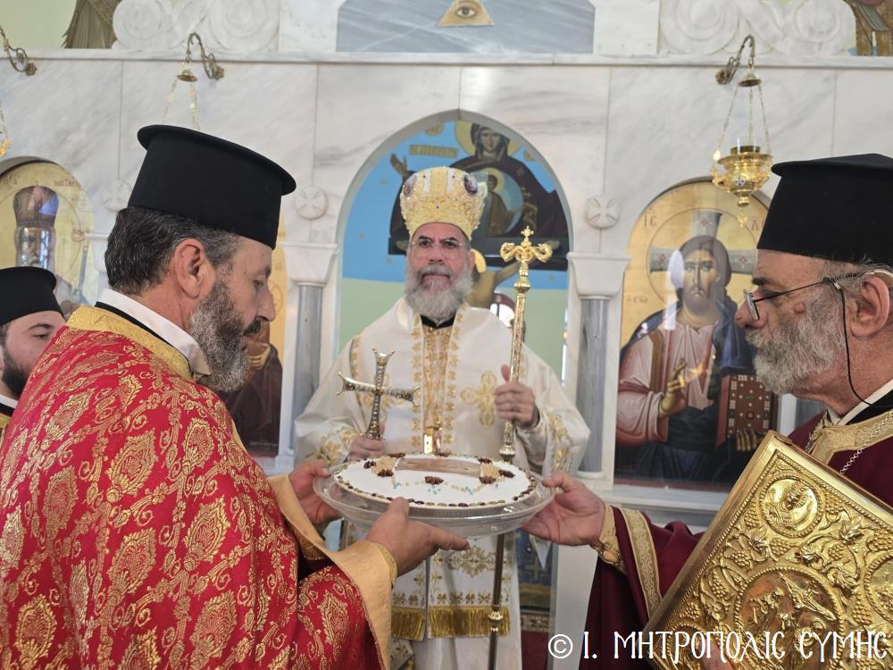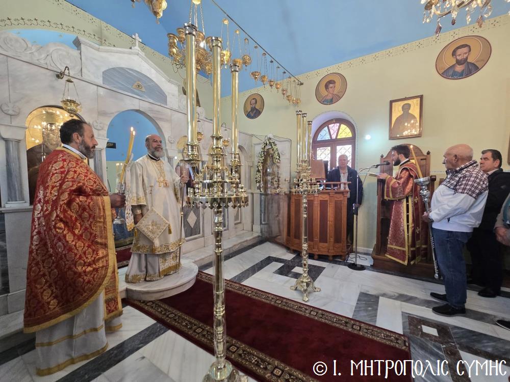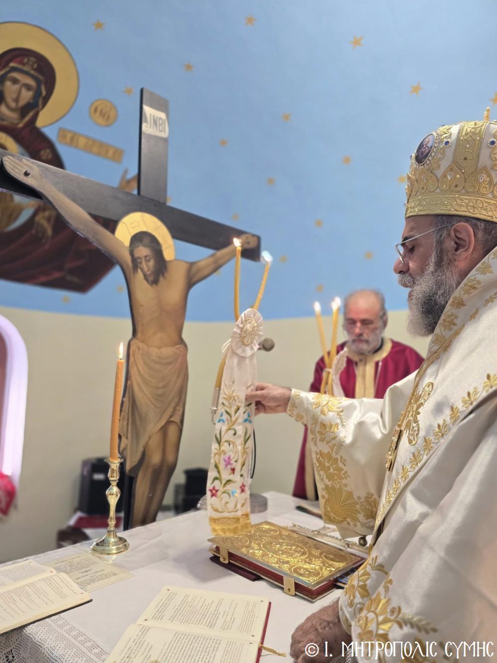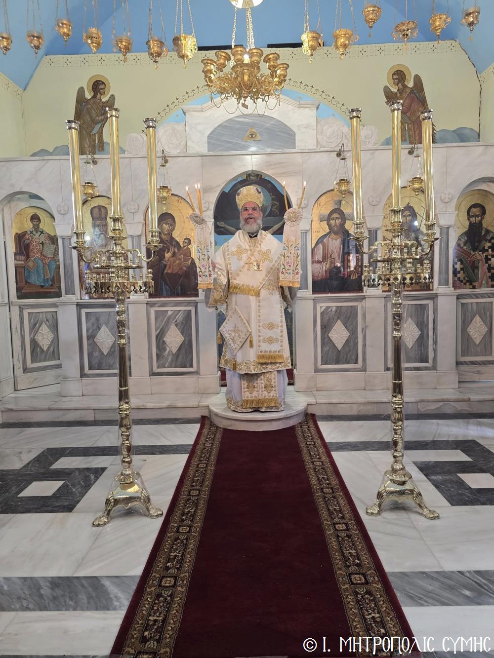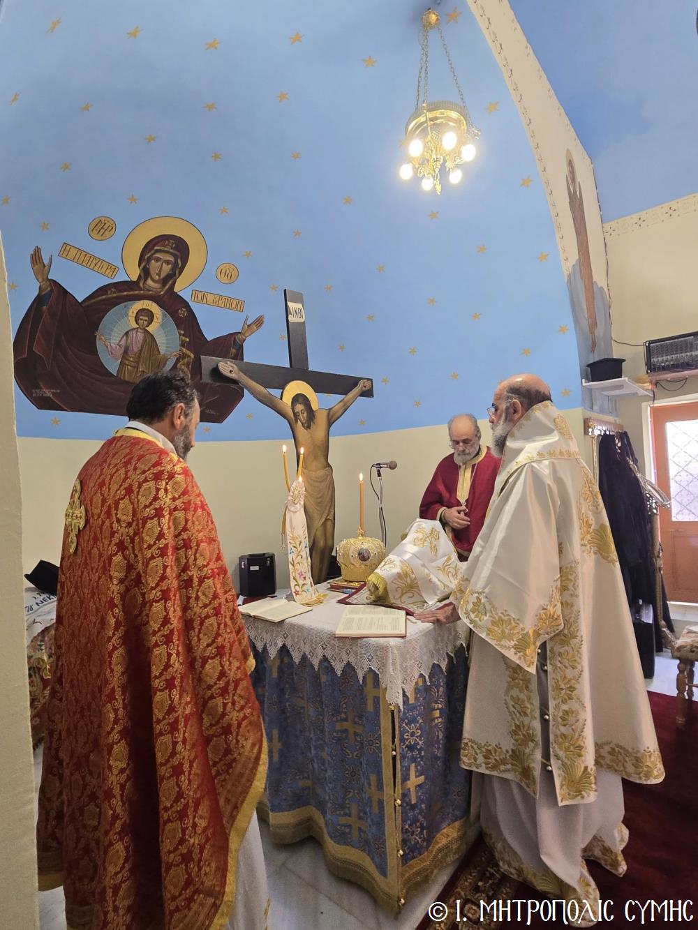 Ὁ Σεβ. Μητροπολίτης μας κ. Χρυσόστομος ἀφίχθη στόν πανηγυρίζοντα Ἱ. Ναό, κομίζοντας χαριτόβρυτο τεμάχιο Ἱεροῦ Λειψάνου τοῦ Ἁγίου Νεκταρίου, τοποθετημένο σέ περίτεχνη θήκη, προκειμένου οἱ πιστοί νά προσκυνήσουν καί νά λάβουν τήν εὐλογία τῆς Χάρης Του. Ἐν συνεχείᾳ χοροστάτησε στόν Ὄρθρο, εὐλόγησε τούς προσφερομένους Ἄρτους καί τέλεσε τήν Θεία Λειτουργία, ὡς καί τήν Διακονία τοῦ θείου λόγου, μέ συλλειτουργούς του τόν π. Στέφανο Μακρῆ Γεν. Ἀρχιερατικό Ἐπίτροπο, τόν π. Ἀντώνιο Μανιᾶ καί τόν Ἱεροδιάκονο π. Παῦλο Τερεζάκη. Τό ἱ. ἀναλόγιο διακόνησαν οἱ Ἱεροψάλτες, πατήρ καί υἱός, κ. Δημοσθένης καί Μερκούριος Γιανναρᾶς, ἐνῶ μεταξύ ἄλλων ἐκκλησιάστηκαν ὁ Δήμαρχος Σύμης κ. Ἐλευθέριος Παπακαλοδούκας καί ὁ Δκτης ΔΑΝ Σύμης Συνταγματάρχης κ. Χαράλαμπος Κατηφόρης.