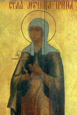 Ἁγία Μάρτυς Εἰρήνη, μαρτύρησε στήν Κόρινθο ἐπί αὐτοκράτορος Δεκίου (249 – 251 μ.Χ.) κατά τίς ἡμέρες τοῦ Πάσχα. Βρισκόταν στήν Ἑλλάδα κατά τόν καιρό τοῦ Πάσχα, ὅταν μαρτύρησε ὁ Ἅγιος Λεωνίδης μαζί μέ τίς Ἁγίες ἑπτά γυναῖκες, καί δοξολογοῦσε τόν Θεό μαζί μέ ἄλλους Χριστιανούς σέ κάποιο εὐκτήριο οἶκο. Τήν συνέλαβαν, τήν φυλάκισαν καί στήν συνέχεια τήν ὑπέβαλαν σέ βασανιστήρια. Πρῶτα τῆς ἔκοψαν τή γλῶσσα, ἔπειτα τῆς ἔβγαλαν τά δόντια καί, τελικά, τήν ἀποκεφάλισαν. Ἔτσι ἡ Ἁγία Εἰρήνη ἔλαβε ἀπό τόν μισθαποδότη Κύριο τό στέφανο τοῦ μαρτυρίου.