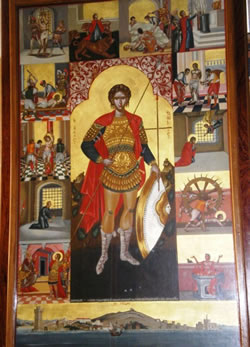 Συγκινημένος ο Σεβασμιώτατος, για τη φανέρωση του Αγίου, παρατήρησε, πως ήταν ντυμένος σαν Ρωμαίος στρατιωτικός, κρατώντας στο αριστερό χέρι του ένα σταυρό και στο δεξιό μια αναμμένη λαμπάδα. Ο αγιογράφος ακόμα ολόγυρα της εικόνας ζωγράφισε σε δώδεκα παραστάσεις τα μαρτύρια, που υπόφερε ο Άγιος και, που εξιστορούν ολοφάνερα την όλη ζωή του.