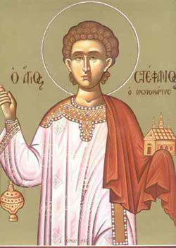 Βασίλειον διάδημα, ἐστέφθη σή κορυφή, ἐξ ἄθλων ὧν ὑπέμεινας, ὑπέρ Χριστοῦ τοῦ Θεοῦ, Μαρτύρων πρωτόαθλε Στέφανε· σύ γάρ τήν Ἰουδαίων, ἀπελέγξας μανίαν, εἶδές σου τόν Σωτῆρα, τοῦ Πατρός δεξιόθεν. Αὐτόν οὖν ἐκδυσώπει ἀεί, ὑπέρ τῶν ψυχῶν ἡμῶν.