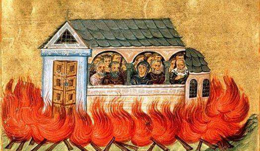 Αὐτοί ἀπέμειναν ἔξω ἀπό τόν Ναό πού κάηκε μέ προσταγή τοῦ Μαξιμιανοῦ στή Νικομήδεια, ὅπου κάηκαν ζωντανοί οἱ 20.000 χριστιανοί.