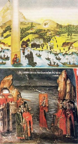 Μετά πήγε στο Μοναστήρι, είπε το νέο και οι Πατέρες με πομπή και Θεομητορικούς ύμνους πήγαν προς την παραλία. Ο Γέρων Γαβριήλ περπάτησε λίγο στη θάλασσα και αμέσως η εικόνα ήρθε στην αγκαλιά του. Οι Πατέρες με πολλήν ευλάβεια και χαρά την υποδέχτηκαν και έκαμαν ολονύκτιες αγρυπνίες και δεήσεις και Λειτουργίες επί τρία μερόνυχτα, για να ευχαριστήσουν τον Θεό και την Παναγία. Την έβαλαν στο ναό της Μονής, αλλά εκείνη έφευγε και στεκόταν πάνω από την πύλη του Μοναστηριού. Αυτό επανελήφθη πολλές φορές, ώσπου ξαναπαρουσιάστηκε η Παναγία στον Γέροντα Γαβριήλ και του λέει: «Πες στον ηγούμενο να παύσετε να με πειράζετε, διότι δεν ήρθα στο Μοναστήρι για να με φυλάτε σεις, αλλά ήρθα για να γίνω εγώ φύλακας και φρουρός σας και σ' αυτήν και στην μέλλουσα ζωή. Και όσοι θα ζήσουν με ευλάβεια και φόβο Θεού και δεν αμελούν στην απόκτηση των αρετών, και τελειώσουν την πρόσκαιρη ζωή τους σ' αυτόν τον τόπο, ας έχουν θάρρος και να μη φοβούνται την κόλαση διότι αυτή τη χάρη ζήτησα από τον Θεό και Υιό μου και την πήρα. Ως επιβεβαίωση των λόγων μου σας δίνω αυτό το σημείο: Όσο βλέπετε την εικόνα μου στο Μοναστήρι σας, δεν θα λείψη απ' το Όρος τούτο η χάρις και το έλεος του Υιού μου και Θεού» (ε' 143).