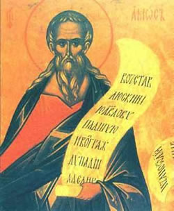 Χαίροις ὦ Προφῆτα Θεοῦ Ἀμώς· τήν γάρ πεπτωκυῖαν, ὡς προέφης σκηνήν Δαβίδ, σαρκωθείς ὁ Λόγος, ἀνέστησεν ἐνδόξως, καί ταύτην θεουργήσας, Πατρί προσήγαγε.