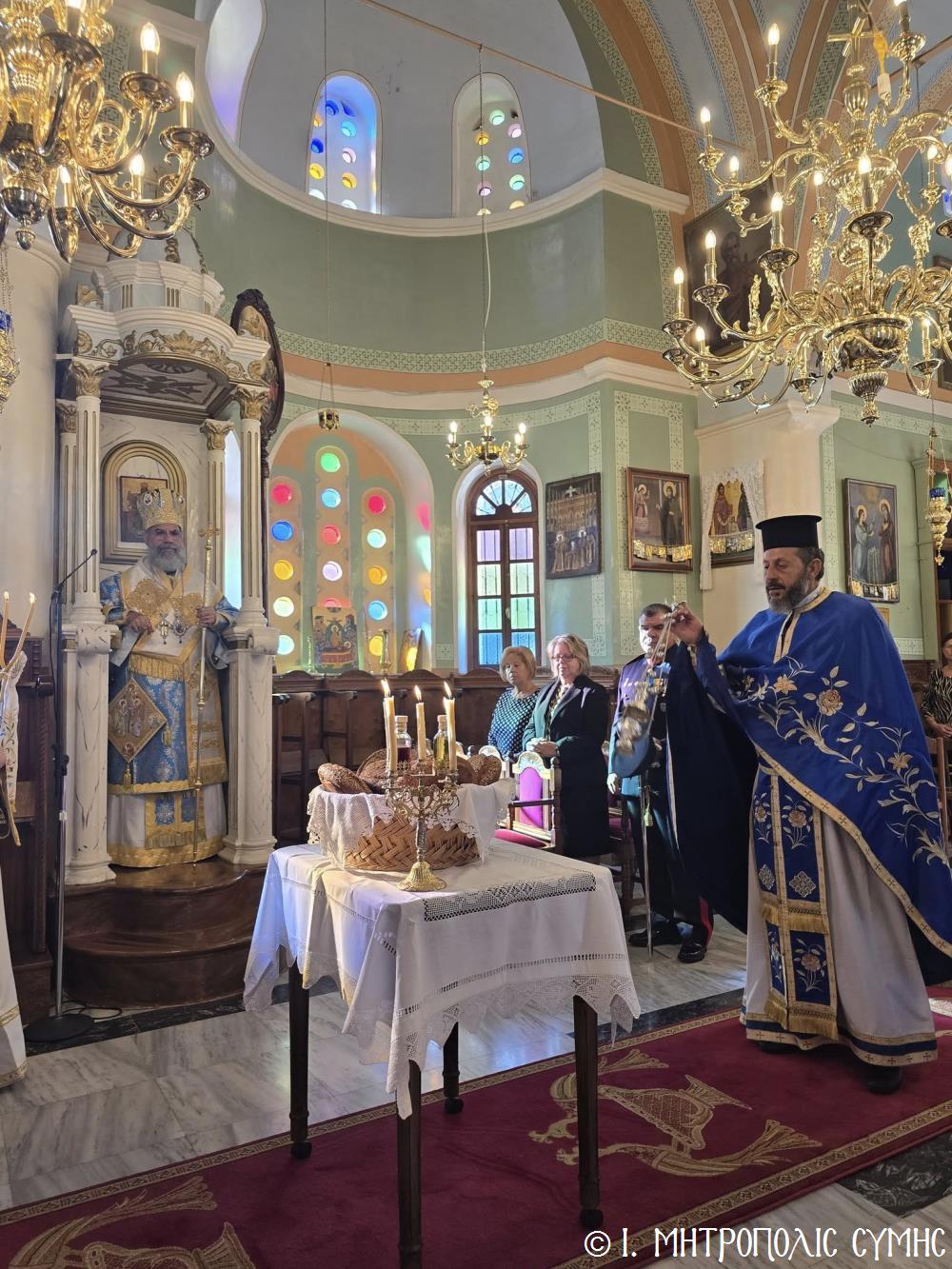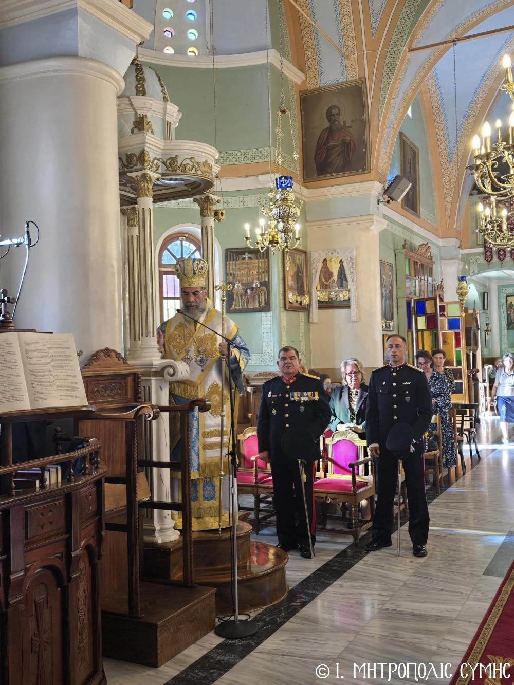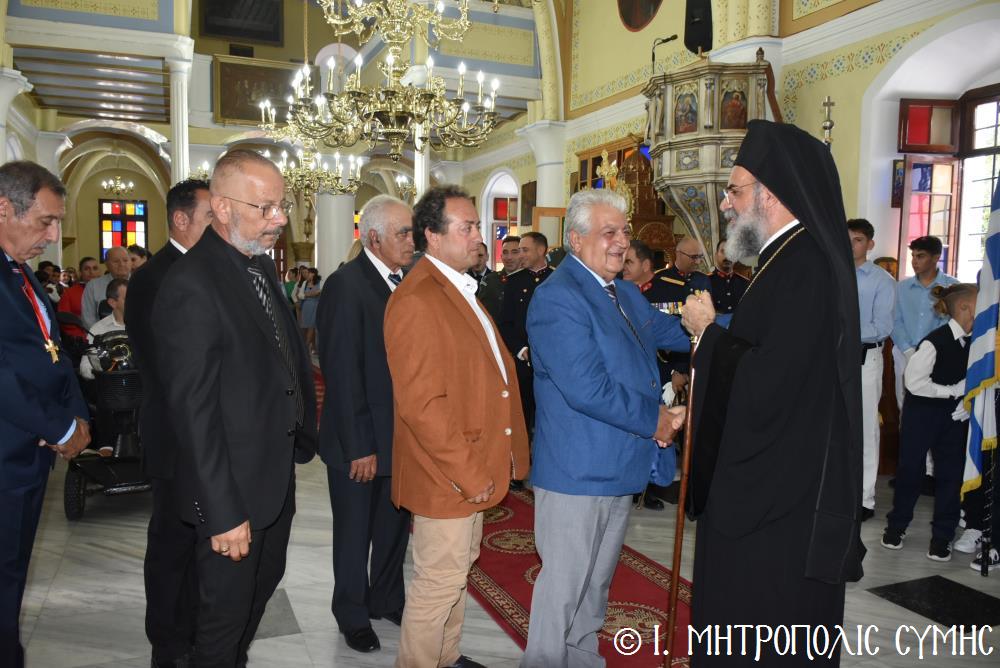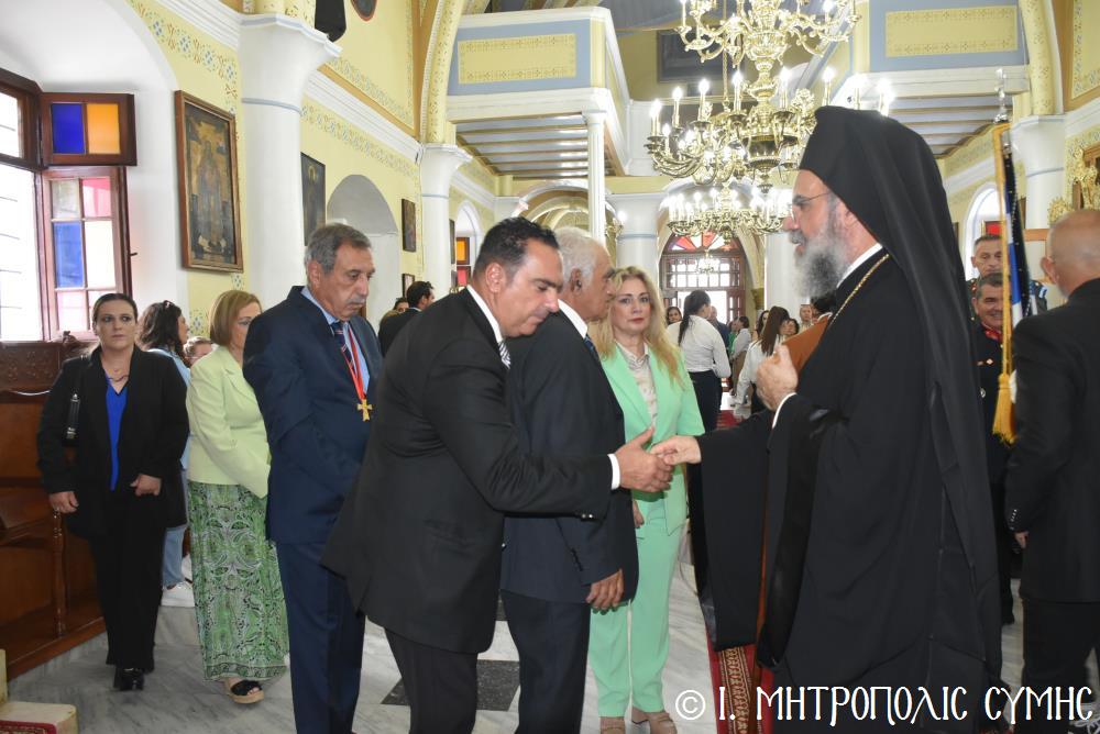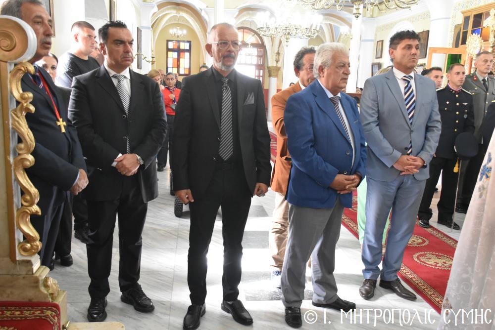 Παρόντες ὅλοι οἱ ἐκπρόσωποι τῶν τοπικῶν Ἀρχῶν, μέ ἐπικεφαλῆς τόν Δήμαρχο Σύμης κ. Ἐλευθέριο Παπακαλοδούκα, τόν Πρόεδρο τοῦ Δημοτικοῦ Συμβουλίου καί Μέλη αὐτοῦ. Ἐκπρόσωπος τοῦ Περιφερειάρχου Νοτίου Αἰγαίου κ. Γ. Χατζημάρκου παρέστη ὁ Ἀντιπερειφερειάρχης κ. Κάλλιστος Διακογεωργίου. Παρέστη ἐπίσης ὁ Διοικητής Δ.Α.Ν. Σύμης, Συνταγματάρχης κ. Χαράλαμπος Κατηφόρης, Ἀξιωματικοί, Ὑπαξιωματικοί καί Ὁπλίτες, οἱ ὁποῖοι ἔλαβαν μέρος καί στήν παρέλαση. Ἐκπρόσωπος τῆς Ἑλληνικῆς Ἀστυνομίας παρέστη ὁ Ἀστυνόμος κ. Δημοσθένης Κοτσιλάρας καί τοῦ Λιμενικοῦ Σώματος ὁ Ὑπολιμενάρχης Σύμης. Παρέστησαν ἐπίσης, ὁ Ἄρχων Δικαιοφύλαξ τῆς Μ.Χ.Ε. κ. Θεὀδωρος Μιχ. Παπαγεωργίου, Νομικός Σύμβουλος τῆς Ἱ. Μητροπόλεως, Ἐκπαιδευτικοί τῶν Σχολείων τῆς Νήσου, οἱ Μαθητές μας, καθώς καί Ἐκπρόσωποι Φορέων, Κομμάτων καί Συλλόγων. Σ’ ὅλες τίς ἑορταστικές ἐκδηλώσεις, μέ τήν συνεργία τοῦ καλοῦ καιροῦ, συμμετεῖχε πολύς κόσμος.