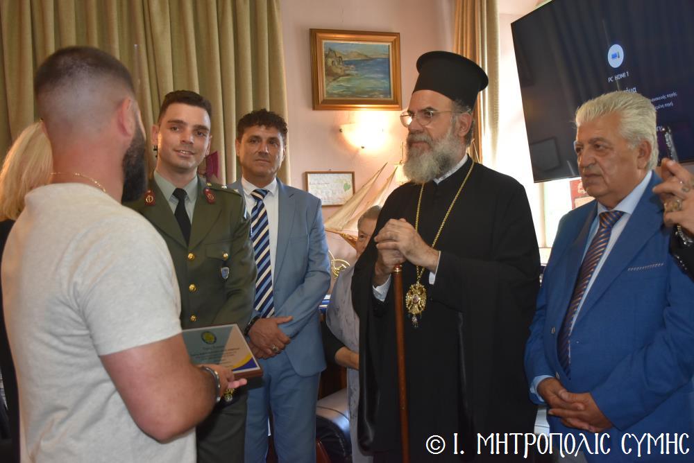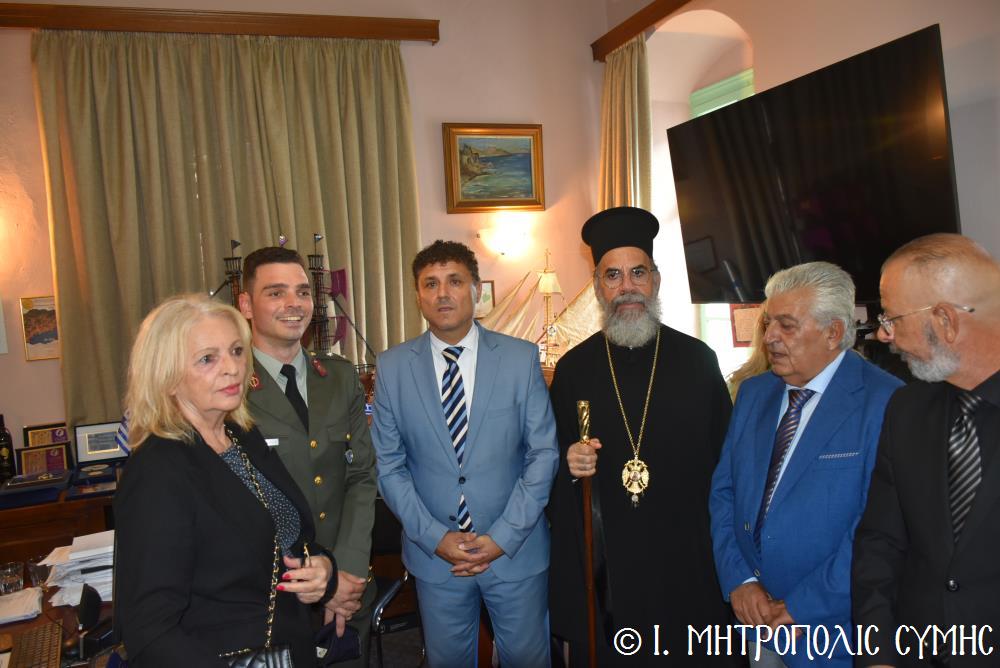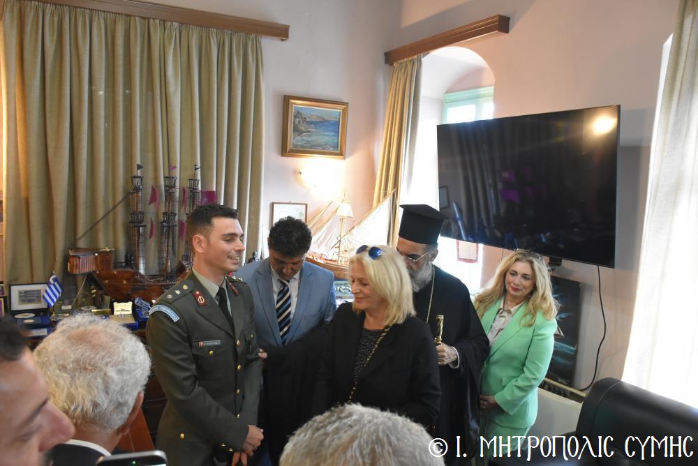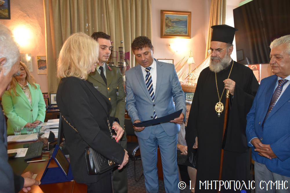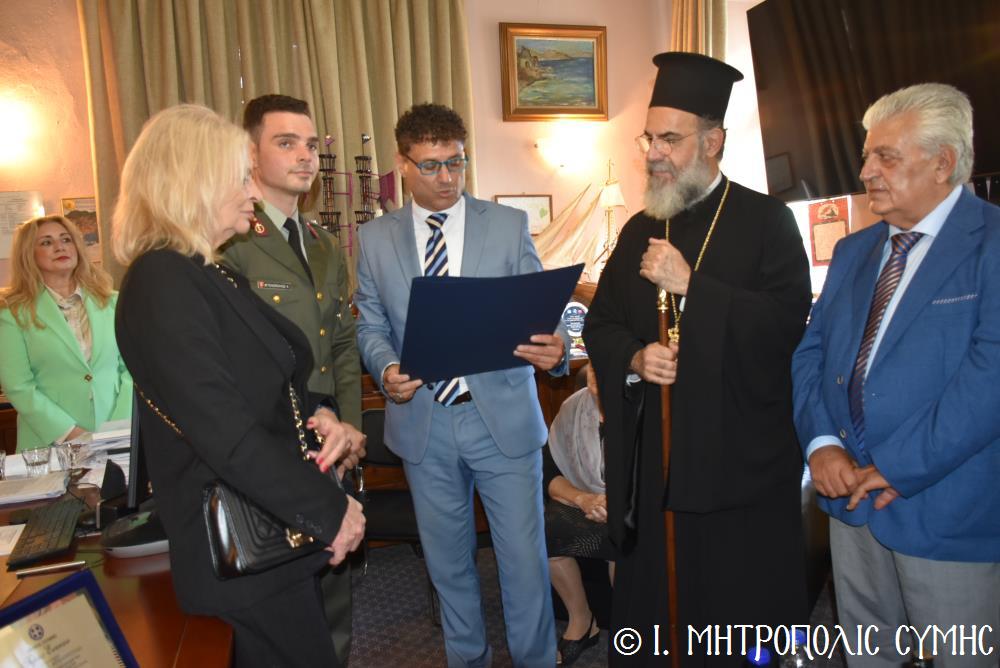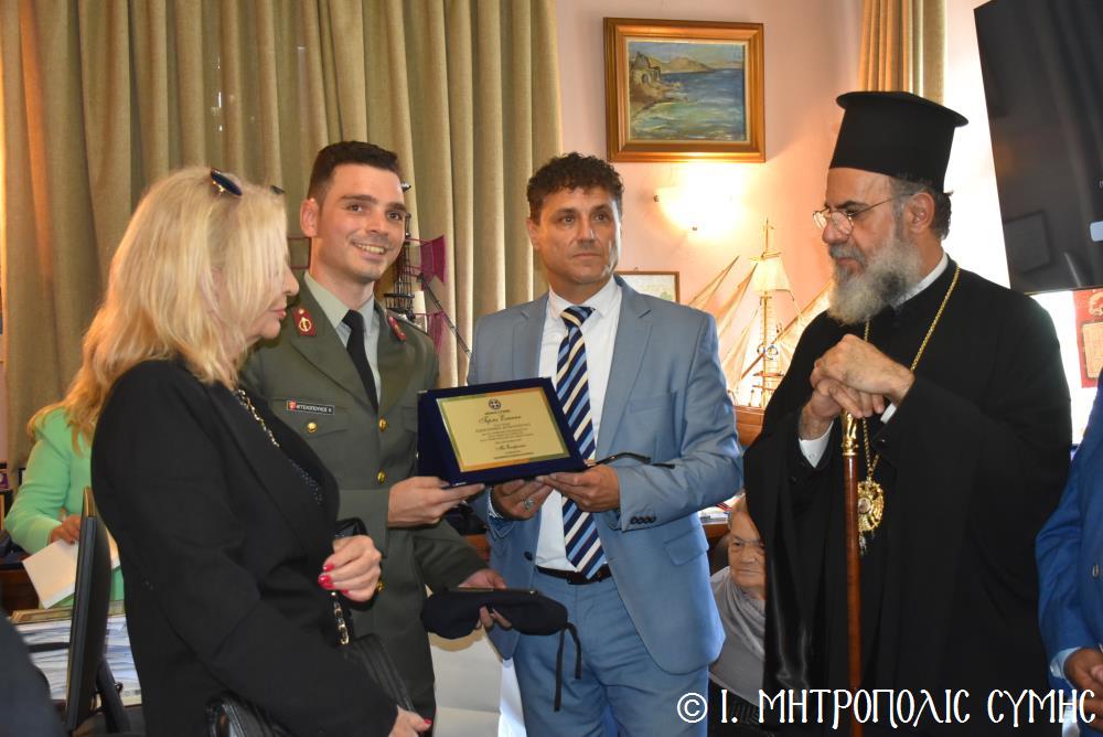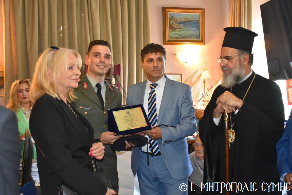 Ἐν συνεχείᾳ, ὁ Δήμαρχος Σύμης κ. Ἐλευθέριος Παπακαλοδούκας, ὁ Σεβ. Μητροπολίτης μας κ. Χρυσόστομος, ἅπασες οἱ λοιπές τοπικές Ἀρχές καί πολλοί κάτοικοι, ἀνέβηκαν στό Δημαρχεῖο τῆς Σύμης, ὅπου ἔλαβε χῶρα μιά σεμνή τελετή, κατά τήν ὁποία ὁ Δήμαρχος, κατόπιν δικῆς του πρωτοβουλίας καί ἀποφάσεως τοῦ Δημοτικοῦ Συμβουλίου, ἀπένειμε τιμητικό βραβεῖο στόν Στρατιωτικό Ἰατρό, Ἀνθυπίατρο κ. Κωνσταντῖνο Ἀγγελόπουλο, ὁ ὁποῖος, ὑπηρέτησε μέ συνέπεια καί ἦθος τήν Ἰατρική ἐπιστήμη, προσφέροντας πολύτιμες ὑπηρεσίες στούς κατοίκους καί ἐπισκέπτες τῆς Νήσου μας. Ὁ Ἰατρός, μετά ἀπό εὐδόκιμη 2ετῆ ὑπηρεσία στόν ἐνταῦθα Στρατιωτικό Σχηματισμό, μετατίθεται πλέον στήν Ἀθήνα γιά τήν ἐκπόνηση τῆς ἰατρικῆς του εἰδικότητος. Τό διάστημα πού παρέμεινε στήν Σύμη, στελέχωσε μέ αὐταπάρνηση καί πνεῦμα ἀνιδιοτέλειας καί θυσίας τό Ἰατρεῖο τῆς Δ.Α.Ν. τό ὁποῖο κατόπιν αἰτήματός του καί μέ τήν διαμεσολάβηση τοῦ Σεβ. Μητροπολίτου μας ἐξοπλίσθη πλήρως, δίνοντάς του τήν δυνατότητα νά προσφέρει πρός ὅλους ἀνεξαιρέτως τούς κατοίκους σωτήριες κυριολεκτικά ὑπηρεσίες.