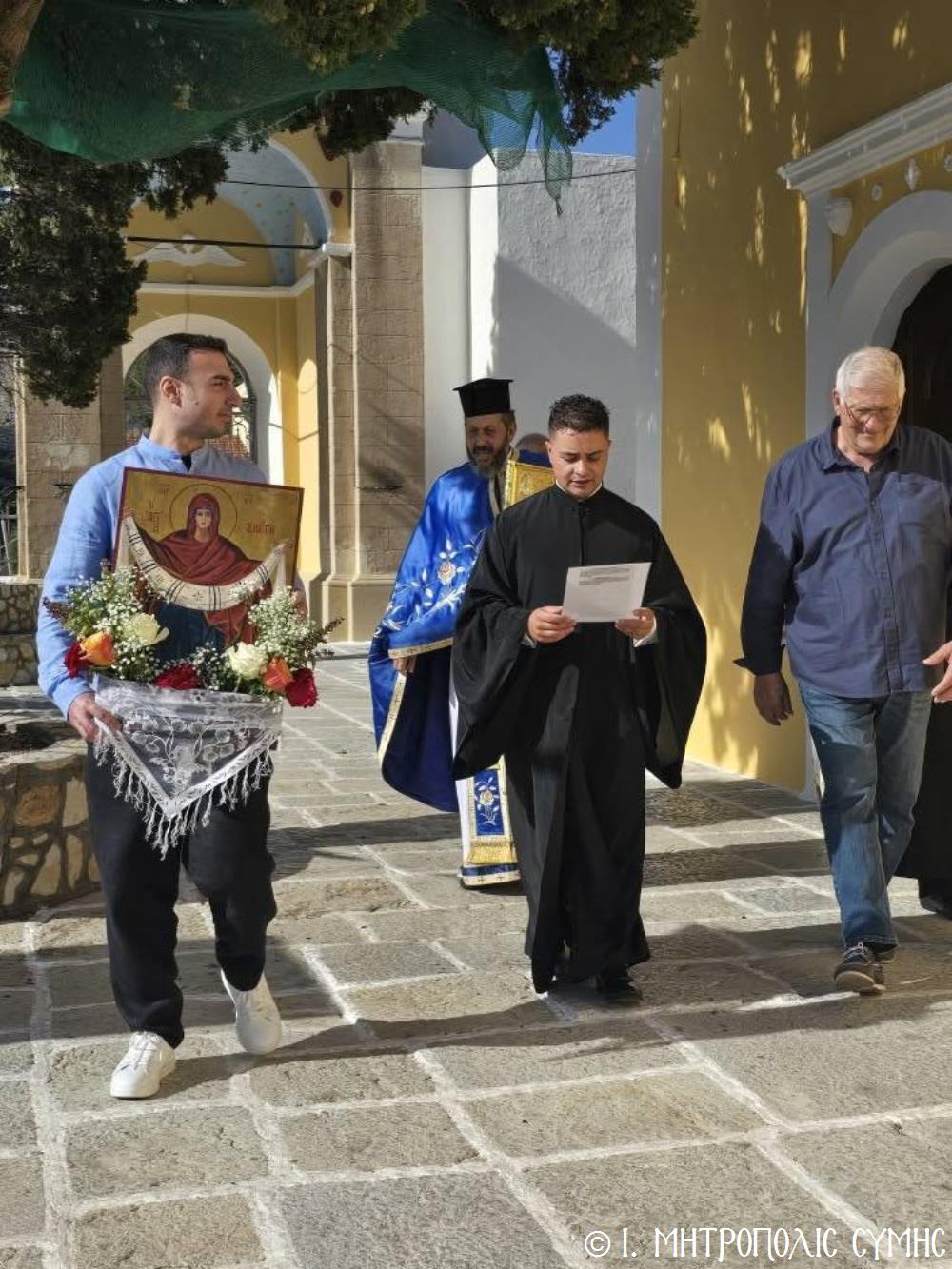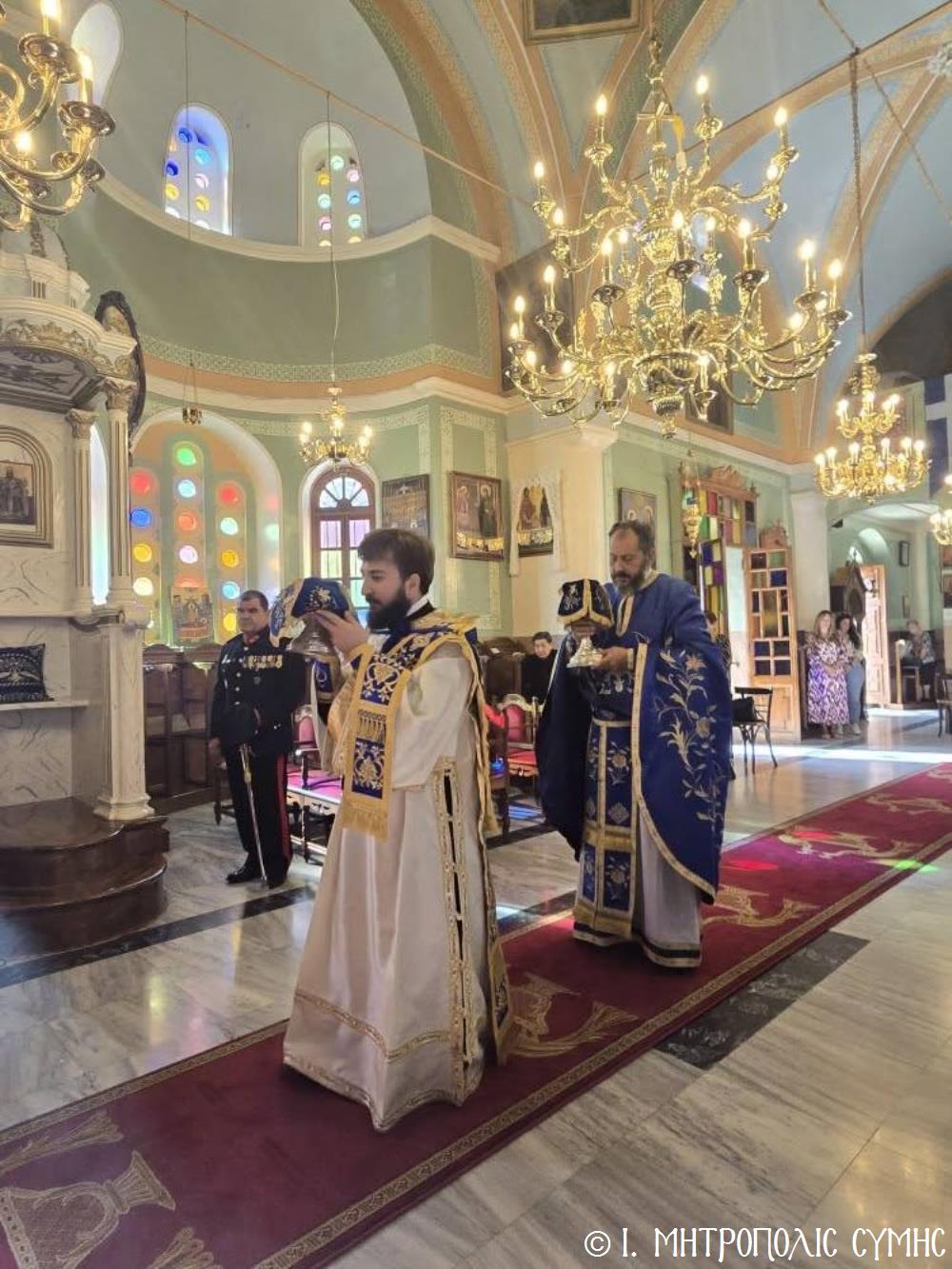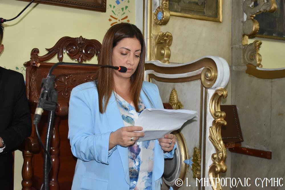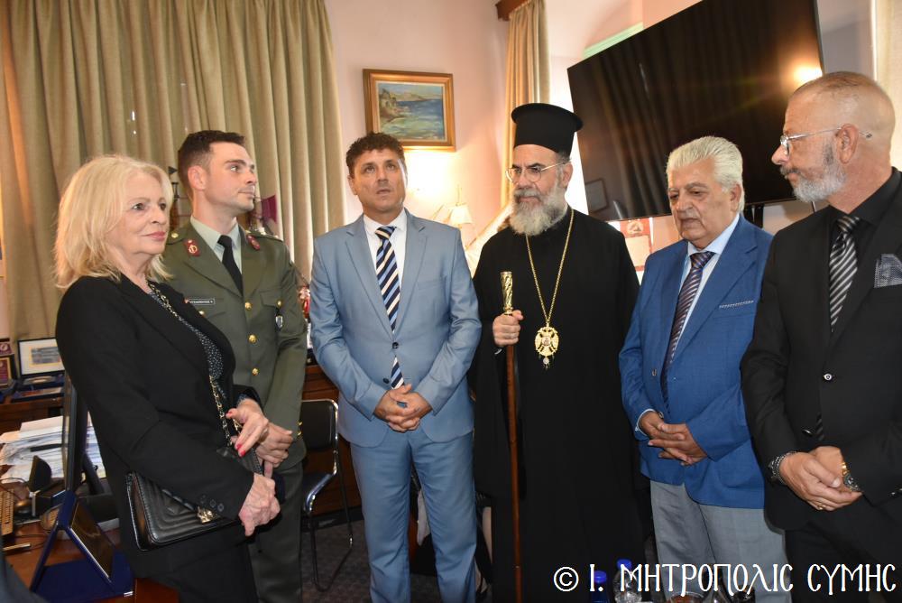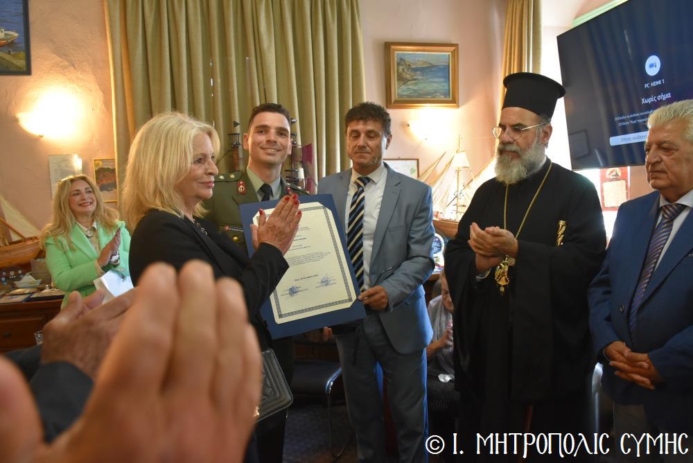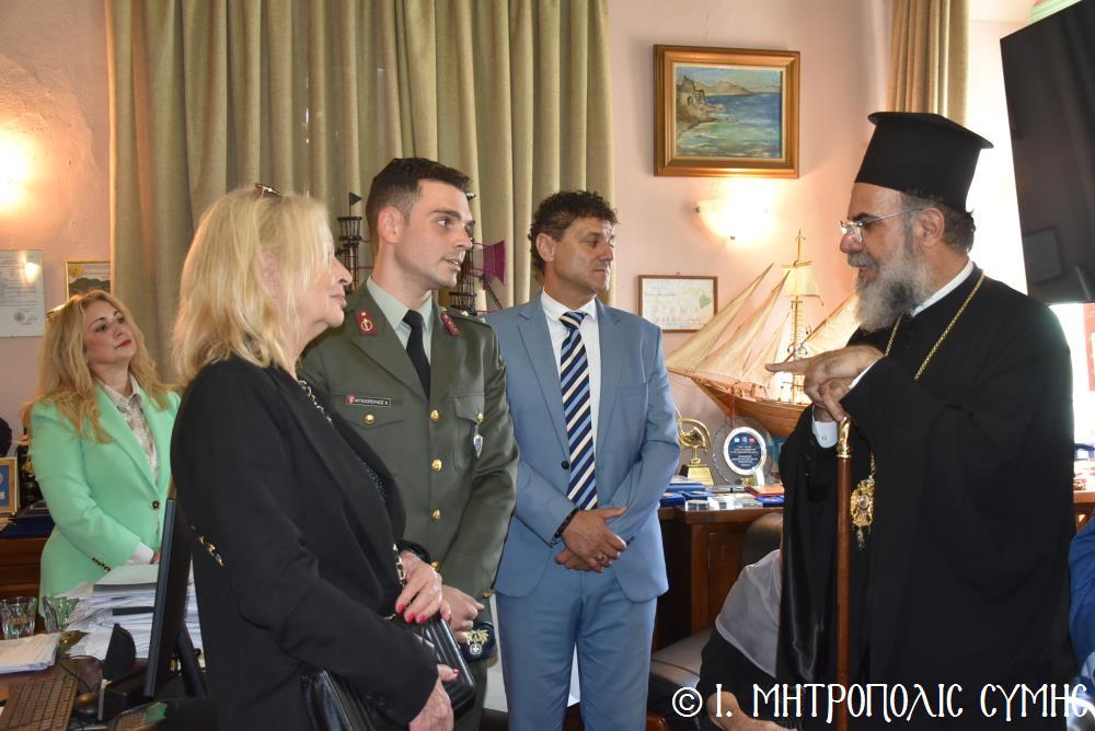 Ἐν συνεχείᾳ, ὁ Δήμαρχος Σύμης κ. Ἐλευθέριος Παπακαλοδούκας, ὁ Σεβ. Μητροπολίτης μας κ. Χρυσόστομος, ἅπασες οἱ λοιπές τοπικές Ἀρχές καί πολλοί κάτοικοι, ἀνέβηκαν στό Δημαρχεῖο τῆς Σύμης, ὅπου ἔλαβε χῶρα μιά σεμνή τελετή, κατά τήν ὁποία ὁ Δήμαρχος, κατόπιν δικῆς του πρωτοβουλίας καί ἀποφάσεως τοῦ Δημοτικοῦ Συμβουλίου, ἀπένειμε τιμητικό βραβεῖο στόν Στρατιωτικό Ἰατρό, Ἀνθυπίατρο κ. Κωνσταντῖνο Ἀγγελόπουλο, ὁ ὁποῖος, ὑπηρέτησε μέ συνέπεια καί ἦθος τήν Ἰατρική ἐπιστήμη, προσφέροντας πολύτιμες ὑπηρεσίες στούς κατοίκους καί ἐπισκέπτες τῆς Νήσου μας. Ὁ Ἰατρός, μετά ἀπό εὐδόκιμη 2ετῆ ὑπηρεσία στόν ἐνταῦθα Στρατιωτικό Σχηματισμό, μετατίθεται πλέον στήν Ἀθήνα γιά τήν ἐκπόνηση τῆς ἰατρικῆς του εἰδικότητος. Τό διάστημα πού παρέμεινε στήν Σύμη, στελέχωσε μέ αὐταπάρνηση καί πνεῦμα ἀνιδιοτέλειας καί θυσίας τό Ἰατρεῖο τῆς Δ.Α.Ν. τό ὁποῖο κατόπιν αἰτήματός του καί μέ τήν διαμεσολάβηση τοῦ Σεβ. Μητροπολίτου μας ἐξοπλίσθη πλήρως, δίνοντάς του τήν δυνατότητα νά προσφέρει πρός ὅλους ἀνεξαιρέτως τούς κατοίκους σωτήριες κυριολεκτικά ὑπηρεσίες.