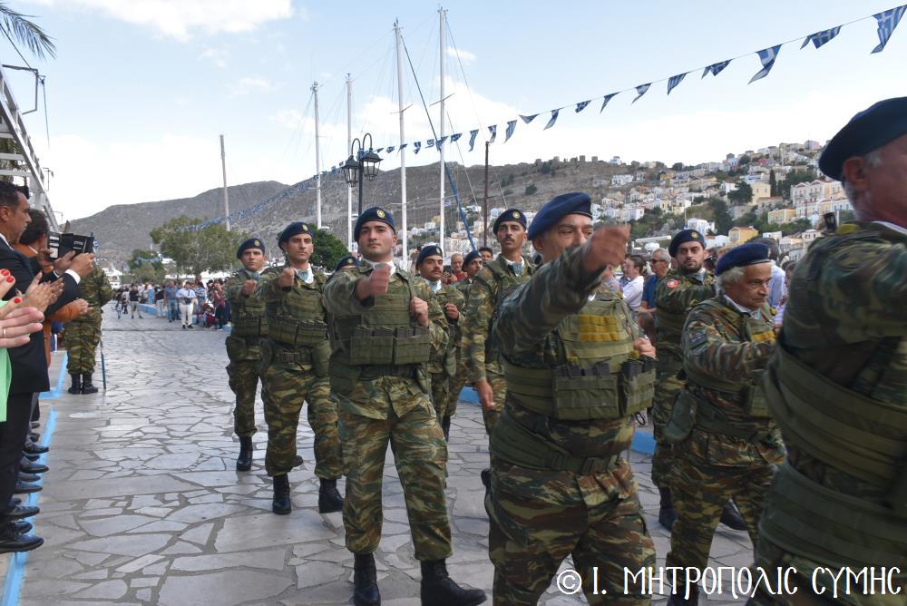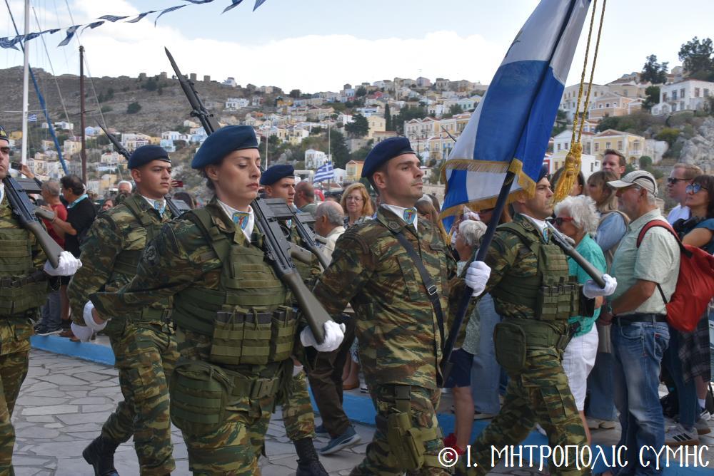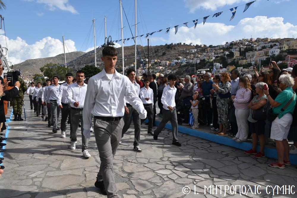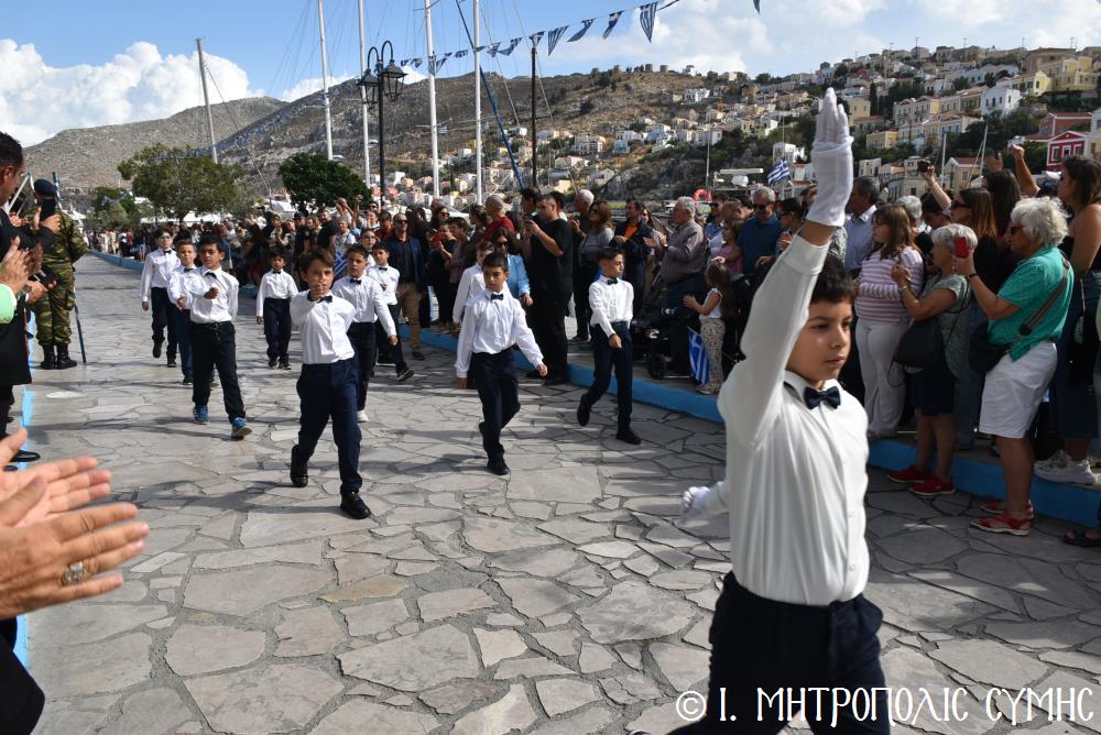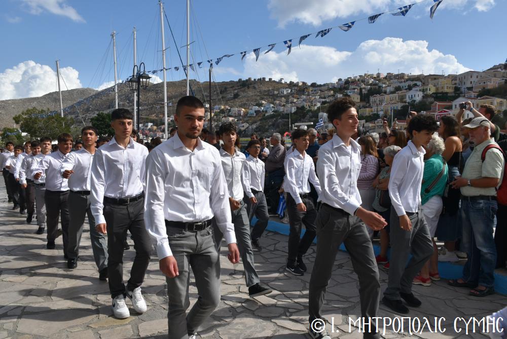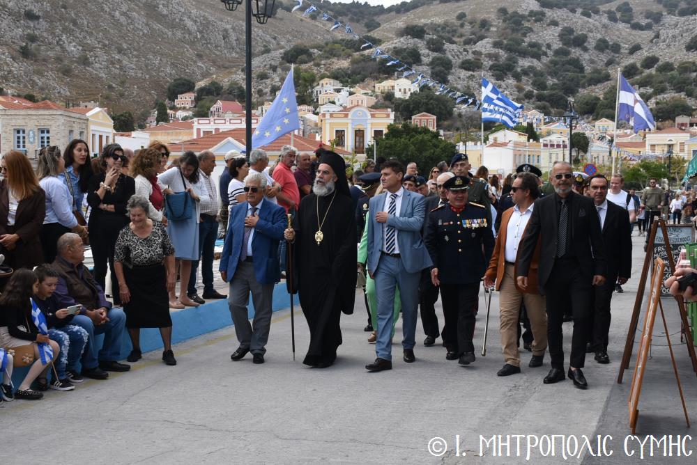 Ἀμέσως μετά, στό Μνημεῖο τῶν Πεσόντων Ἡρώων ἀκολούθησε ἡ ἐπιμνημόσυνη δέηση ἀπό τόν Σεβ. Μητροπολίτη μας κ. Χρυσόστομο καί κατατέθηκαν στεφάνια ἀπό τούς προαναφερομένους ἐκπροσώπους τῶν τοπικῶν Ἀρχῶν. Ἐν συνεχείᾳ ξεκίνησε ἡ μαθητική παρέλαση, μέ τούς μαθητές τῶν Δημοτικῶν Σχολείων καί τοῦ Πανορμιτείου Γυμνασίου, καθώς καί τῶν Λυκείων τοῦ Νησιοῦ καί τήν παρέλαση ὁλοκλήρωσαν οἱ Έφεδροι καί οἱ μάχιμοι στρατιῶτες τοῦ 549 ΤΕ Σύμης, οἱ ὁποῖοι ἐν τέλει ἔκλεισαν καί τήν ὅλη ἐκδήλωση μέ τήν τελετή «καλύψεως» τῆς Σημαίας, ψάλλοντας τόν Ἐθνικό Ὕμνο.