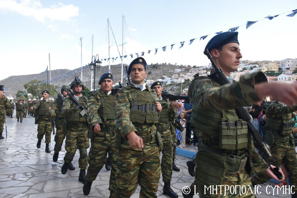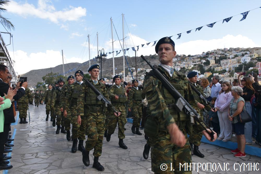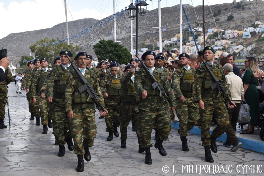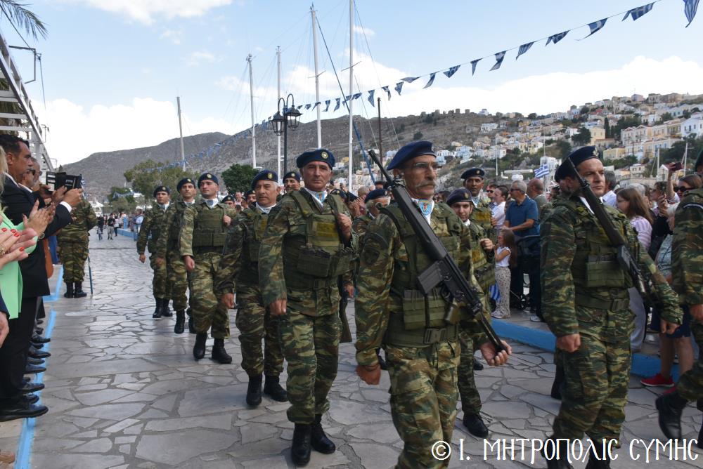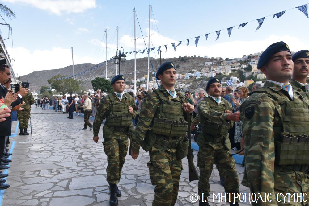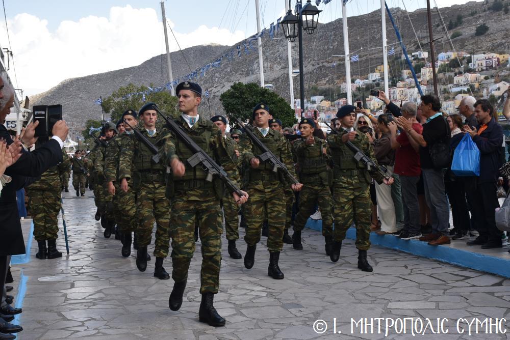 Ἀμέσως μετά, στό Μνημεῖο τῶν Πεσόντων Ἡρώων ἀκολούθησε ἡ ἐπιμνημόσυνη δέηση ἀπό τόν Σεβ. Μητροπολίτη μας κ. Χρυσόστομο καί κατατέθηκαν στεφάνια ἀπό τούς προαναφερομένους ἐκπροσώπους τῶν τοπικῶν Ἀρχῶν. Ἐν συνεχείᾳ ξεκίνησε ἡ μαθητική παρέλαση, μέ τούς μαθητές τῶν Δημοτικῶν Σχολείων καί τοῦ Πανορμιτείου Γυμνασίου, καθώς καί τῶν Λυκείων τοῦ Νησιοῦ καί τήν παρέλαση ὁλοκλήρωσαν οἱ Έφεδροι καί οἱ μάχιμοι στρατιῶτες τοῦ 549 ΤΕ Σύμης, οἱ ὁποῖοι ἐν τέλει ἔκλεισαν καί τήν ὅλη ἐκδήλωση μέ τήν τελετή «καλύψεως» τῆς Σημαίας, ψάλλοντας τόν Ἐθνικό Ὕμνο.