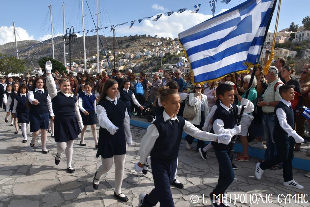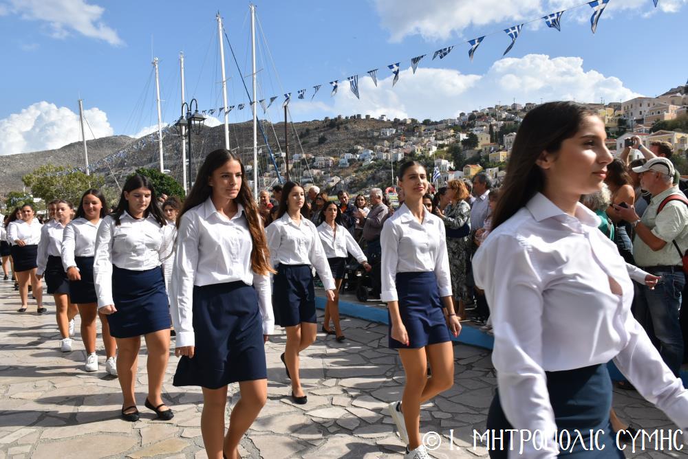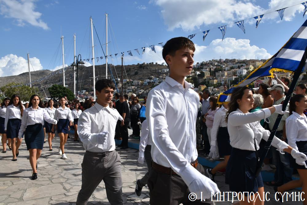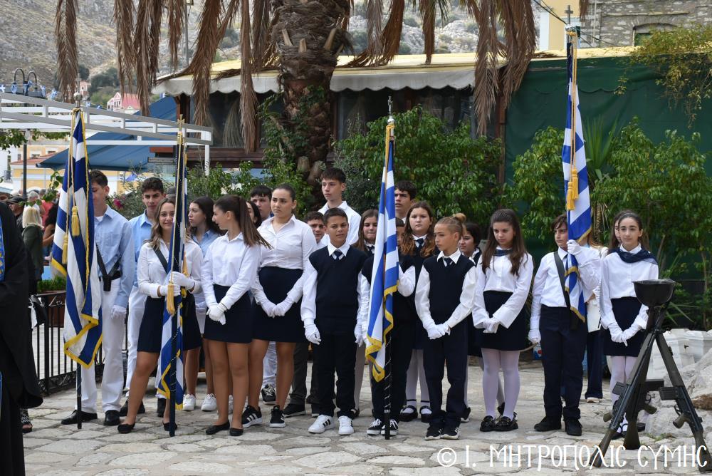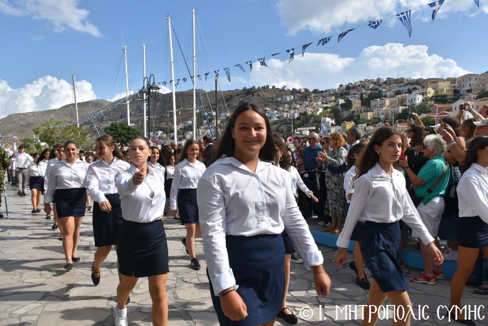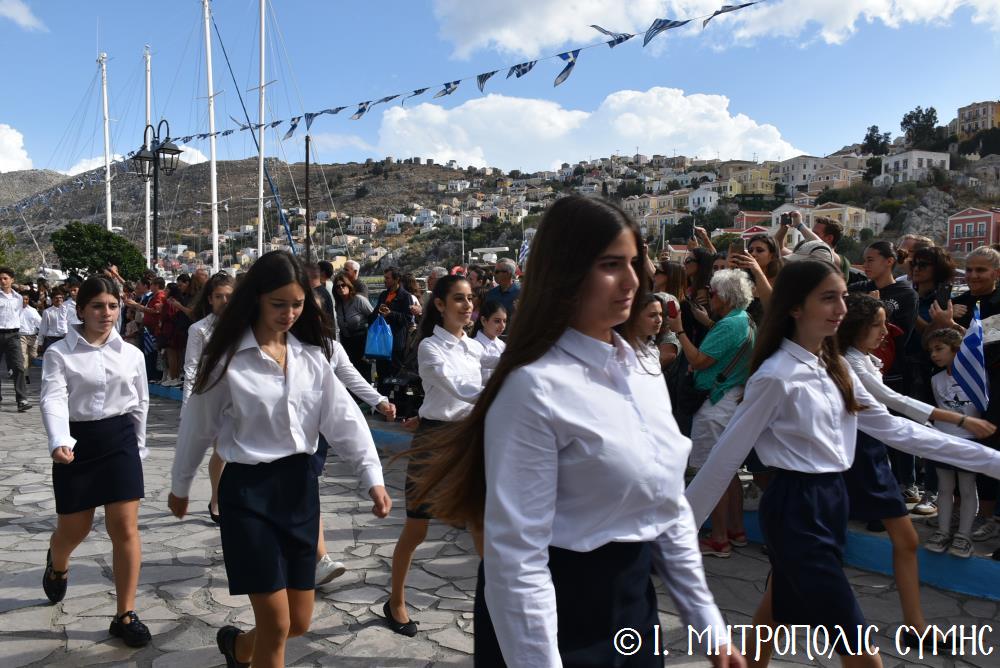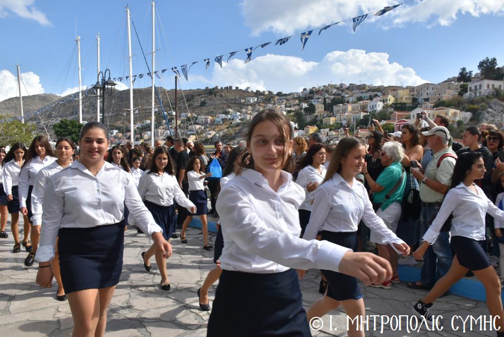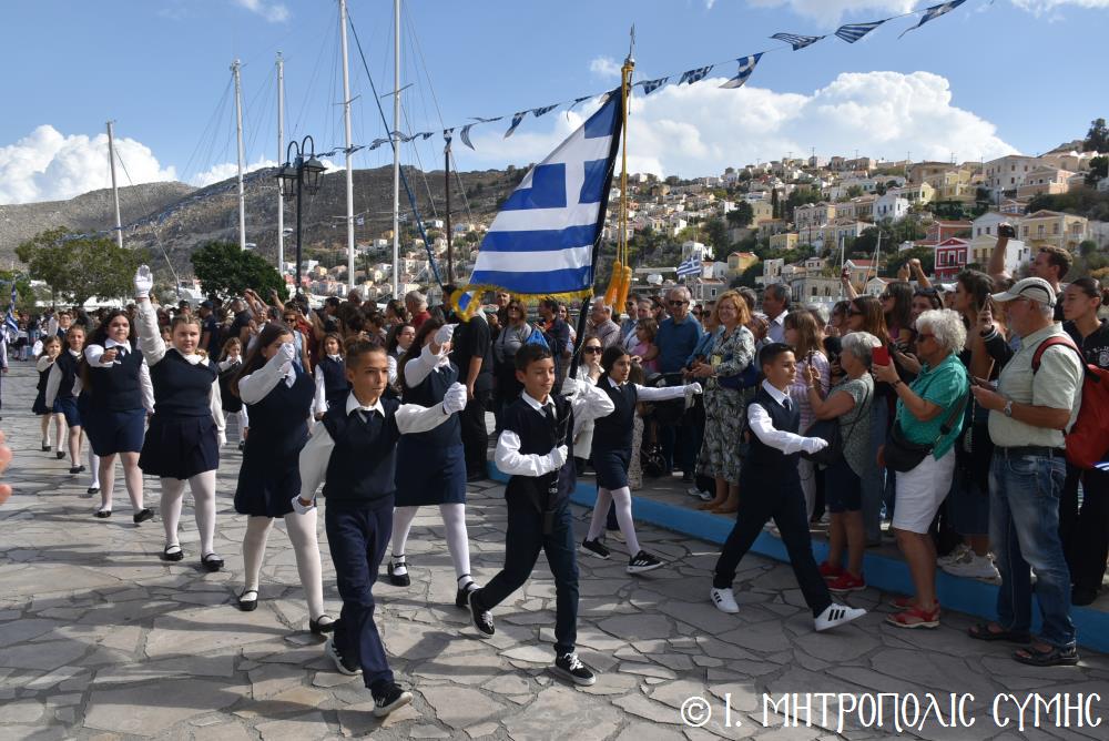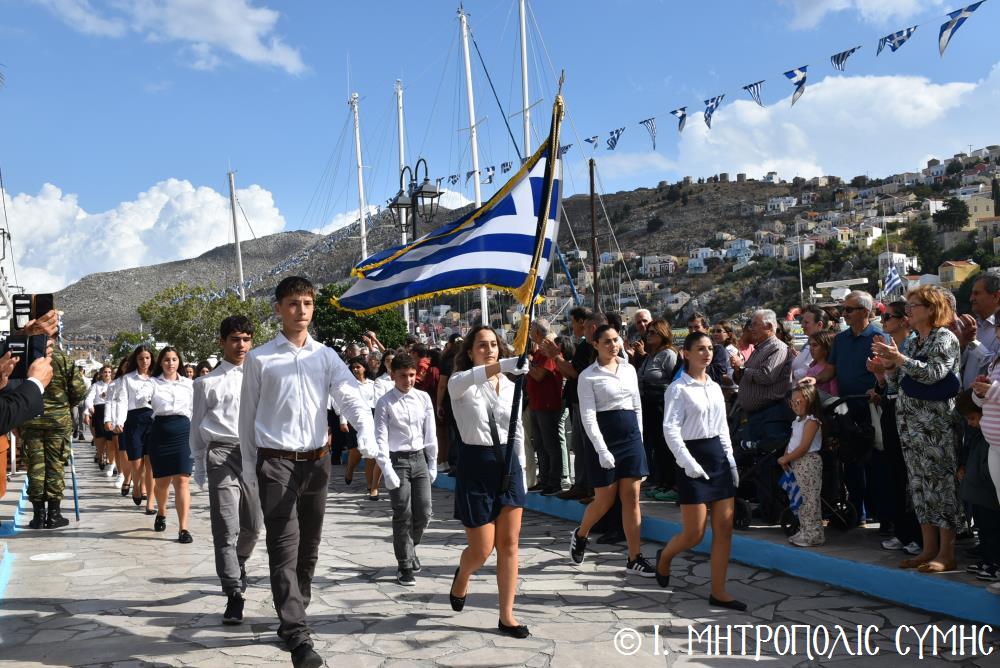 Μέ τήν δέουσα λαμπρότητα καί ἐπισημότητα ἑορτάστηκε ἡ ἐθνική ἐπέτειος τῆς 28ης Ὀκτωβρίου 1940 στήν Σύμη. Τό πρωί μετά τήν Θεία Λειτουργία ἐπί τῇ ἑορτῇ τῆς Ἁγίας Σκέπης τῆς Ὑπεραγίας Θεοτόκου ἐτελέσθη ἡ ἐπίσημη δοξολογία στόν Μητροπολιτικό Ἱ. Ναό τοῦ Τιμίου Προδρόμου, προεξάρχοντος τοῦ Σεβ. Μητροπολίτου μας κ. Χρυσοστόμου, συμπαραστατουμένου ἐκ τοῦ ἱ. Κλήρου τῆς Νήσου μας. Τόν Πανηγυρικό τῆς ἡμέρας ἐξεφώνησε ἡ Δασκάλα τοῦ Πετριδείου 2ου Δημοτικοῦ Σχολείου Σύμης, κ. Μαρία Μαλλιάκα.