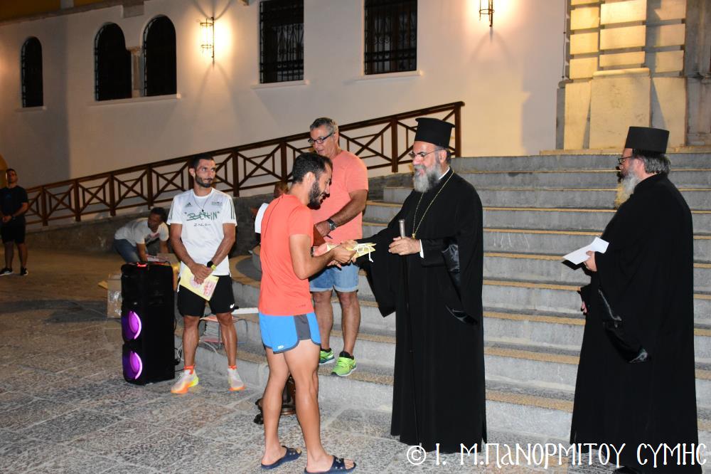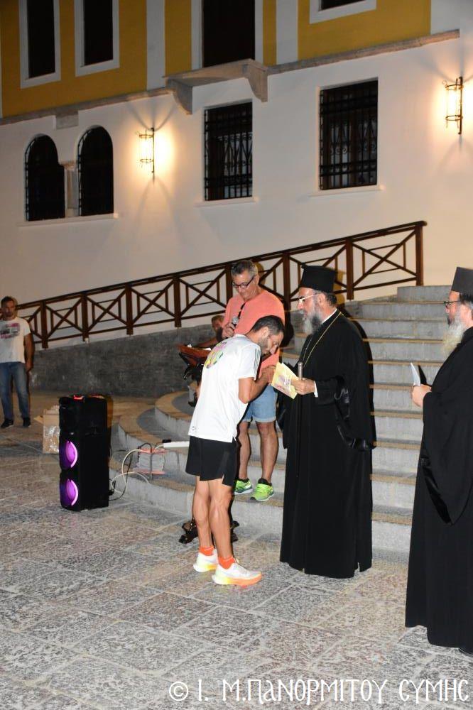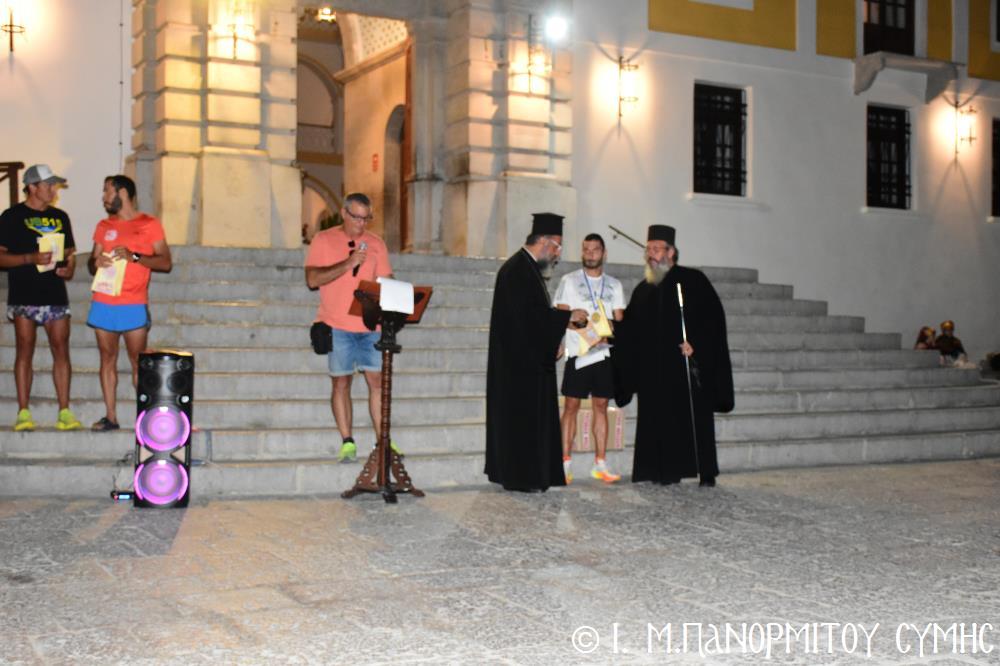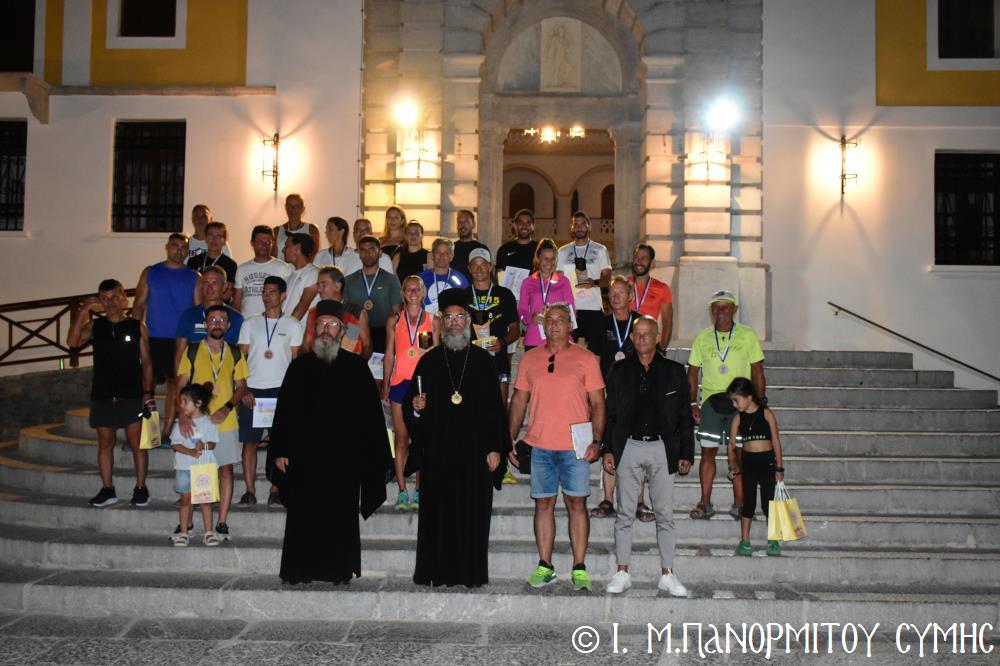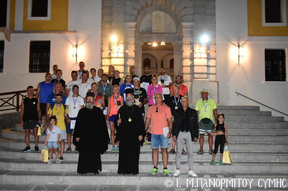 Μία ὥρα καί δεκαπέντε λεπτά ἀργότερα, τερμάτισε πρῶτος ἐμπρός στήν Πύλη τῆς Μονῆς ὁ Συμαῖος Μιχαήλ Χατζηϊωάννου καί ἀκολούθησαν οἱ συμμετέχοντες δρομεῖς 30 τόν ἀριθμό, Ἕλληνες καί Ξένοι. Ὅλοι καταχειροκροτήθηκαν, ἀπό τόν Σεβ. Μητροπολίτη μας κ. Χρυσόστομο, τόν Σεβ. Μητροπολίτη Αὐλῶνος κ. Χριστόδουλο, φιλοξενούμενο γιά λίγες ἡμέρες στήν Ἱ. Μονή, τόν Πανοσιολ. Ἡγούμενο π. Ἀντώνιο, κληρικούς τῆς Νήσου μας, τόν Ἀντιδήμαρχο κ. Νικήτα Γρύλλη, τόν Διοικητῆ Δ.Α.Ν. Σύμης Συνταγματάρχη κ. Παναγιώτη Βρανᾶ, καί ἀρκετό κόσμο πού παρευρέθη στήν ἐκδήλωση.