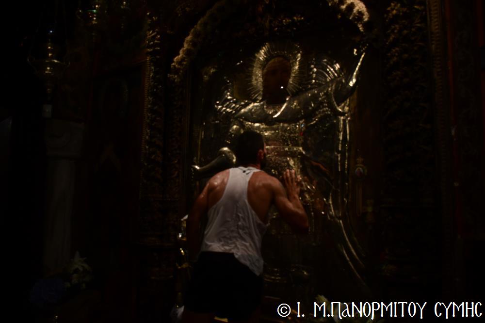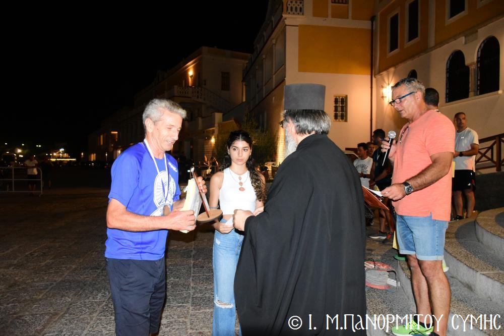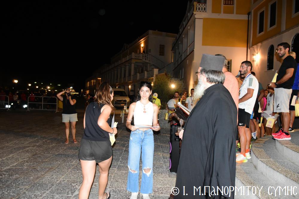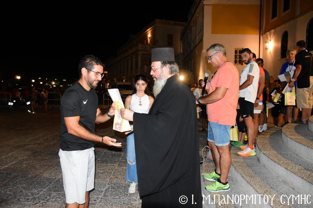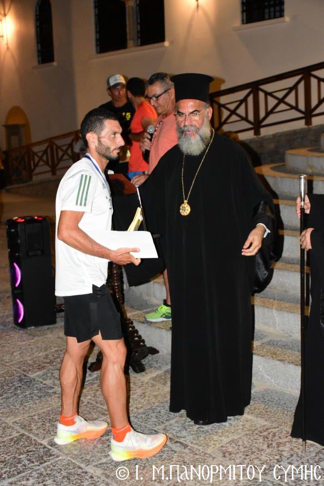 Μία ὥρα καί δεκαπέντε λεπτά ἀργότερα, τερμάτισε πρῶτος ἐμπρός στήν Πύλη τῆς Μονῆς ὁ Συμαῖος Μιχαήλ Χατζηϊωάννου καί ἀκολούθησαν οἱ συμμετέχοντες δρομεῖς 30 τόν ἀριθμό, Ἕλληνες καί Ξένοι. Ὅλοι καταχειροκροτήθηκαν, ἀπό τόν Σεβ. Μητροπολίτη μας κ. Χρυσόστομο, τόν Σεβ. Μητροπολίτη Αὐλῶνος κ. Χριστόδουλο, φιλοξενούμενο γιά λίγες ἡμέρες στήν Ἱ. Μονή, τόν Πανοσιολ. Ἡγούμενο π. Ἀντώνιο, κληρικούς τῆς Νήσου μας, τόν Ἀντιδήμαρχο κ. Νικήτα Γρύλλη, τόν Διοικητῆ Δ.Α.Ν. Σύμης Συνταγματάρχη κ. Παναγιώτη Βρανᾶ, καί ἀρκετό κόσμο πού παρευρέθη στήν ἐκδήλωση.
