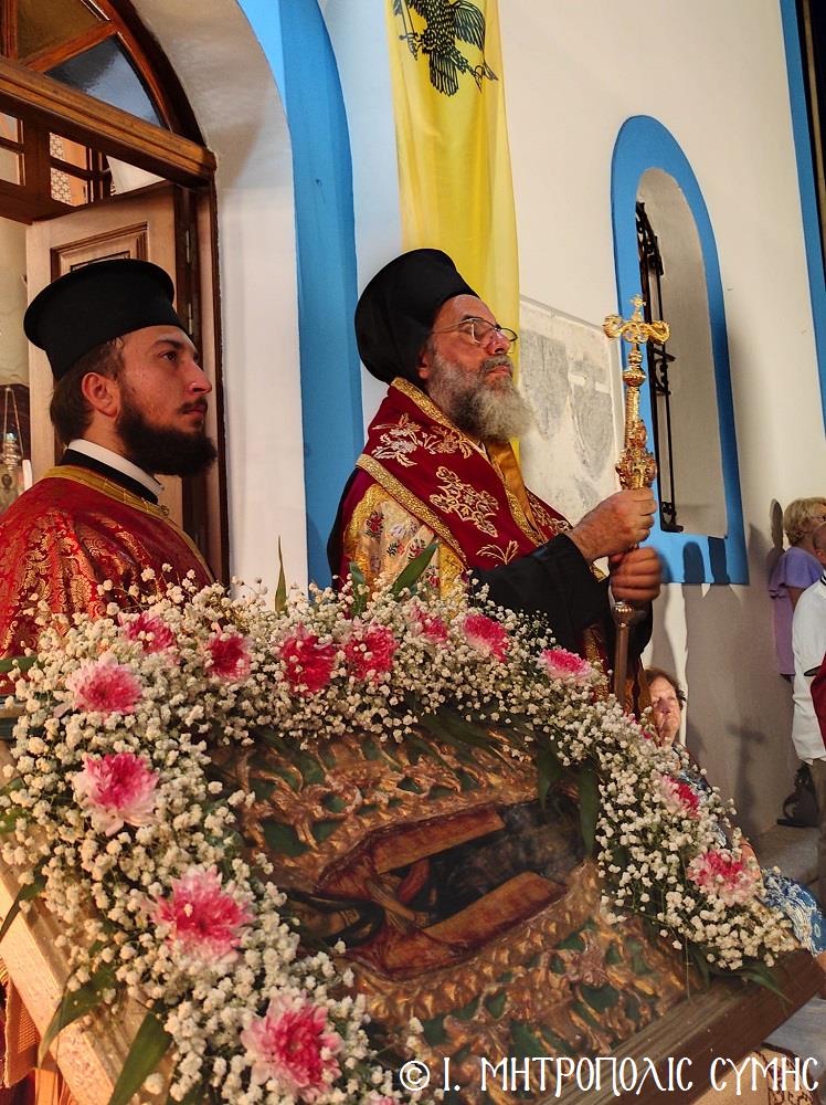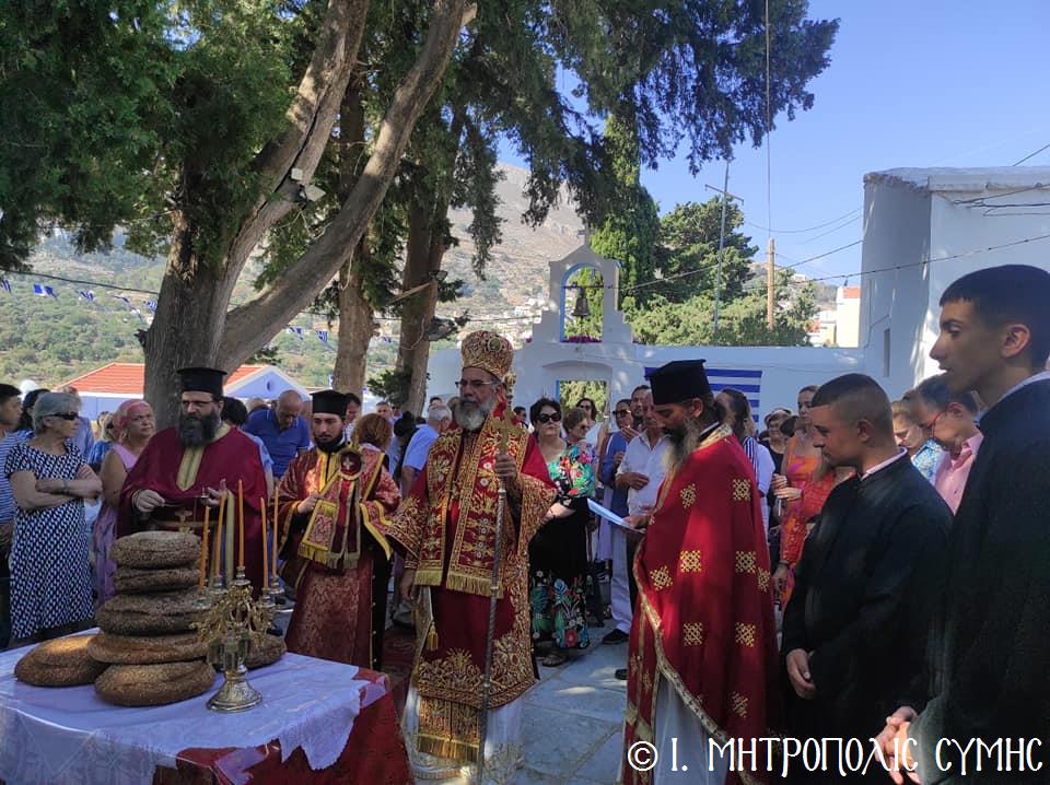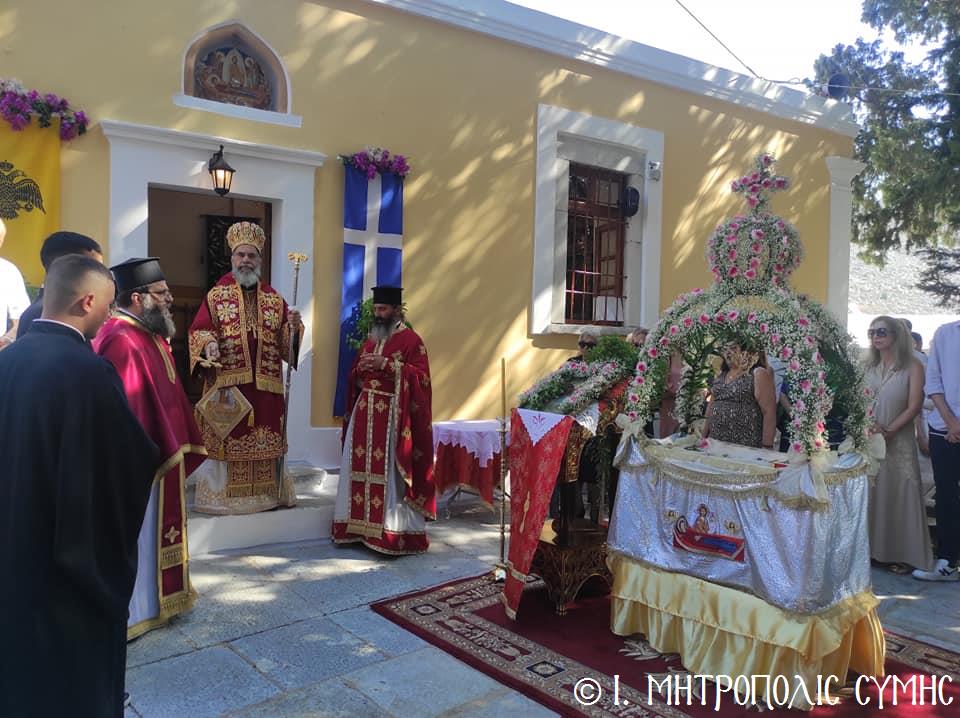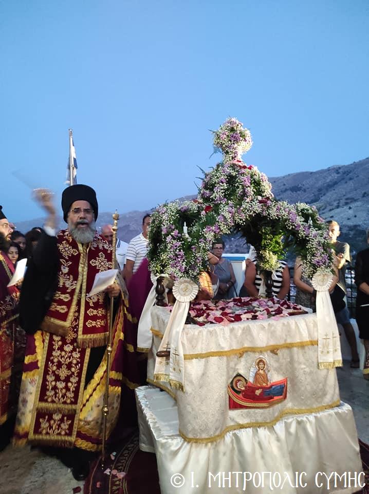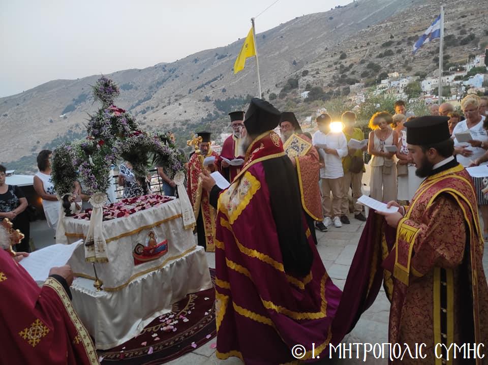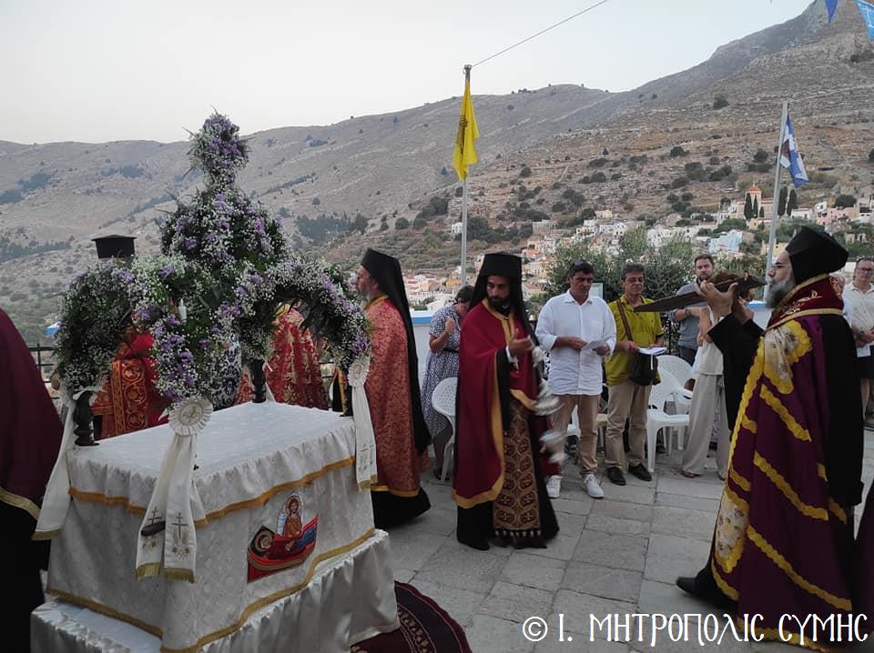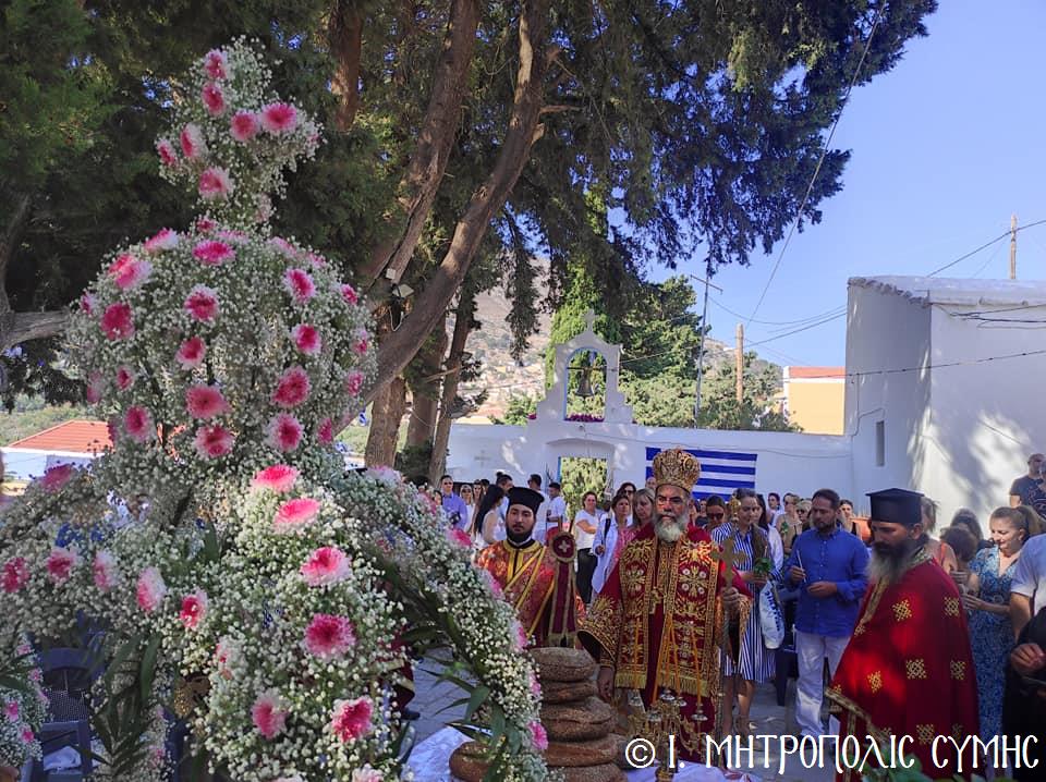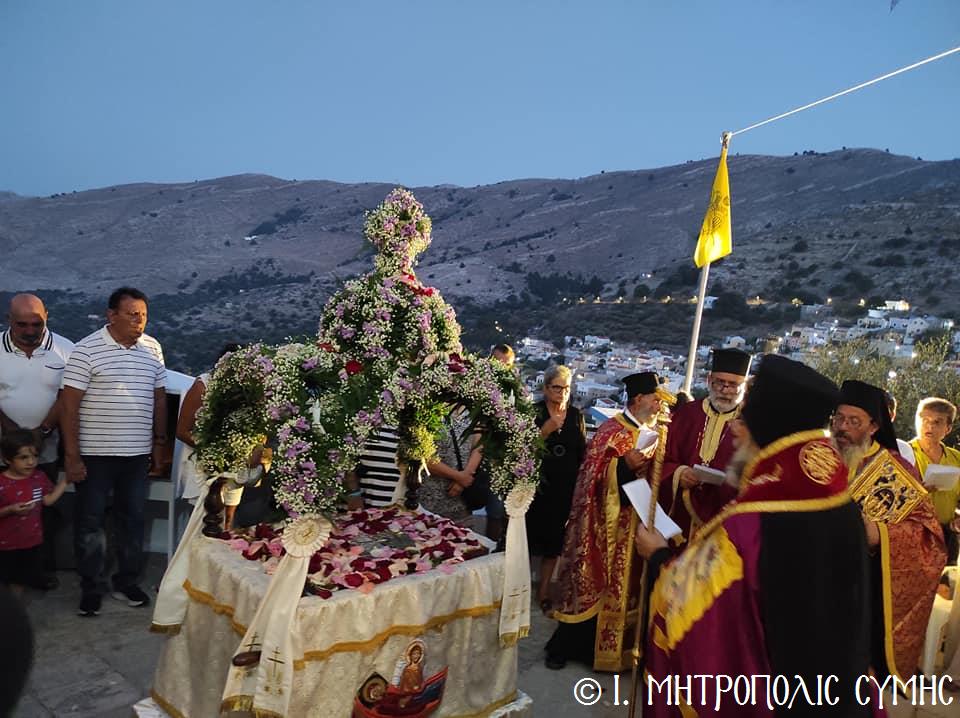Μέ μεγαλοπρέπεια καί ἰδιαίτερη λαμπρότητα πανηγύρισε καί ἐφέτος ἡ Σύμη, μαζί μέ ὅλον τόν Ὀρθόδοξο κόσμο, τήν Ἑορτή τῆς Κοιμήσεως τῆς Ὑπεραγίας Θεοτόκου τῆς Ἐφόρου καί Προστάτιδος τοῦ Γένους μας. Πλῆθος πιστῶν συνέρρευσε ὅλες τίς ἡμέρες τοῦ Δεκαπενταυγούστου στίς γραφικές ἐκκλησίες καί τά ἀπέριττα ἐξωκκλήσια τοῦ νησιοῦ μας, πού εἶναι ἀφιερωμένα στήν Χάρη Της, γιά νά ὑμνήσει καί νά δοξάσει τήν Μεγάλη Μητέρα, τό στήριγμα καί τήν καταφυγή τῶν ψυχῶν μας, ἐπιβεβαιώνοντας γιά μία ἀκόμα φορά τήν βαθιά πίστη τοῦ Ἕλληνα, τήν πίστη πού τόν στήριξε σέ κάθε δύσκολη στιγμή καί τόν βοήθησε νά ἀντιμετωπίσει καί νά ξεπεράσει μέ τρόπο θαυμαστό δυσκολίες καί ἐμπόδια, κατ’ ἄνθρωπον, ἀνυπέρβλητα.