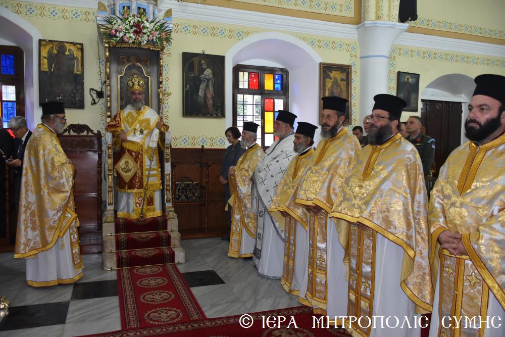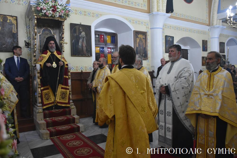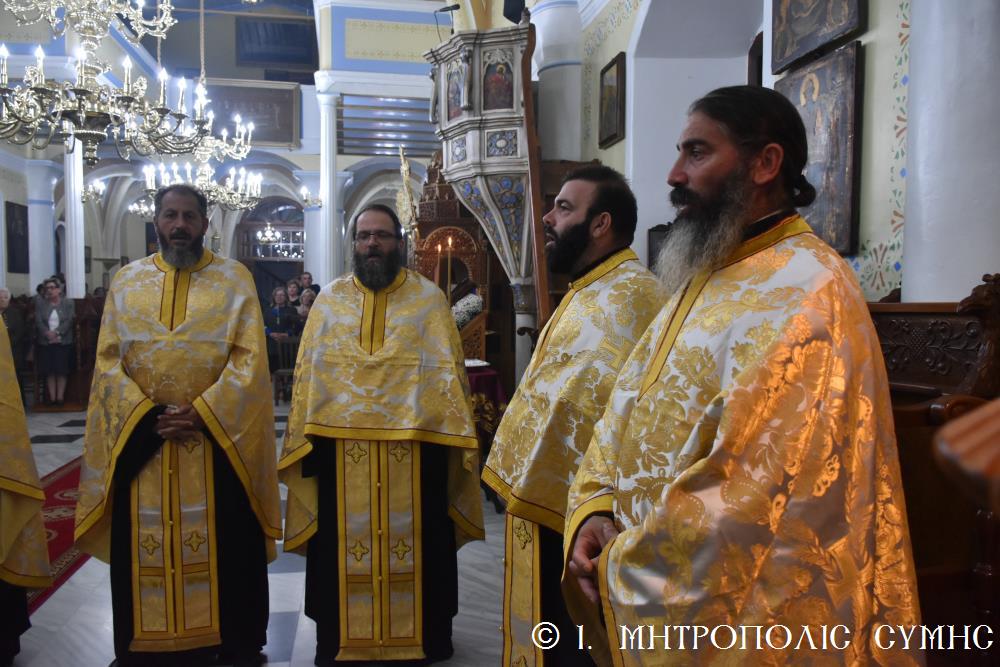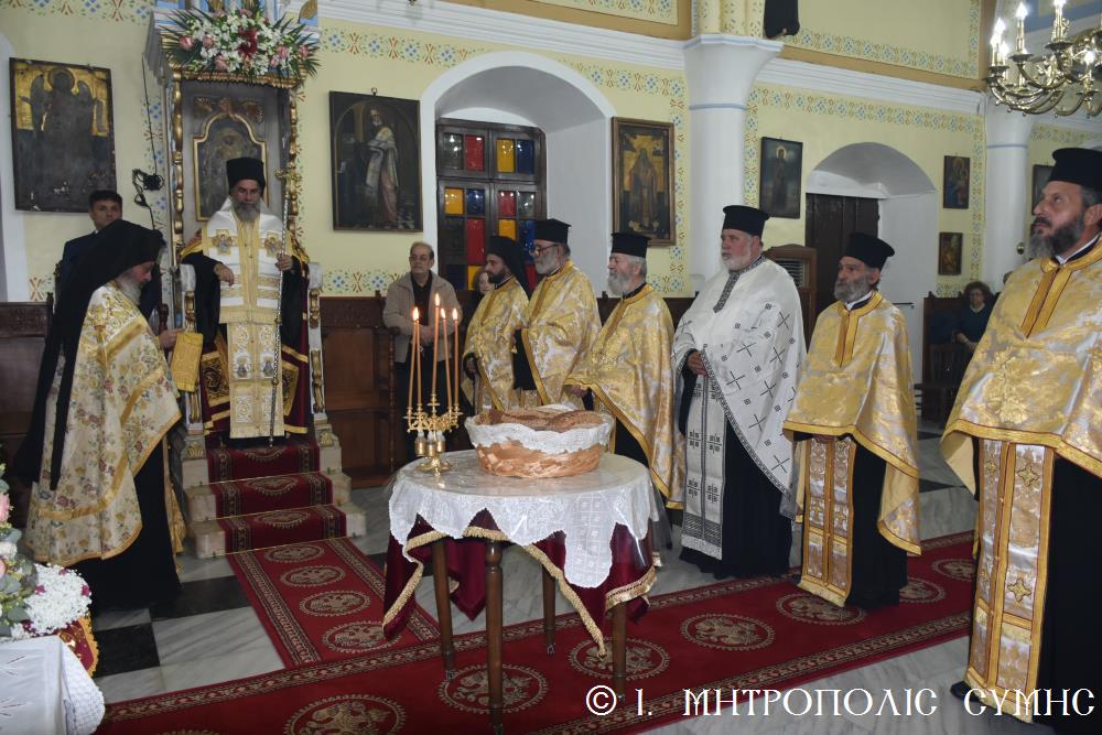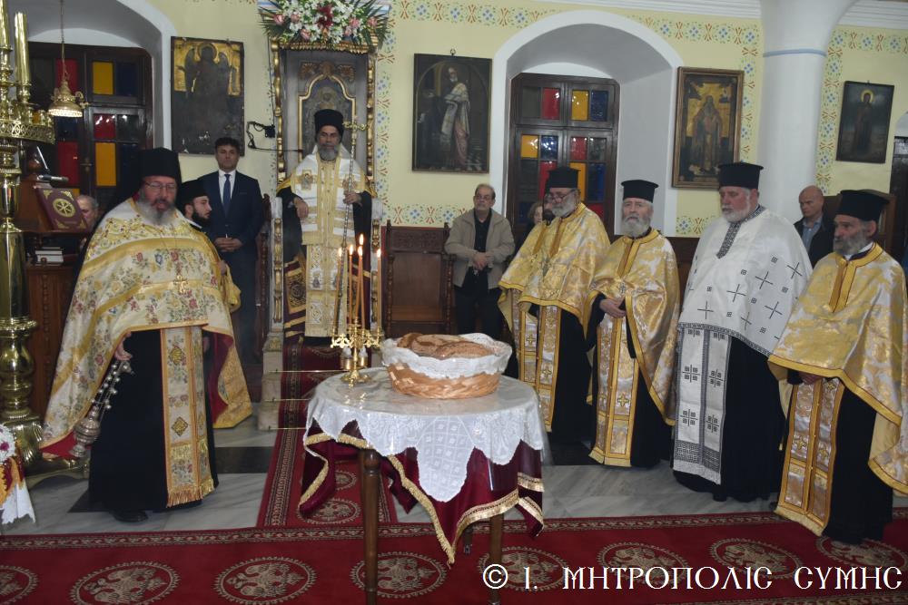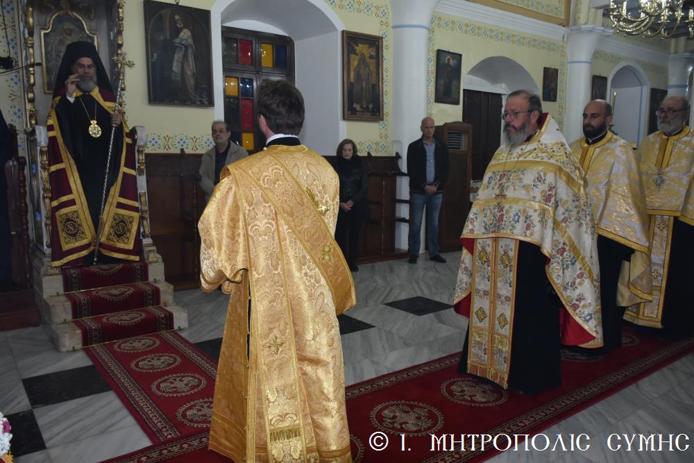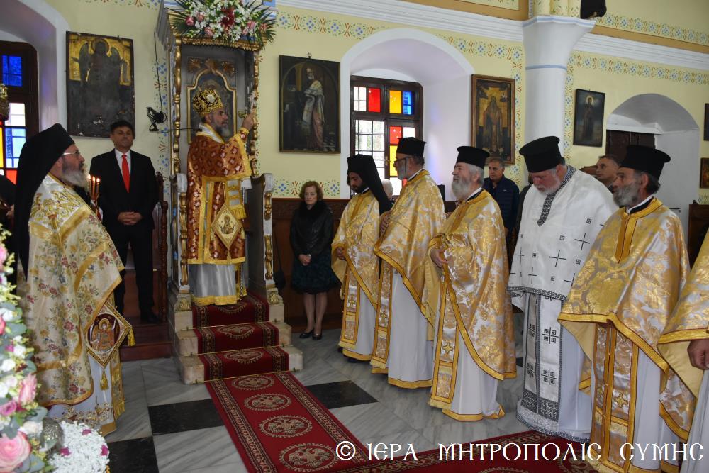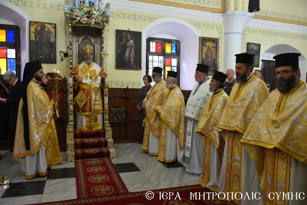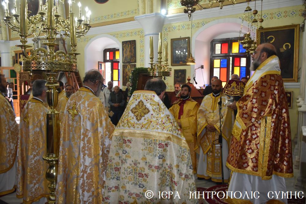 Σήμερα τό πρωΐ, Δευτέρα 13η Νοεμβρίου, κυριώνυμη ἡμέρα τῆς ἑορτῆς, ὁ Σεβ. Μητροπολίτης μας κ. Χρυσόστομος, χοροστάτησε στόν Ὄρθρο καί τέλεσε τήν Θ. Λειτουργία ὁμοίως στόν Ἱερό Μητροπολιτικό Ναό τοῦ Τιμίου Προδρόμου Σύμης μέ συλλειτουργούς του τόν Πανοσιολ. Καθηγούμενο τῆς Ἱ. Μονῆς Πανορμίτου Ἀρχιμ. Ἀντώνιο Πατρό, τόν Πανοσιολ. 'Αρχιμανδρίτη π. 'Ανδρέα Δημητρίου, τόν Γενικό Ἀρχιερατικό Ἐπίτροπο καί Ἐφημέριο τοῦ Μητροπολιτικοῦ Ναοῦ Πρωτοπρ. Στέφανο Μακρῆ, τόν Οἰκονόμον π. Χρῆστο Σταθόπουλο καί τούς Πρεσβ. π. Ἐμμανουήλ Λυκοπάντη, Συμαῖο τήν καταγωγή, κληρικό τῆς Ἱ. Ἀρχιεπισκοπῆς Αὐστραλίας, τόν π. Παντελεήμονα Μακρόπουλο, τόν π. Γεώργιο Χατζηχρυσάφη, τόν π. Ἀντώνιο Μανιᾶ, τόν π. Φιλόθεο Κάλφα, τόν π. Γεώργιο Κακακιό καί τόν Ἱεροδιάκονον π. Παῦλο Τερεζάκη. Ξεχωριστές παρουσίες ἦταν τοῦ Δημάρχου Σύμης κ. Ἐλευθερίου Παπακαλοδούκα, τῆς Προέδρου τοῦ Δ. Σ. κ. Σεβαστῆς Λούπη, τοῦ Ἀντιδημάρχου Σύμης κ. Νικήτα Γρύλλη, τοῦ Διοικητοῦ τοῦ 549 Τ.Ε. Ἀντισυνταγματάρχη κ. Στυλιανοῦ Φωκᾶ, τῆς Προέδρου τῆς Ἑνώσεως Γυναικῶν Σύμης κ. Σεβαστῆς Νικόλη καί τῶν ἐκπροσώπων τῶν λοιπῶν τοπικῶν Ἀρχῶν, Φορέων καί Συλλόγων.