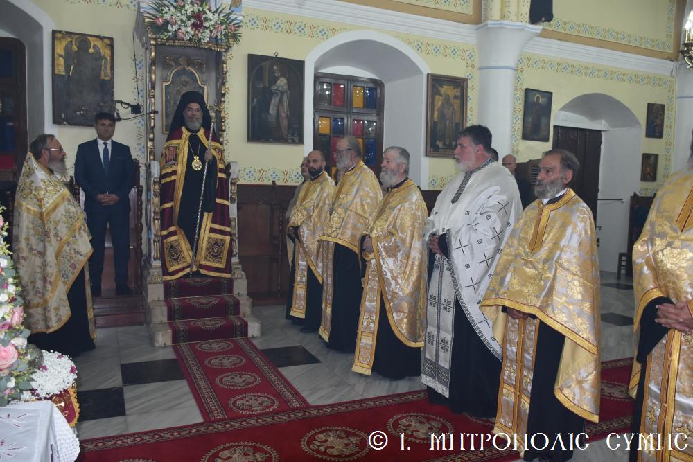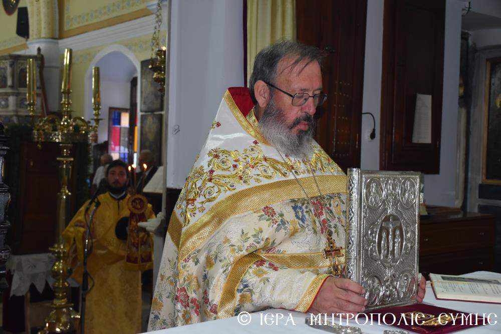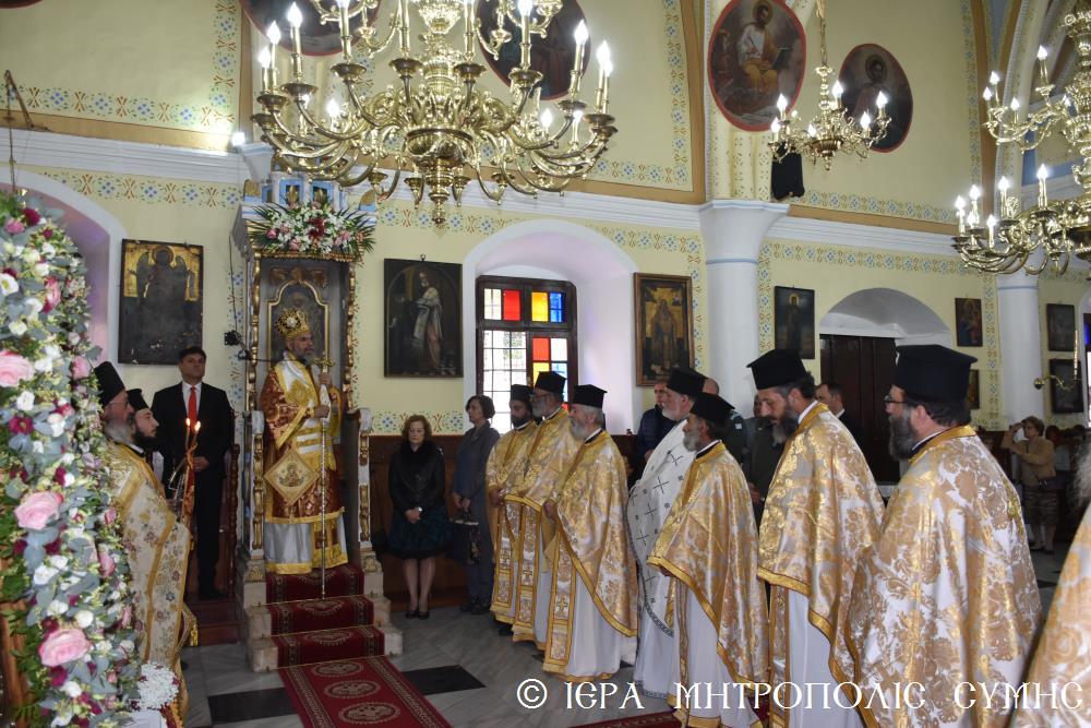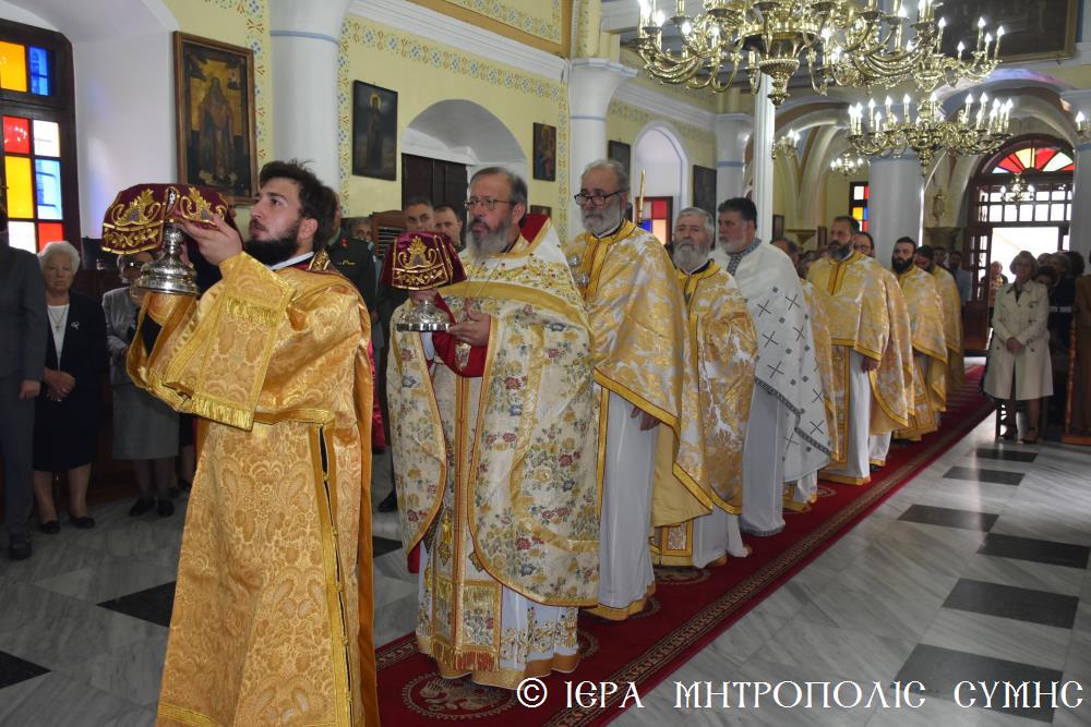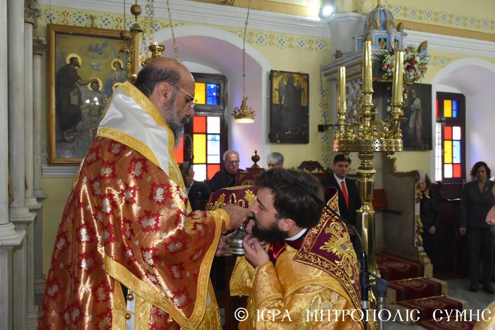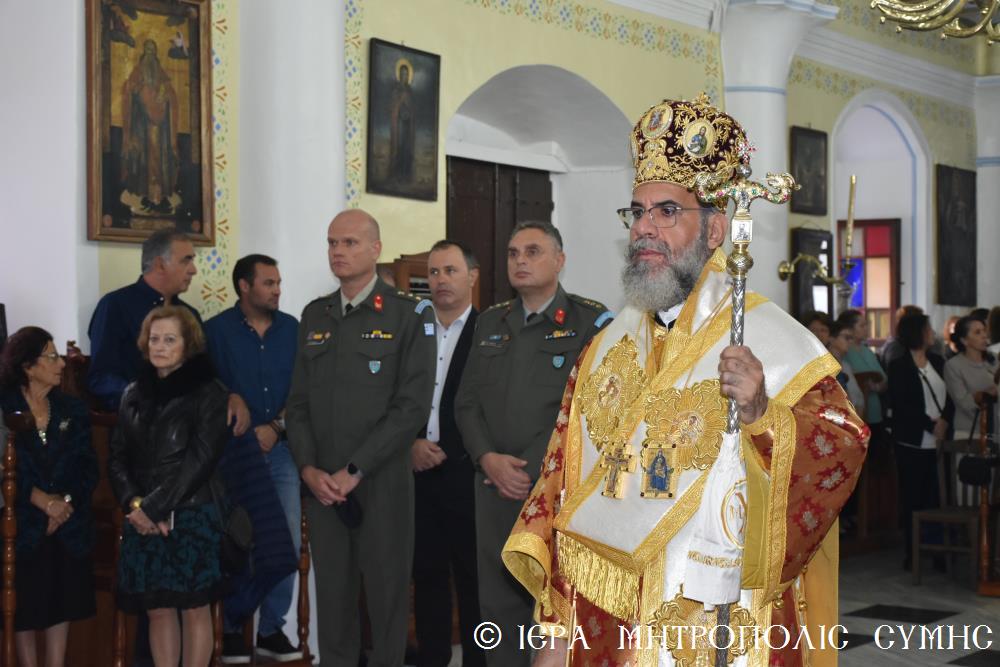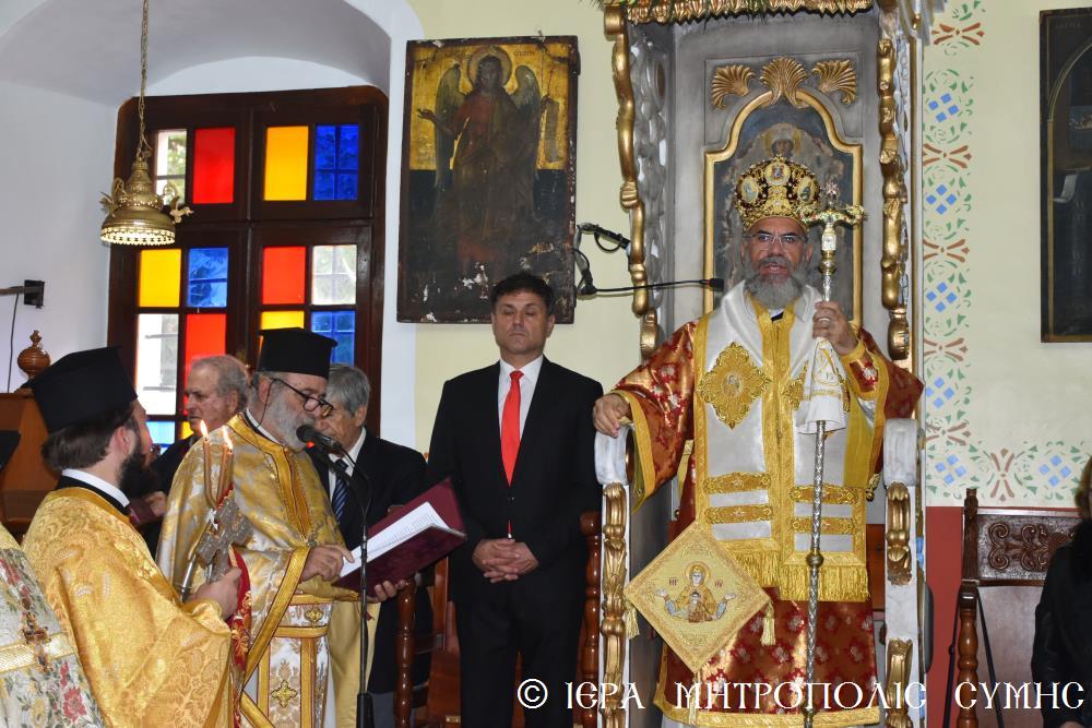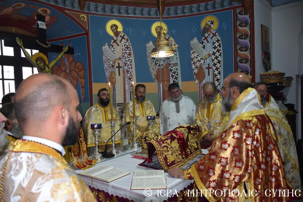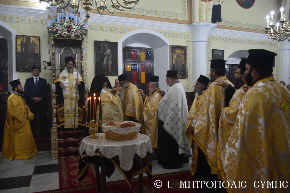 Σήμερα τό πρωΐ, Δευτέρα 13η Νοεμβρίου, κυριώνυμη ἡμέρα τῆς ἑορτῆς, ὁ Σεβ. Μητροπολίτης μας κ. Χρυσόστομος, χοροστάτησε στόν Ὄρθρο καί τέλεσε τήν Θ. Λειτουργία ὁμοίως στόν Ἱερό Μητροπολιτικό Ναό τοῦ Τιμίου Προδρόμου Σύμης μέ συλλειτουργούς του τόν Πανοσιολ. Καθηγούμενο τῆς Ἱ. Μονῆς Πανορμίτου Ἀρχιμ. Ἀντώνιο Πατρό, τόν Πανοσιολ. 'Αρχιμανδρίτη π. 'Ανδρέα Δημητρίου, τόν Γενικό Ἀρχιερατικό Ἐπίτροπο καί Ἐφημέριο τοῦ Μητροπολιτικοῦ Ναοῦ Πρωτοπρ. Στέφανο Μακρῆ, τόν Οἰκονόμον π. Χρῆστο Σταθόπουλο καί τούς Πρεσβ. π. Ἐμμανουήλ Λυκοπάντη, Συμαῖο τήν καταγωγή, κληρικό τῆς Ἱ. Ἀρχιεπισκοπῆς Αὐστραλίας, τόν π. Παντελεήμονα Μακρόπουλο, τόν π. Γεώργιο Χατζηχρυσάφη, τόν π. Ἀντώνιο Μανιᾶ, τόν π. Φιλόθεο Κάλφα, τόν π. Γεώργιο Κακακιό καί τόν Ἱεροδιάκονον π. Παῦλο Τερεζάκη. Ξεχωριστές παρουσίες ἦταν τοῦ Δημάρχου Σύμης κ. Ἐλευθερίου Παπακαλοδούκα, τῆς Προέδρου τοῦ Δ. Σ. κ. Σεβαστῆς Λούπη, τοῦ Ἀντιδημάρχου Σύμης κ. Νικήτα Γρύλλη, τοῦ Διοικητοῦ τοῦ 549 Τ.Ε. Ἀντισυνταγματάρχη κ. Στυλιανοῦ Φωκᾶ, τῆς Προέδρου τῆς Ἑνώσεως Γυναικῶν Σύμης κ. Σεβαστῆς Νικόλη καί τῶν ἐκπροσώπων τῶν λοιπῶν τοπικῶν Ἀρχῶν, Φορέων καί Συλλόγων.