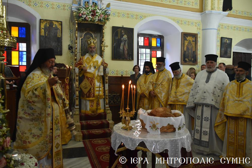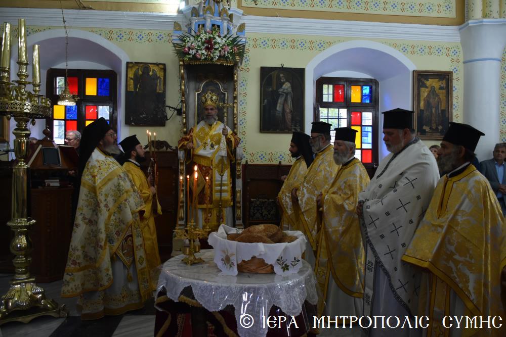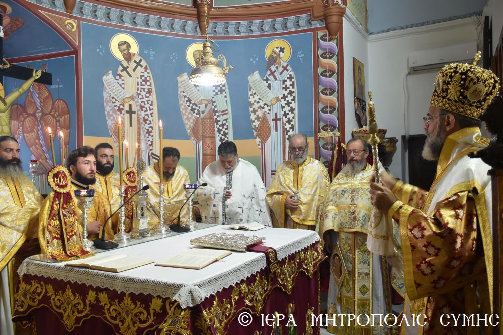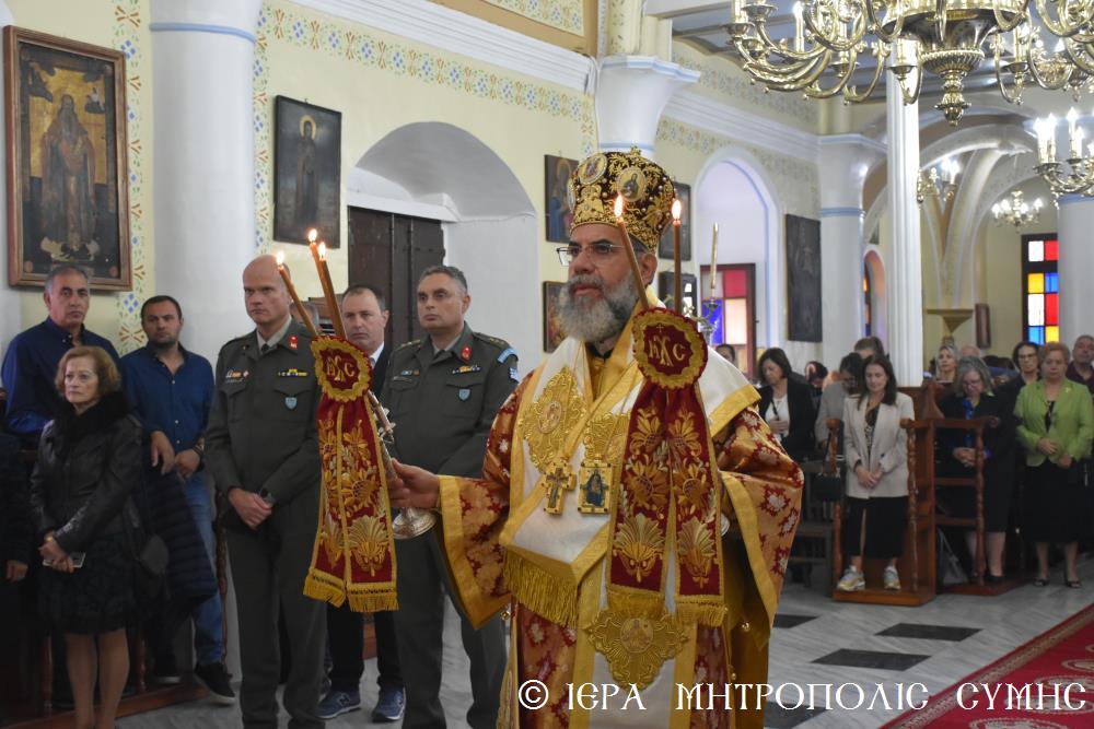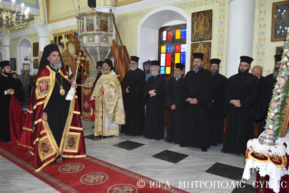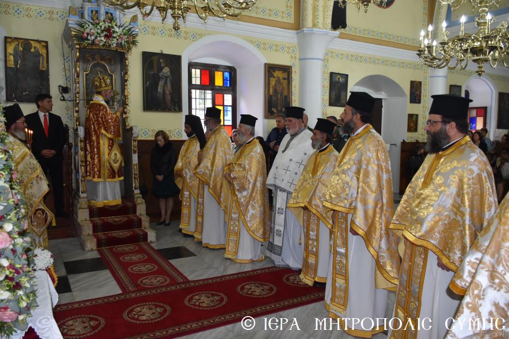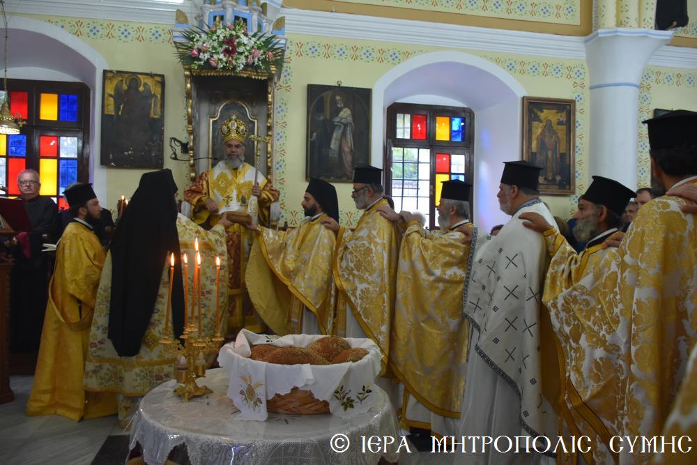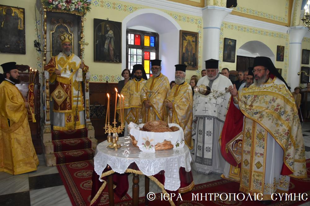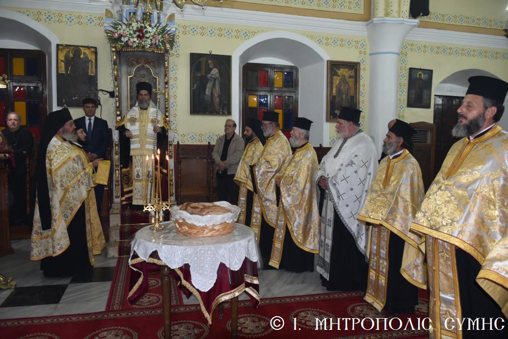Σήμερα τό πρωΐ, Δευτέρα 13η Νοεμβρίου, κυριώνυμη ἡμέρα τῆς ἑορτῆς, ὁ Σεβ. Μητροπολίτης μας κ. Χρυσόστομος, χοροστάτησε στόν Ὄρθρο καί τέλεσε τήν Θ. Λειτουργία ὁμοίως στόν Ἱερό Μητροπολιτικό Ναό τοῦ Τιμίου Προδρόμου Σύμης μέ συλλειτουργούς του τόν Πανοσιολ. Καθηγούμενο τῆς Ἱ. Μονῆς Πανορμίτου Ἀρχιμ. Ἀντώνιο Πατρό, τόν Πανοσιολ. 'Αρχιμανδρίτη π. 'Ανδρέα Δημητρίου, τόν Γενικό Ἀρχιερατικό Ἐπίτροπο καί Ἐφημέριο τοῦ Μητροπολιτικοῦ Ναοῦ Πρωτοπρ. Στέφανο Μακρῆ, τόν Οἰκονόμον π. Χρῆστο Σταθόπουλο καί τούς Πρεσβ. π. Ἐμμανουήλ Λυκοπάντη, Συμαῖο τήν καταγωγή, κληρικό τῆς Ἱ. Ἀρχιεπισκοπῆς Αὐστραλίας, τόν π. Παντελεήμονα Μακρόπουλο, τόν π. Γεώργιο Χατζηχρυσάφη, τόν π. Ἀντώνιο Μανιᾶ, τόν π. Φιλόθεο Κάλφα, τόν π. Γεώργιο Κακακιό καί τόν Ἱεροδιάκονον π. Παῦλο Τερεζάκη. Ξεχωριστές παρουσίες ἦταν τοῦ Δημάρχου Σύμης κ. Ἐλευθερίου Παπακαλοδούκα, τῆς Προέδρου τοῦ Δ. Σ. κ. Σεβαστῆς Λούπη, τοῦ Ἀντιδημάρχου Σύμης κ. Νικήτα Γρύλλη, τοῦ Διοικητοῦ τοῦ 549 Τ.Ε. Ἀντισυνταγματάρχη κ. Στυλιανοῦ Φωκᾶ, τῆς Προέδρου τῆς Ἑνώσεως Γυναικῶν Σύμης κ. Σεβαστῆς Νικόλη καί τῶν ἐκπροσώπων τῶν λοιπῶν τοπικῶν Ἀρχῶν, Φορέων καί Συλλόγων.
