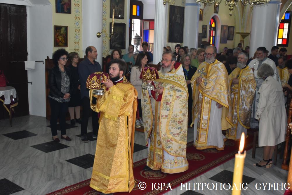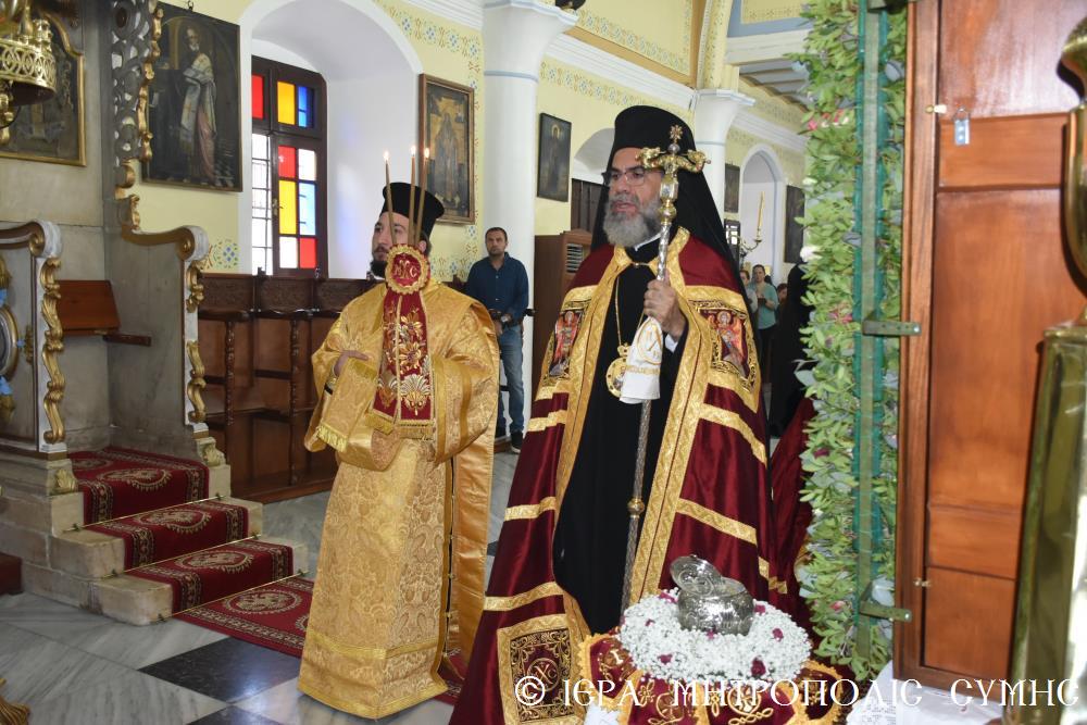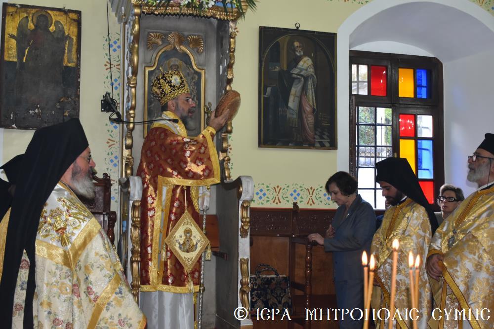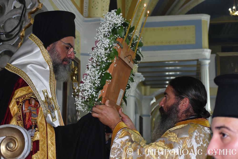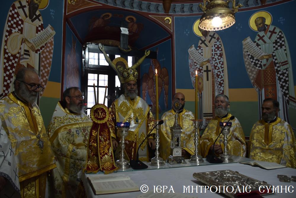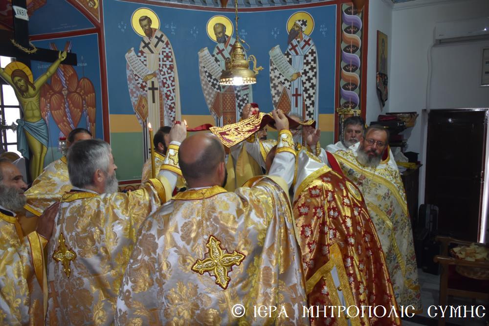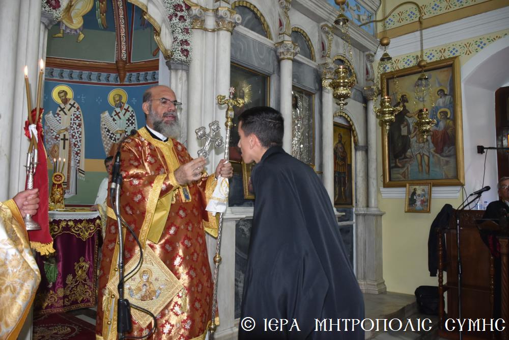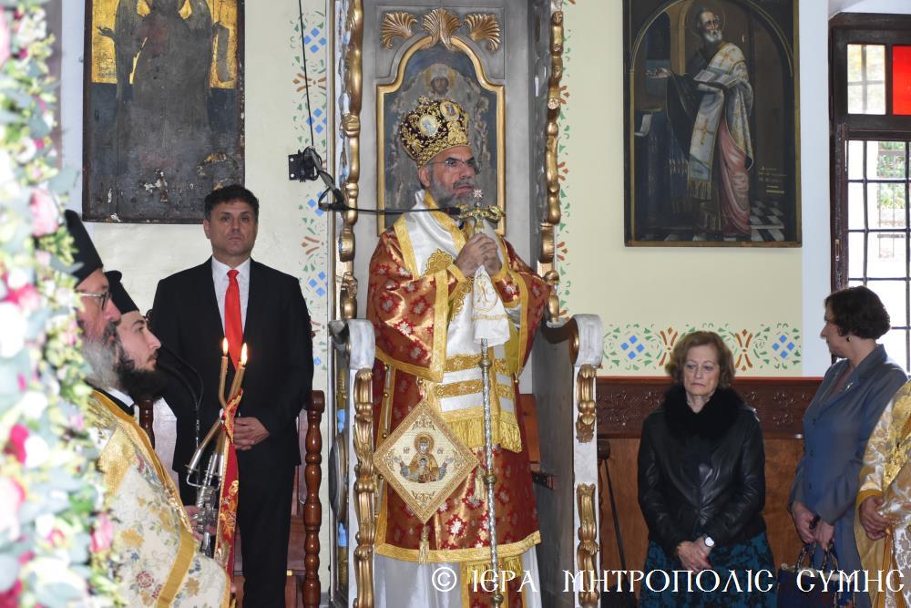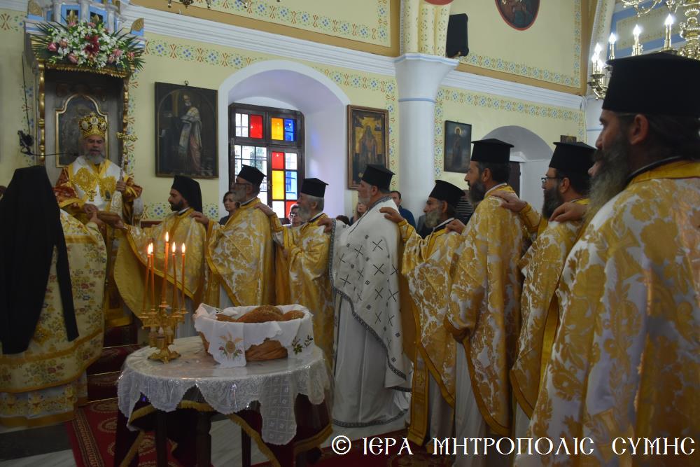 Σήμερα τό πρωΐ, Δευτέρα 13η Νοεμβρίου, κυριώνυμη ἡμέρα τῆς ἑορτῆς, ὁ Σεβ. Μητροπολίτης μας κ. Χρυσόστομος, χοροστάτησε στόν Ὄρθρο καί τέλεσε τήν Θ. Λειτουργία ὁμοίως στόν Ἱερό Μητροπολιτικό Ναό τοῦ Τιμίου Προδρόμου Σύμης μέ συλλειτουργούς του τόν Πανοσιολ. Καθηγούμενο τῆς Ἱ. Μονῆς Πανορμίτου Ἀρχιμ. Ἀντώνιο Πατρό, τόν Πανοσιολ. 'Αρχιμανδρίτη π. 'Ανδρέα Δημητρίου, τόν Γενικό Ἀρχιερατικό Ἐπίτροπο καί Ἐφημέριο τοῦ Μητροπολιτικοῦ Ναοῦ Πρωτοπρ. Στέφανο Μακρῆ, τόν Οἰκονόμον π. Χρῆστο Σταθόπουλο καί τούς Πρεσβ. π. Ἐμμανουήλ Λυκοπάντη, Συμαῖο τήν καταγωγή, κληρικό τῆς Ἱ. Ἀρχιεπισκοπῆς Αὐστραλίας, τόν π. Παντελεήμονα Μακρόπουλο, τόν π. Γεώργιο Χατζηχρυσάφη, τόν π. Ἀντώνιο Μανιᾶ, τόν π. Φιλόθεο Κάλφα, τόν π. Γεώργιο Κακακιό καί τόν Ἱεροδιάκονον π. Παῦλο Τερεζάκη. Ξεχωριστές παρουσίες ἦταν τοῦ Δημάρχου Σύμης κ. Ἐλευθερίου Παπακαλοδούκα, τῆς Προέδρου τοῦ Δ. Σ. κ. Σεβαστῆς Λούπη, τοῦ Ἀντιδημάρχου Σύμης κ. Νικήτα Γρύλλη, τοῦ Διοικητοῦ τοῦ 549 Τ.Ε. Ἀντισυνταγματάρχη κ. Στυλιανοῦ Φωκᾶ, τῆς Προέδρου τῆς Ἑνώσεως Γυναικῶν Σύμης κ. Σεβαστῆς Νικόλη καί τῶν ἐκπροσώπων τῶν λοιπῶν τοπικῶν Ἀρχῶν, Φορέων καί Συλλόγων.