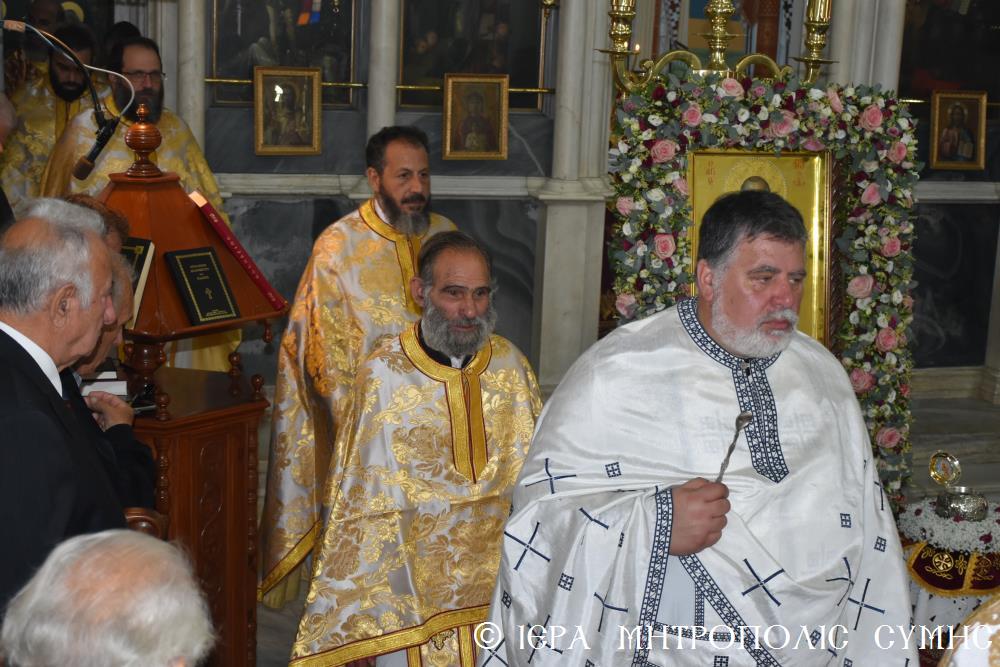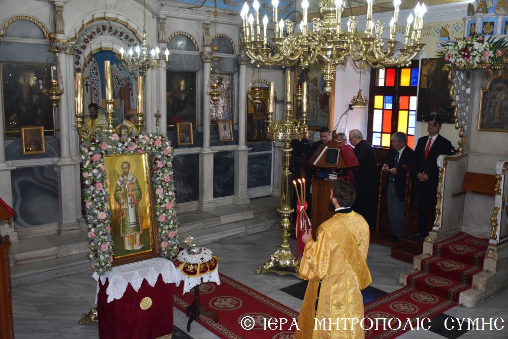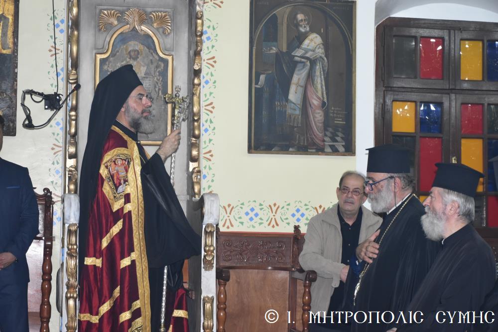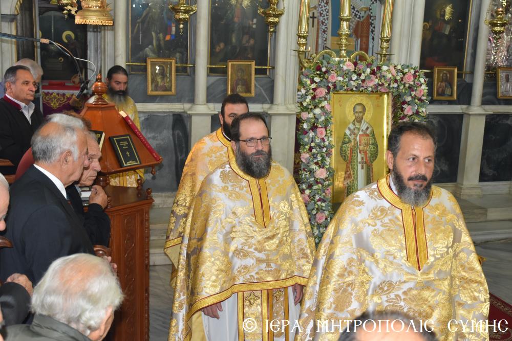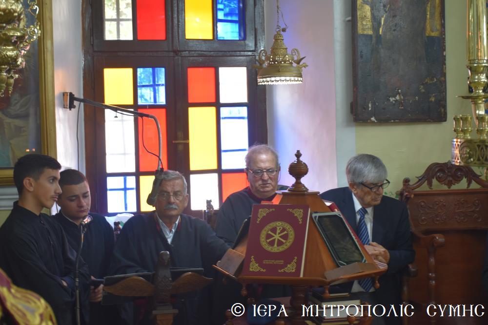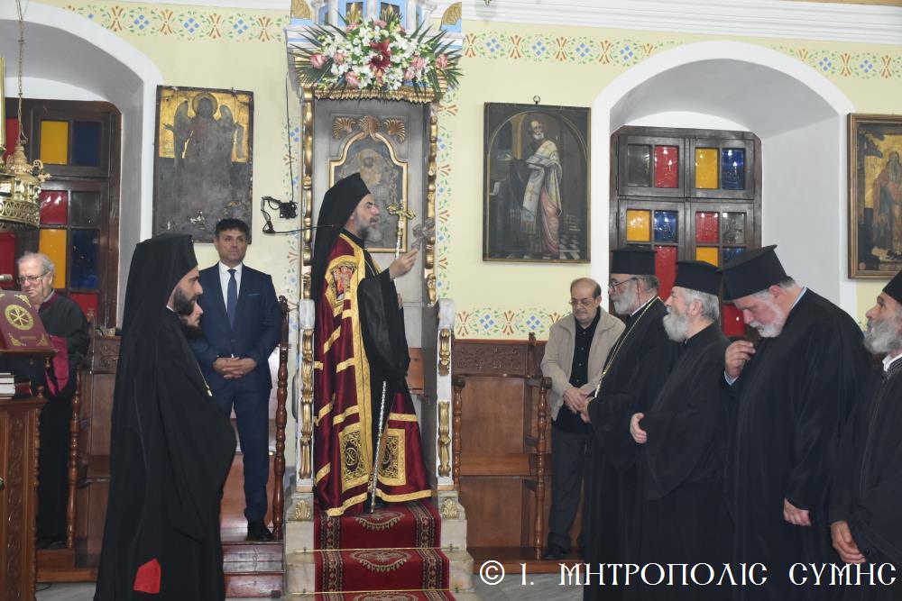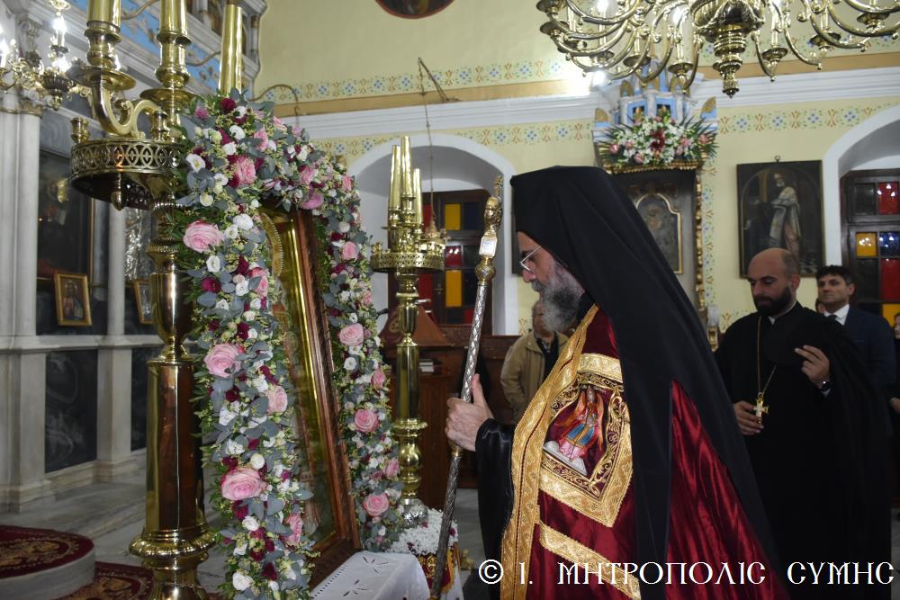 Τό ἑσπέρας τῆς Κυριακῆς 12ης Νοεμβρίου 2023, ἐτελέσθη ὁ Μέγας Πανηγυρικός Ἑσπερινός, χοροστατούντος τοῦ Σεβασμιωτάτου, πλαισιουμένου ὑπό τοῦ Ἱεροῦ κλήρου τῆς Νήσου μας. Τά δέ ἀναλόγια διακόνησαν γλυκυφθόγγως δεξιά, ὁ Πρωτοψάλτης τοῦ Μητροπολιτικοῦ Ναοῦ κ. Δημοσθένης Γιανναρᾶς καί ὁ Πρωτοψάλτης τῆς Ἱ. Μονῆς Πανορμίτου κ. Σταῦρος Πίλιουρας καί ἀριστερά οἱ Ἱεροψάλτες κ. Ἐλευθέριος Ξηράκης, κ. Ἀγαπητός Μιχελλής καί κ. Πανορμίτης Κακακιός. Μεταξύ τῶν συμμετεχόντων πιστῶν, παρέστησαν ὁ Δήμαρχος Σύμης κ. Ἐλευθέριος Παπακαλοδούκας, ὁ Διοικητής τοῦ 549 Τ.Ε. Σύμης Ἀντισυνταγματάρχης κ. Στυλιανός Φωκᾶς καί ἡ Πρόεδρος τῆς Ἑνώσεως Γυναικῶν Σύμης κ. Σεβαστή Νικόλη. Μετά τήν ἀπόλυση, οἱ συμμετέχοντες κληρικοί καί λαϊκοί ἀνέβηκαν στό παρακείμενο Ἀρχονταρίκι τοῦ Ναοῦ, ὅπου ἕκαστος εὐχήθη στόν ἑορτάζοντα Μητροπολίτη μας καί ἐδέχθη τά ἑόρτια κεράσματα.