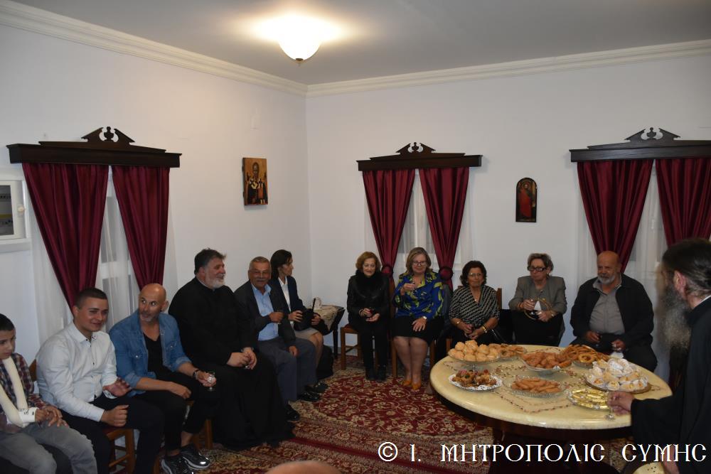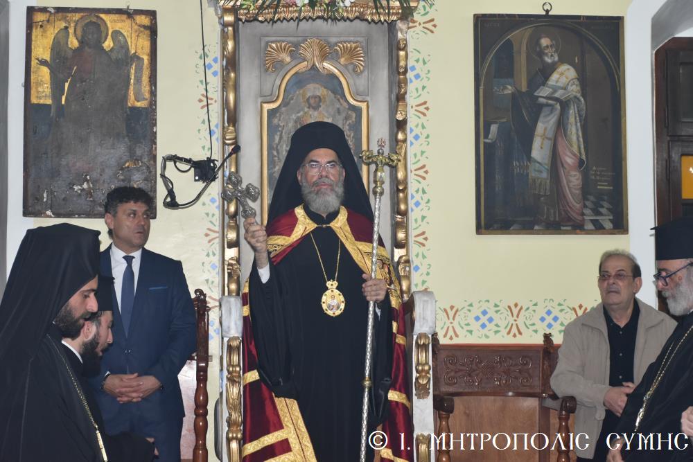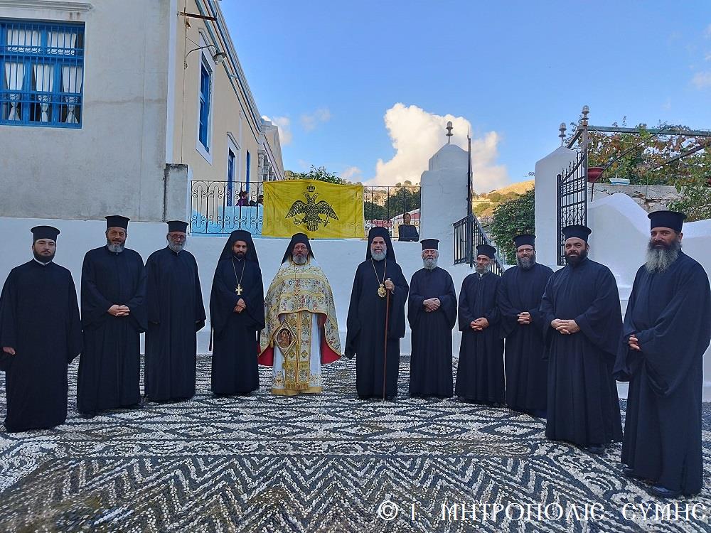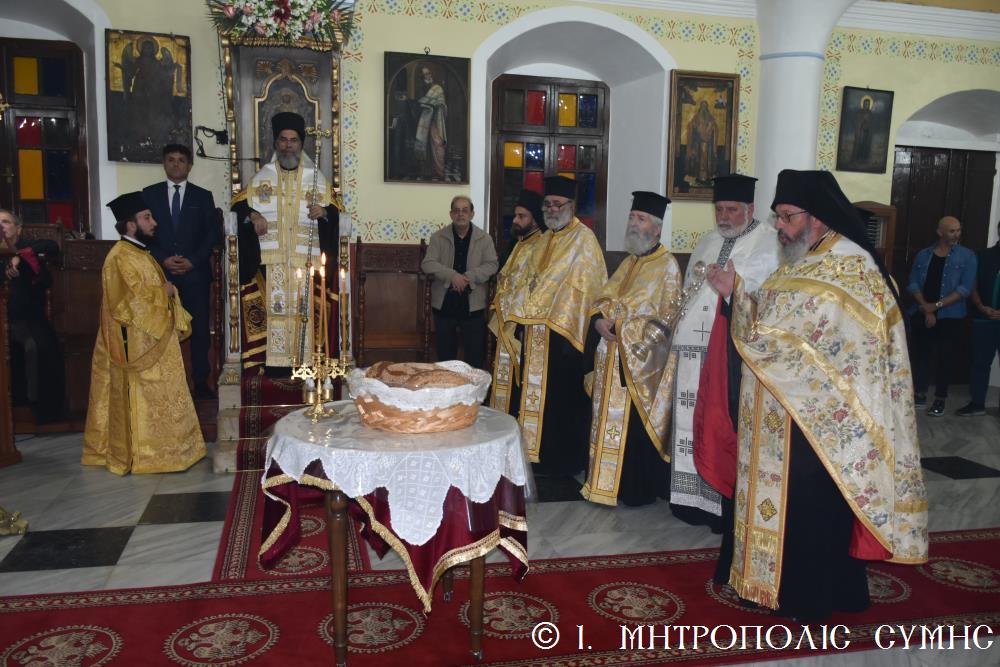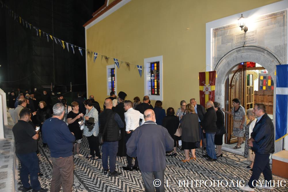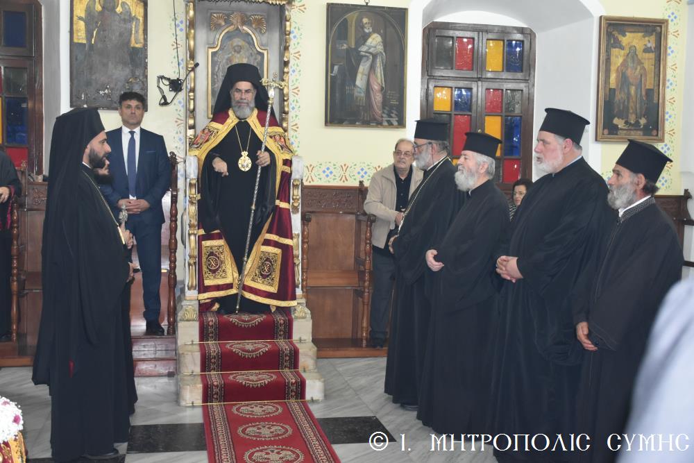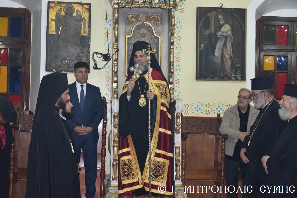 Τό ἑσπέρας τῆς Κυριακῆς 12ης Νοεμβρίου 2023, ἐτελέσθη ὁ Μέγας Πανηγυρικός Ἑσπερινός, χοροστατούντος τοῦ Σεβασμιωτάτου, πλαισιουμένου ὑπό τοῦ Ἱεροῦ κλήρου τῆς Νήσου μας. Τά δέ ἀναλόγια διακόνησαν γλυκυφθόγγως δεξιά, ὁ Πρωτοψάλτης τοῦ Μητροπολιτικοῦ Ναοῦ κ. Δημοσθένης Γιανναρᾶς καί ὁ Πρωτοψάλτης τῆς Ἱ. Μονῆς Πανορμίτου κ. Σταῦρος Πίλιουρας καί ἀριστερά οἱ Ἱεροψάλτες κ. Ἐλευθέριος Ξηράκης, κ. Ἀγαπητός Μιχελλής καί κ. Πανορμίτης Κακακιός. Μεταξύ τῶν συμμετεχόντων πιστῶν, παρέστησαν ὁ Δήμαρχος Σύμης κ. Ἐλευθέριος Παπακαλοδούκας, ὁ Διοικητής τοῦ 549 Τ.Ε. Σύμης Ἀντισυνταγματάρχης κ. Στυλιανός Φωκᾶς καί ἡ Πρόεδρος τῆς Ἑνώσεως Γυναικῶν Σύμης κ. Σεβαστή Νικόλη. Μετά τήν ἀπόλυση, οἱ συμμετέχοντες κληρικοί καί λαϊκοί ἀνέβηκαν στό παρακείμενο Ἀρχονταρίκι τοῦ Ναοῦ, ὅπου ἕκαστος εὐχήθη στόν ἑορτάζοντα Μητροπολίτη μας καί ἐδέχθη τά ἑόρτια κεράσματα.