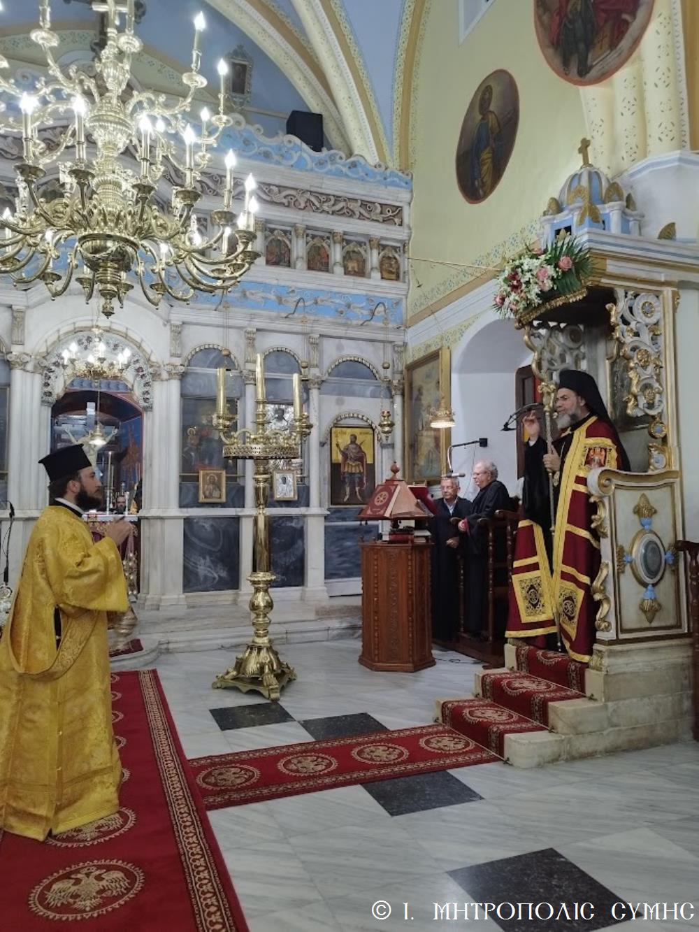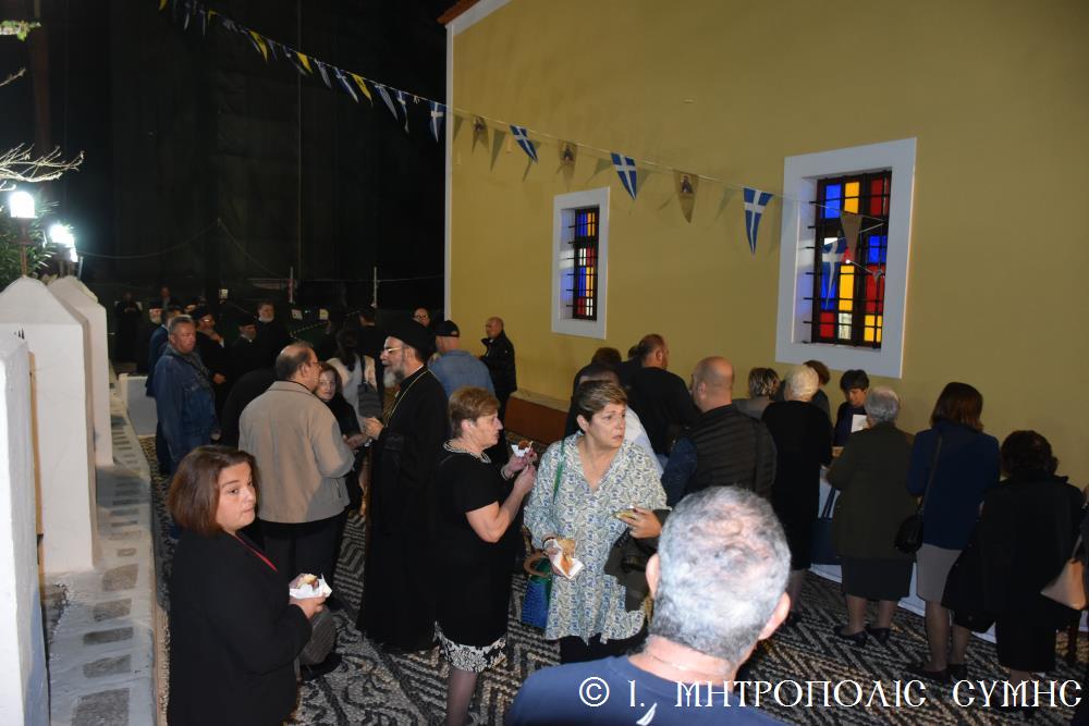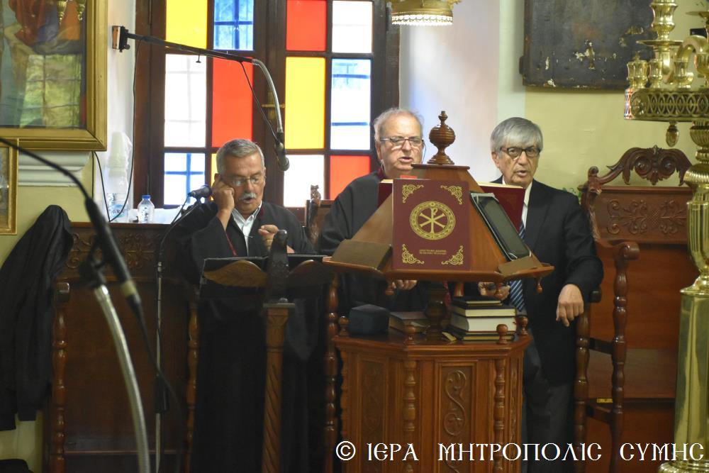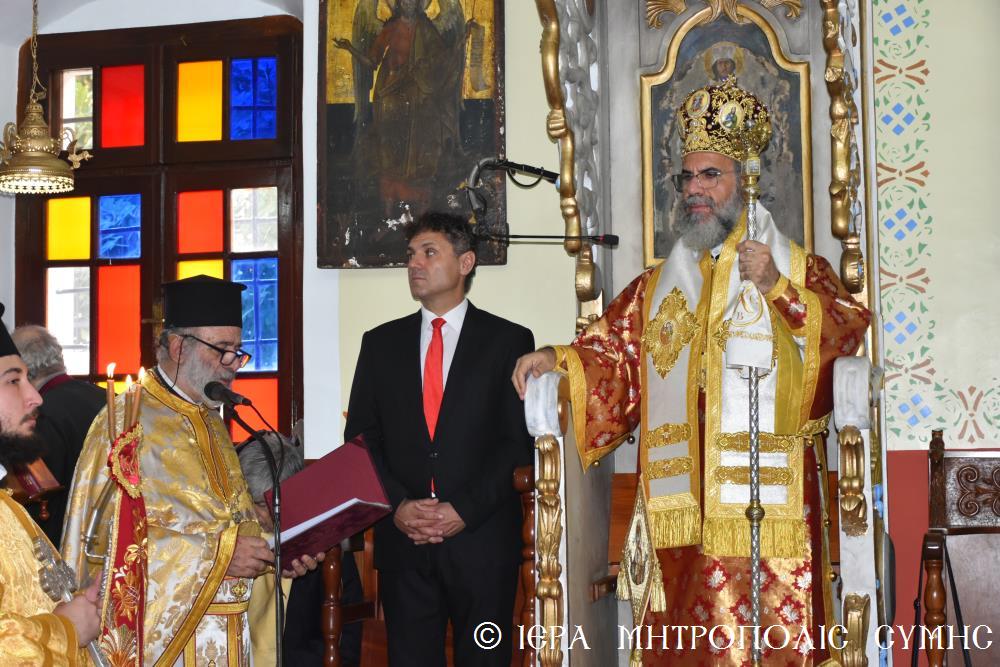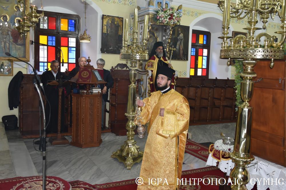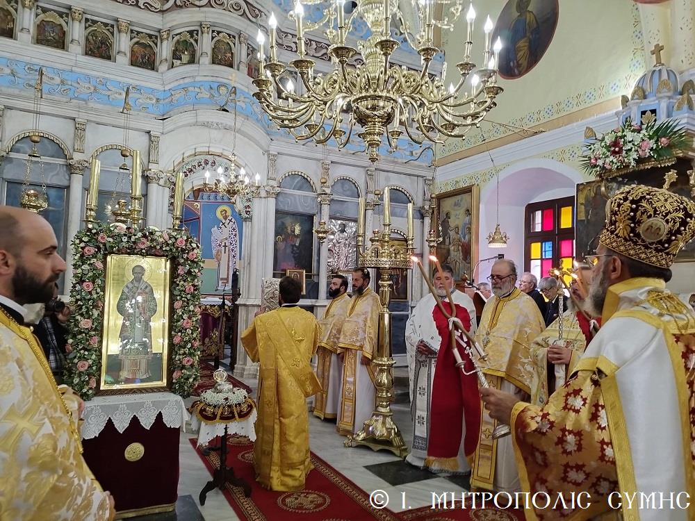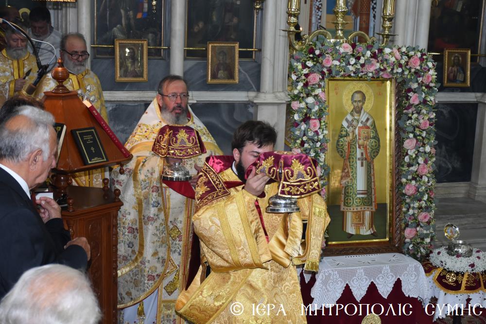 Τό ἑσπέρας τῆς Κυριακῆς 12ης Νοεμβρίου 2023, ἐτελέσθη ὁ Μέγας Πανηγυρικός Ἑσπερινός, χοροστατούντος τοῦ Σεβασμιωτάτου, πλαισιουμένου ὑπό τοῦ Ἱεροῦ κλήρου τῆς Νήσου μας. Τά δέ ἀναλόγια διακόνησαν γλυκυφθόγγως δεξιά, ὁ Πρωτοψάλτης τοῦ Μητροπολιτικοῦ Ναοῦ κ. Δημοσθένης Γιανναρᾶς καί ὁ Πρωτοψάλτης τῆς Ἱ. Μονῆς Πανορμίτου κ. Σταῦρος Πίλιουρας καί ἀριστερά οἱ Ἱεροψάλτες κ. Ἐλευθέριος Ξηράκης, κ. Ἀγαπητός Μιχελλής καί κ. Πανορμίτης Κακακιός. Μεταξύ τῶν συμμετεχόντων πιστῶν, παρέστησαν ὁ Δήμαρχος Σύμης κ. Ἐλευθέριος Παπακαλοδούκας, ὁ Διοικητής τοῦ 549 Τ.Ε. Σύμης Ἀντισυνταγματάρχης κ. Στυλιανός Φωκᾶς καί ἡ Πρόεδρος τῆς Ἑνώσεως Γυναικῶν Σύμης κ. Σεβαστή Νικόλη. Μετά τήν ἀπόλυση, οἱ συμμετέχοντες κληρικοί καί λαϊκοί ἀνέβηκαν στό παρακείμενο Ἀρχονταρίκι τοῦ Ναοῦ, ὅπου ἕκαστος εὐχήθη στόν ἑορτάζοντα Μητροπολίτη μας καί ἐδέχθη τά ἑόρτια κεράσματα.