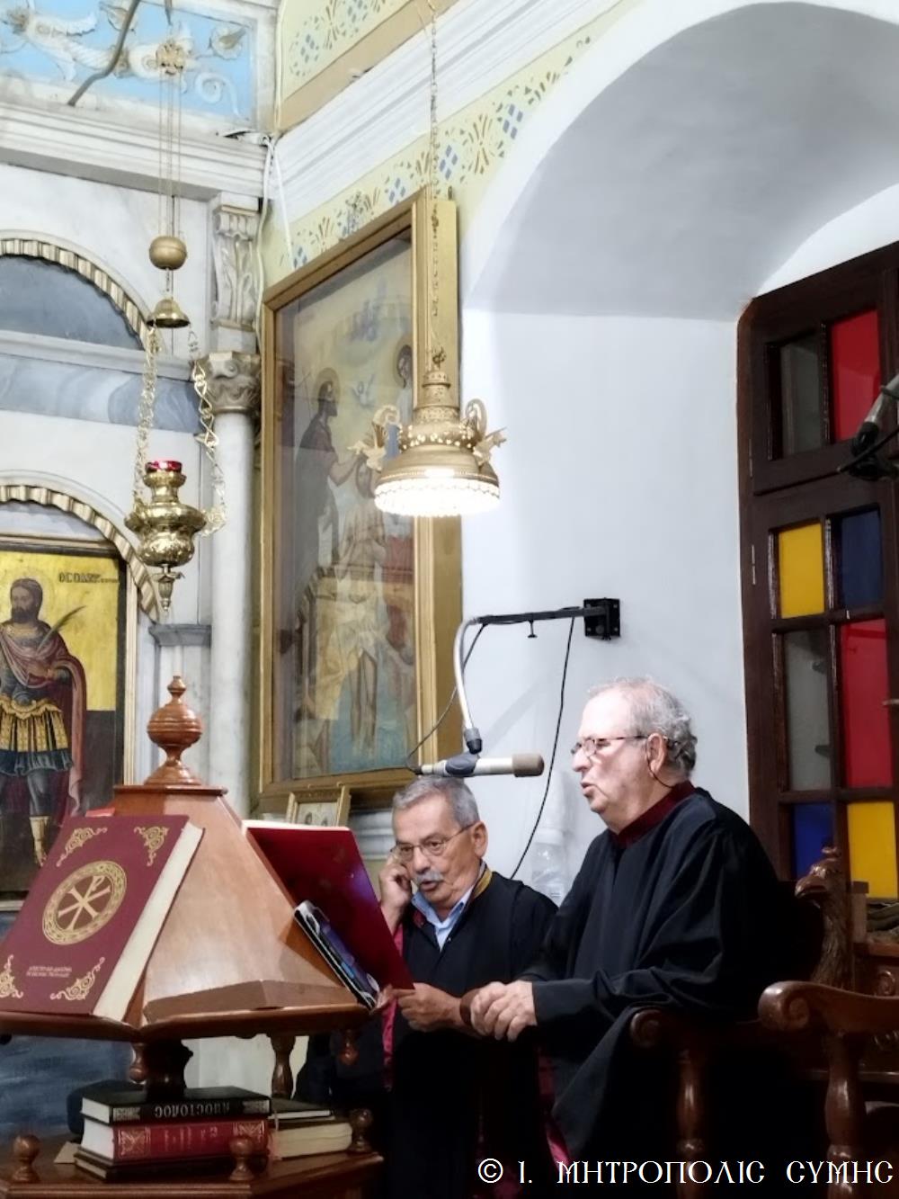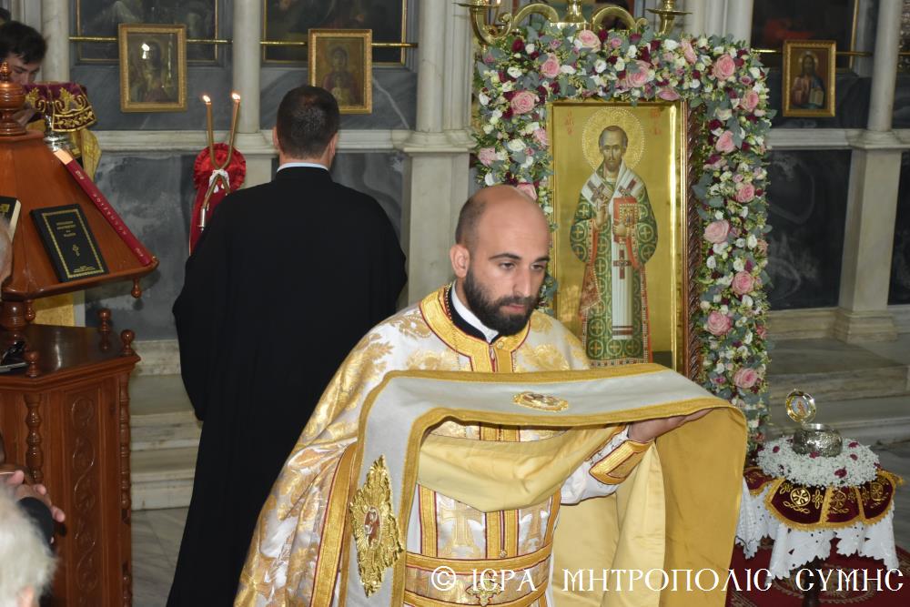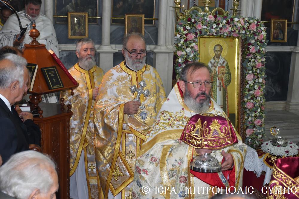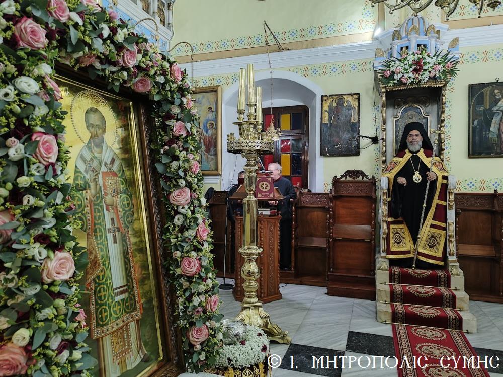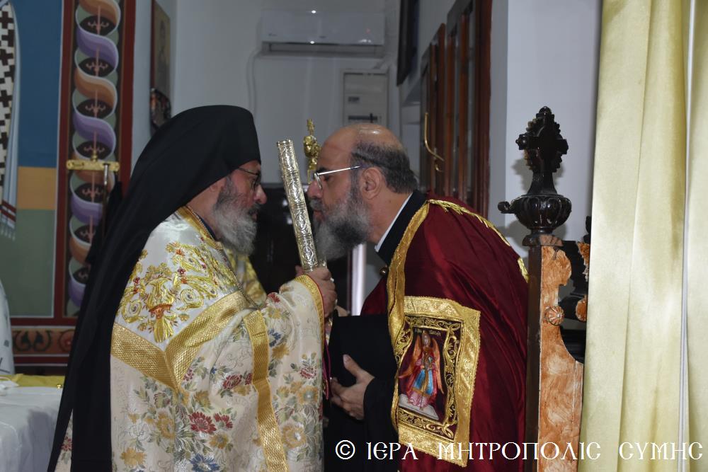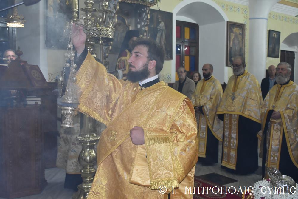 Τό ἑσπέρας τῆς Κυριακῆς 12ης Νοεμβρίου 2023, ἐτελέσθη ὁ Μέγας Πανηγυρικός Ἑσπερινός, χοροστατούντος τοῦ Σεβασμιωτάτου, πλαισιουμένου ὑπό τοῦ Ἱεροῦ κλήρου τῆς Νήσου μας. Τά δέ ἀναλόγια διακόνησαν γλυκυφθόγγως δεξιά, ὁ Πρωτοψάλτης τοῦ Μητροπολιτικοῦ Ναοῦ κ. Δημοσθένης Γιανναρᾶς καί ὁ Πρωτοψάλτης τῆς Ἱ. Μονῆς Πανορμίτου κ. Σταῦρος Πίλιουρας καί ἀριστερά οἱ Ἱεροψάλτες κ. Ἐλευθέριος Ξηράκης, κ. Ἀγαπητός Μιχελλής καί κ. Πανορμίτης Κακακιός. Μεταξύ τῶν συμμετεχόντων πιστῶν, παρέστησαν ὁ Δήμαρχος Σύμης κ. Ἐλευθέριος Παπακαλοδούκας, ὁ Διοικητής τοῦ 549 Τ.Ε. Σύμης Ἀντισυνταγματάρχης κ. Στυλιανός Φωκᾶς καί ἡ Πρόεδρος τῆς Ἑνώσεως Γυναικῶν Σύμης κ. Σεβαστή Νικόλη. Μετά τήν ἀπόλυση, οἱ συμμετέχοντες κληρικοί καί λαϊκοί ἀνέβηκαν στό παρακείμενο Ἀρχονταρίκι τοῦ Ναοῦ, ὅπου ἕκαστος εὐχήθη στόν ἑορτάζοντα Μητροπολίτη μας καί ἐδέχθη τά ἑόρτια κεράσματα.