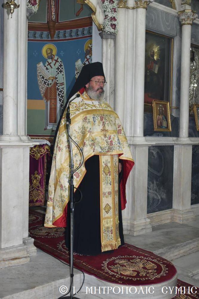 Πρό τῆς Ἀπολύσεως, ὁ π. Στέφανος Μακρῆς, ὡς Γενικός Ἀρχιερατικός Ἐπίτροπος ἐκ μέρους τῶν κληρικῶν τῆς Ἱ. Μητροπόλεως προσεφώνησε ἑορτίως τόν Σεβασμιώτατο Ποιμενάρχη μας, μιλώντας ἐμπνευσμένα γιά τόν Ἴδιο καί τό ἐπιτελεσθέν κατά τό διάστημα τῆς Ἀρχιερατείας του ἀξιόλογο ἔργο του. Ἀντιφωνῶν ὁ Σεβασμιώτατος εὐχαρίστησε ἀπό καρδίας, ὁμίλησε γιά τήν μεγάλη μορφή τοῦ ἑορταζομένου του Ἁγίου καί ζήτησε τίς προσευχές ὅλων γιά τήν θεοφιλῆ συνέχιση τῆς Ἀρχιερατικῆς Διακονίας του στήν πολυνησιωτική ἀκριτική μας Μητρόπολη. Τέλος διένειμε τό ἀντίδωρον καί μικρόν εἰκονίδιον τοῦ Ἱεροῦ Χρυσοστόμου, εἰς ἕναν ἕκαστον τῶν ἐκκλησιαζομένων, δεχόμενος τάς ἐγκαρδίους εὐχάς τοῦ εὐσεβοῦς ποιμνίου του.