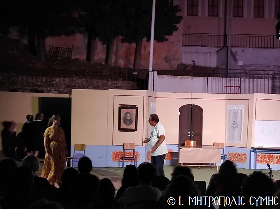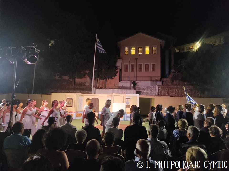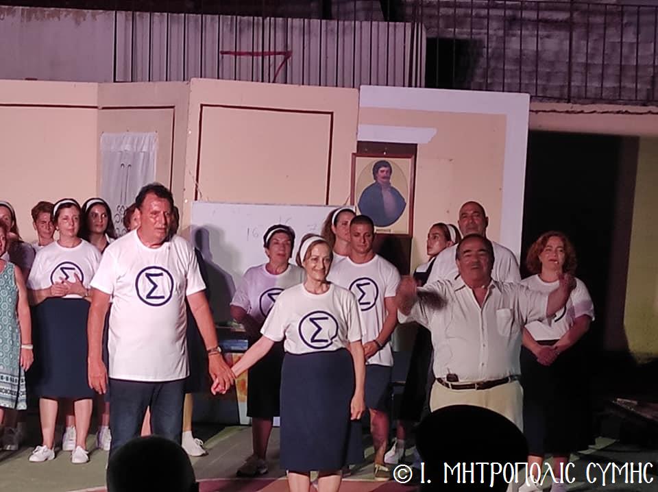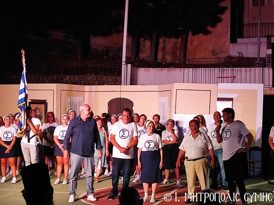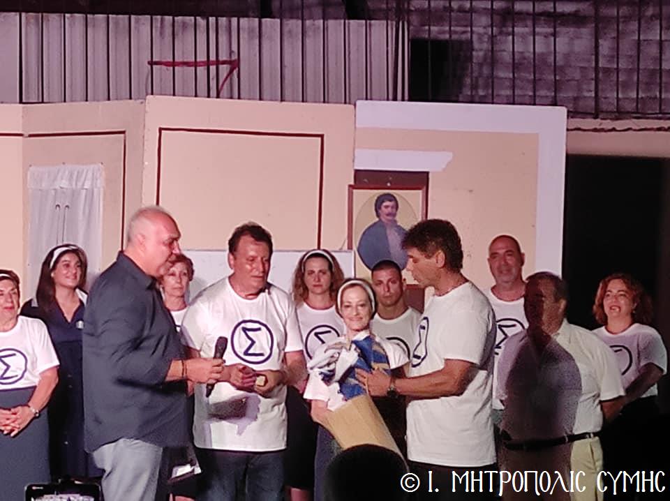 Πρό τοῦ πέρατος τῆς ἐκδηλώσεως ὁ κ. Ἀντωνόγλου εὐχαρίστησε τόν Σεβ. Μητροπολίτη μας κ. Χρυσόστομο καί τόν Δήμαρχο Σύμης κ. Ἐλευθέριο Παπακαλοδούκα γιά τήν ἐμπιστοσύνη τους στό πρόσωπό του, καθ’ ὅτι προσφυῶς τοῦ ἀνάθεσαν τήν ὀργάνωση τῆς ἐκδηλώσεως. Ἐν συνεχείᾳ ὁ κ. Δήμαρχος ἔλαβε τόν λόγο καί συνεχάρη τόν κ. Ἀντωνόγλου, τούς συμμετέχοντες καί τούς ἠθοποιούς τοῦ θεάτρου, ἐπιδίδοντας τιμητική πλακέττα γιά τό ὄμορφο καί ἐπιτυχές ἀποτέλεσμα. Χαιρετισμό ἀπηύθυνε καί ὁ Ἀντιπεριφερειάρχης Πολιτισμοῦ κ. Χρῆστος Μπάρδος, ἐκφράζοντας τά θερμά του συγχαρητήρια σ’ ὅλους τούς διοργανωτές, δεδομένου ὅτι ἡ Περιφέρεια Νοτίου Αἰγαίου ὑποστήριξε τήν ὅλη ἐκδήλωση μέ εἰδική χορηγία. Τήν συγκινητική ἐκδήλωση ἔκλεισε μέ ἐμπνευσμένο χαιρετισμό, ὁ Σεβ. Μητροπολίτης μας κ. Χρυσόστομος, ὁ ὁποῖος συνεχάρη τόν κ. Ἀντωνόγλου, τόν Σύλλογο Συμιακῶν Ρόδου καί τά μέλη τοῦ θεατρικοῦ του τμήματος, καθώς καί ὅλους τούς συμμετέχοντες.