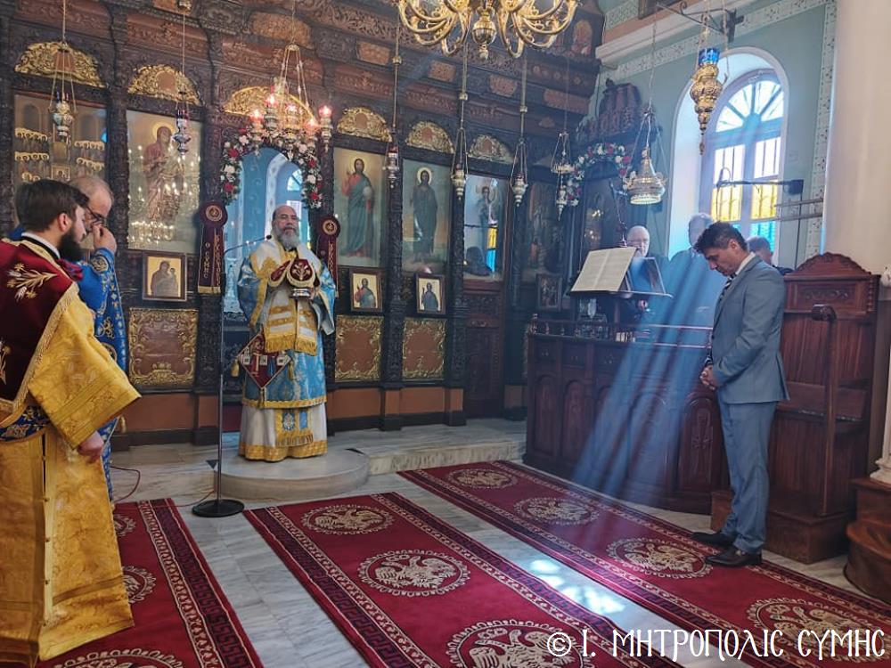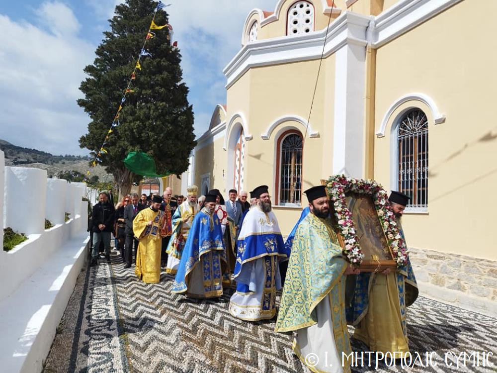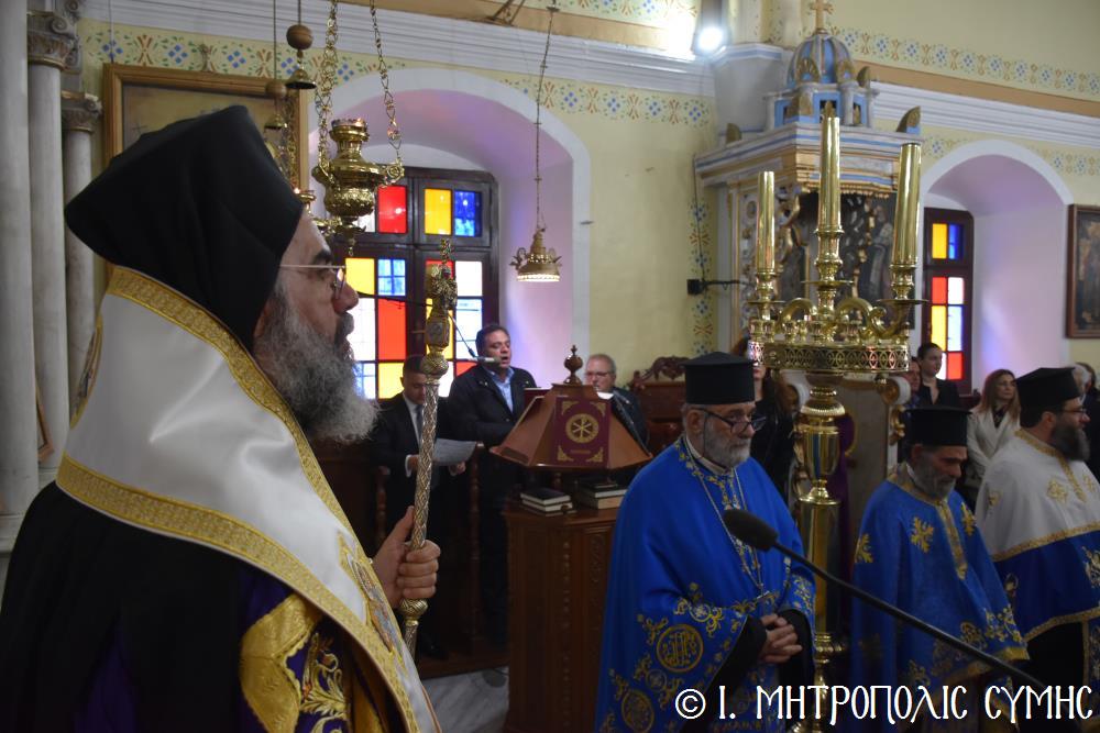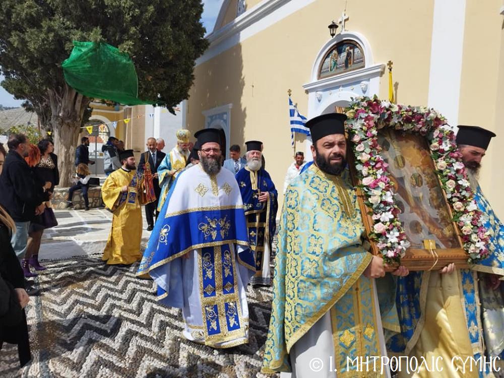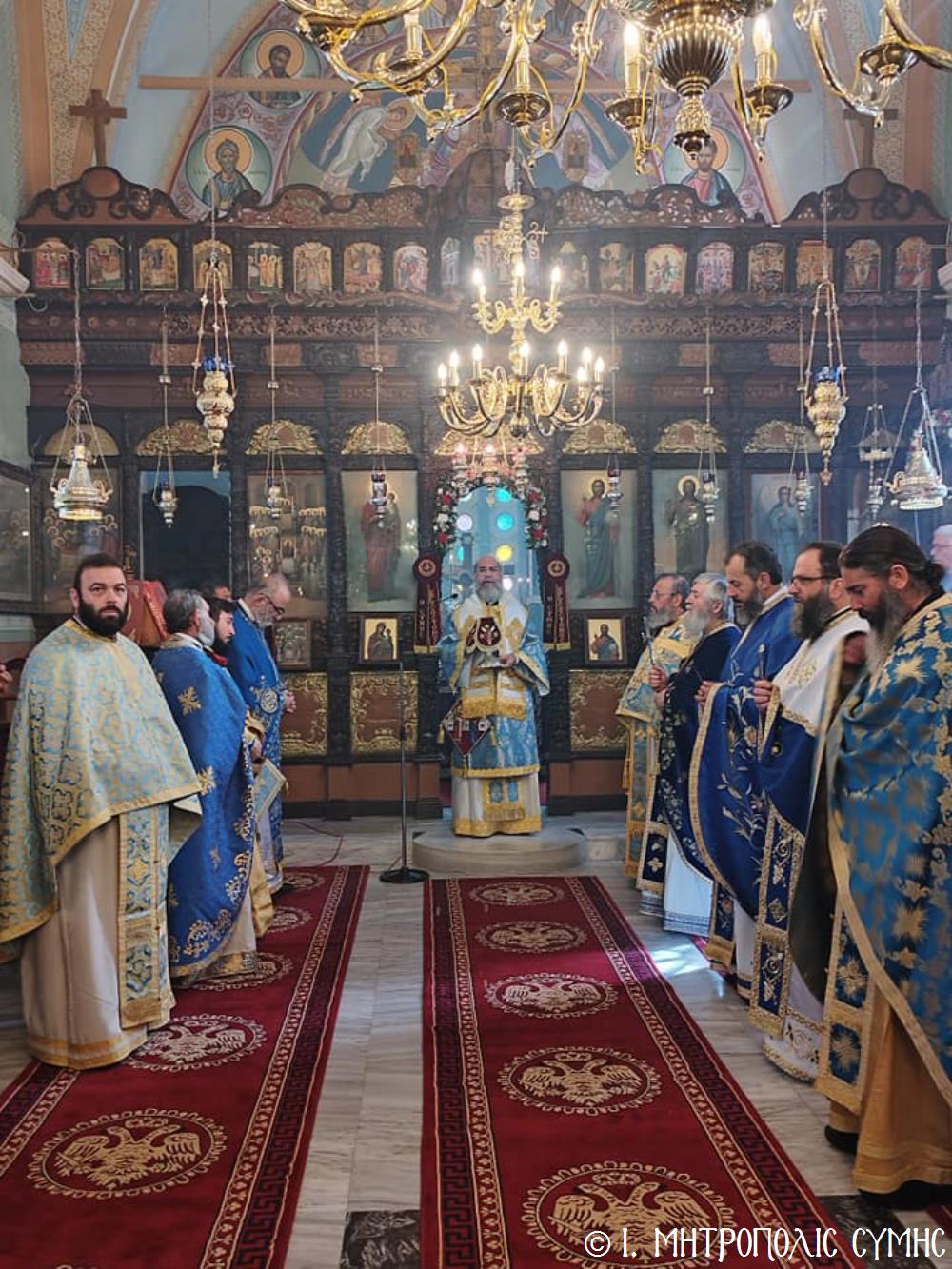 Μέ τήν δέουσα ἐκκλησιαστική τάξη καί λαμπρότητα ἑορτάστηκε ἐφέτος Κυριακή 24η καί Δευτέρα 25η Μαρτίου 2024 καί στήν Σύμη, τήν ἕδρα τῆς Ἱερᾶς Μητροπόλεώς μας, ἡ διπλή ἑορτή τοῦ Εὐαγγελισμοῦ τῆς Ὑπεραγίας Θεοτόκου καί παράλληλα ἡ ἐπέτειος τῆς Ἐθνικῆς μας Παλιγγενεσίας. Τό ἐπίκεντρο τοῦ ἑορτασμοῦ ἦταν ὁ πανηγυρίζων ἐνοριακός Ἱερός Ναός τοῦ Εὐαγγελισμοῦ τῆς Θεοτόκου, ὁ ὁποῖος δεσπόζει σέ περίοπτη θέση δεξιά τῆς εἰσόδου τοῦ γραφικοῦ λιμανιοῦ τοῦ νησιοῦ.