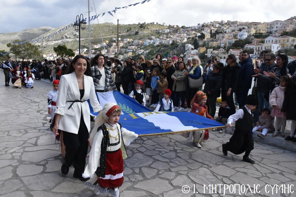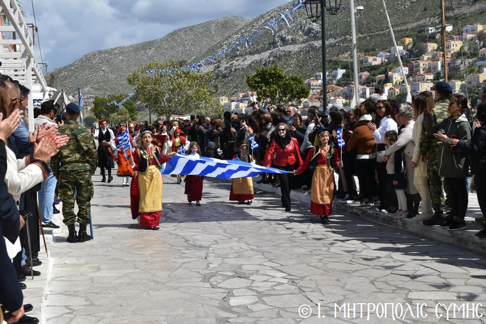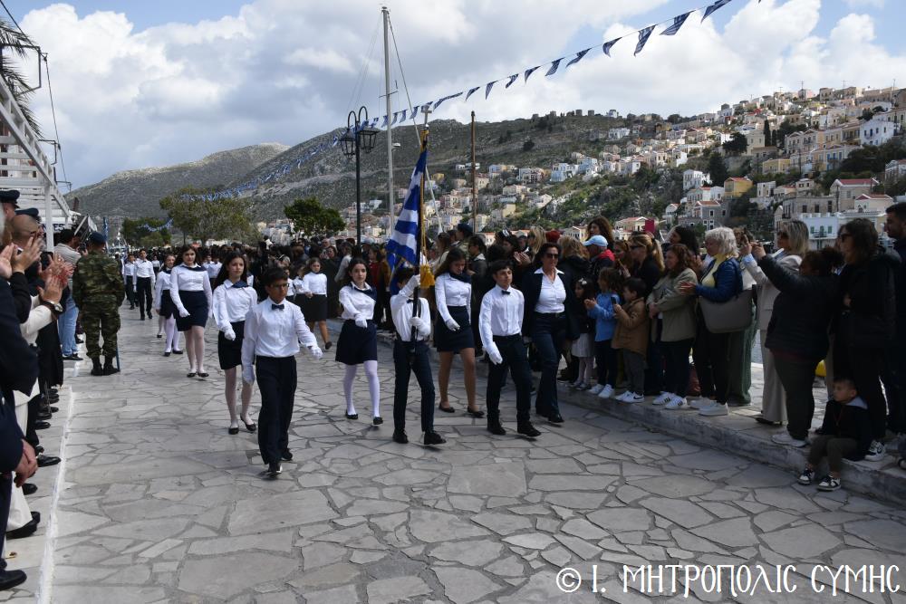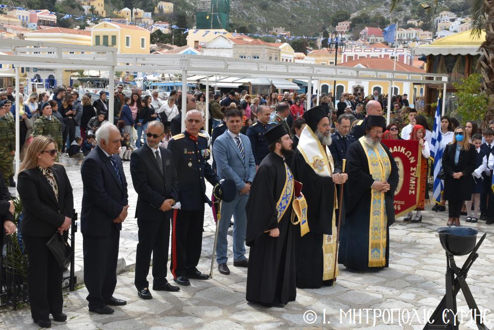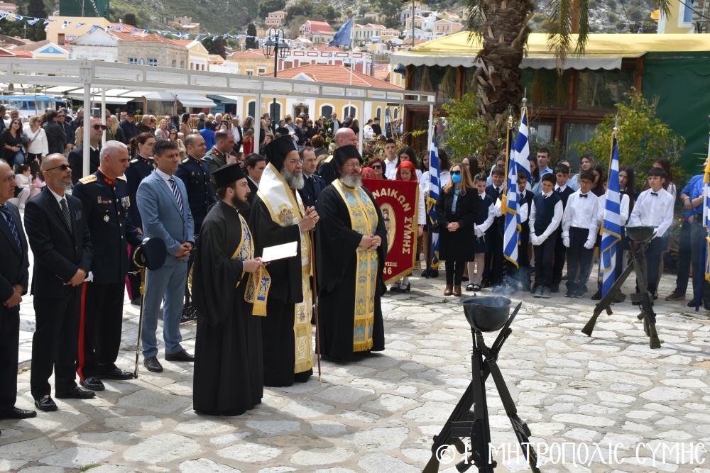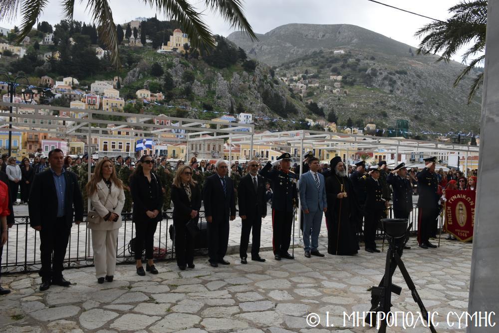 Ἐν συνεχείᾳ μέ κάθε ἐπισημότητα ἑορτάστηκε καί ἡ Ἐθνική ἐπέτειος τῆς 25ης Μαρτίου 1821. Συμφώνως μέ τό πρόγραμμα τοῦ Δήμου μας, ὥρα 11:30 ἐτελέσθη ἡ ἐπίσημη δοξολογία εἰς τόν Μητροπολιτικό Ἱ. Ναό τοῦ Τιμίου Προδρόμου Σύμης, προεξάρχοντος τοῦ Σεβ. Ποιμενάρχου μας, Μητροπολίτου Σύμης κ. Χρυσοστόμου, συμπαραστατουμένου ἐκ τοῦ ἱ. Κλήρου τῆς Νήσου μας. Παρόντες ὁ Δήμαρχος Σύμης κ. Ἐλευθέριος Παπακαλοδούκας, ὁ Ἄρχων Δικαιοφύλαξ τῆς Μ.Χ.Ε. Ἐντιμολ. κ. Θεόδωρος Παπαγεωργίου, ὁ Πρόεδρος τοῦ Δημοτ. Συμβουλίου κ. Φίλ. Δερμιτζάκης, ὁ Ἀντιδήμαρχος κ. Νικ. Γρύλλης καί Μέλη τοῦ Δ.Σ. ὁ Διοικητής Δ.Α.Ν. τῆς Σύμης Συνταγματάρχης κ. Παναγιώτης Βρανάς, ὁ Διοικητής τοῦ 549 Τ.Ε. Σύμης Ἀνχης κ. Στυλιανός Φωκᾶς, ὁ Διοικητής τοῦ Α.Τ. Σύμης κ. Δημοσθένης Κοτσιλάρας, ἡ Λιμενάρχης Σύμης κ. Δέσποινα Χουχουρέλου μετά τῶν ἀντίστοιχων ἀντιπροσωπειῶν, ἡ Πρόεδρος τῆς Ἑνώσεως Γυναικῶν Σύμης κ. Σεβαστή Νικόλη, οἱ Διευθυντές τῶν Σχολείων καί Ἐκπαιδευτικοί, ὅλοι οἱ ἐκπρόσωποι τῶν τοπικῶν Ἀρχῶν, Φορέων καί Συλλόγων.