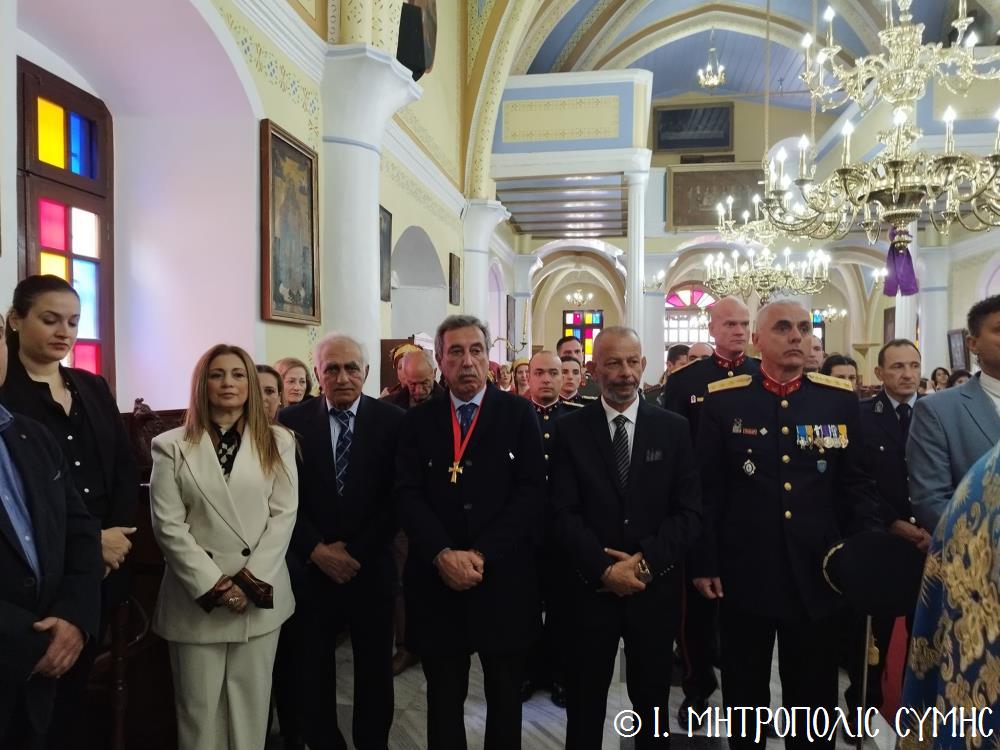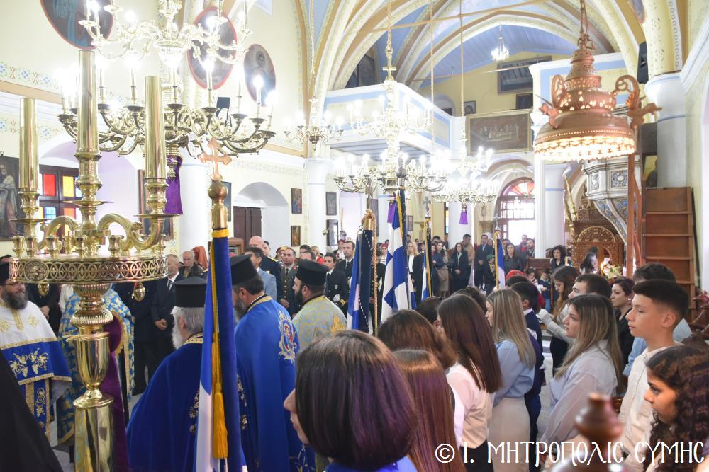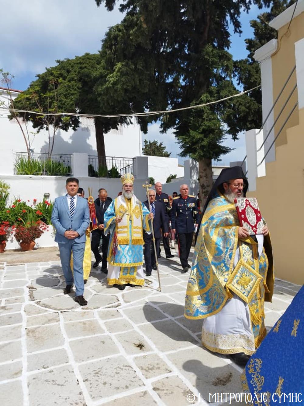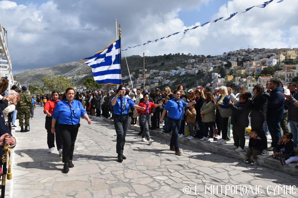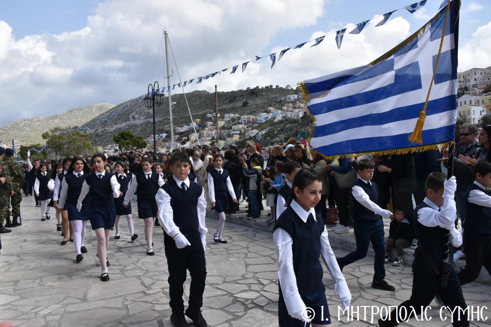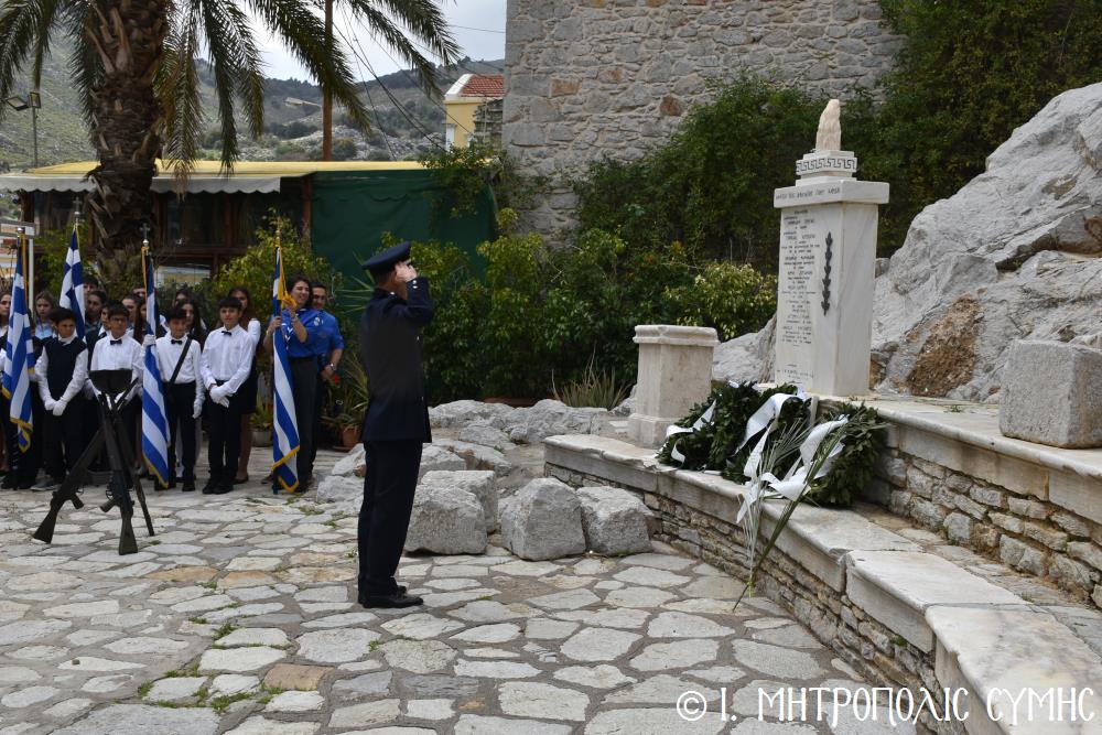 Ἐν συνεχείᾳ μέ κάθε ἐπισημότητα ἑορτάστηκε καί ἡ Ἐθνική ἐπέτειος τῆς 25ης Μαρτίου 1821. Συμφώνως μέ τό πρόγραμμα τοῦ Δήμου μας, ὥρα 11:30 ἐτελέσθη ἡ ἐπίσημη δοξολογία εἰς τόν Μητροπολιτικό Ἱ. Ναό τοῦ Τιμίου Προδρόμου Σύμης, προεξάρχοντος τοῦ Σεβ. Ποιμενάρχου μας, Μητροπολίτου Σύμης κ. Χρυσοστόμου, συμπαραστατουμένου ἐκ τοῦ ἱ. Κλήρου τῆς Νήσου μας. Παρόντες ὁ Δήμαρχος Σύμης κ. Ἐλευθέριος Παπακαλοδούκας, ὁ Ἄρχων Δικαιοφύλαξ τῆς Μ.Χ.Ε. Ἐντιμολ. κ. Θεόδωρος Παπαγεωργίου, ὁ Πρόεδρος τοῦ Δημοτ. Συμβουλίου κ. Φίλ. Δερμιτζάκης, ὁ Ἀντιδήμαρχος κ. Νικ. Γρύλλης καί Μέλη τοῦ Δ.Σ. ὁ Διοικητής Δ.Α.Ν. τῆς Σύμης Συνταγματάρχης κ. Παναγιώτης Βρανάς, ὁ Διοικητής τοῦ 549 Τ.Ε. Σύμης Ἀνχης κ. Στυλιανός Φωκᾶς, ὁ Διοικητής τοῦ Α.Τ. Σύμης κ. Δημοσθένης Κοτσιλάρας, ἡ Λιμενάρχης Σύμης κ. Δέσποινα Χουχουρέλου μετά τῶν ἀντίστοιχων ἀντιπροσωπειῶν, ἡ Πρόεδρος τῆς Ἑνώσεως Γυναικῶν Σύμης κ. Σεβαστή Νικόλη, οἱ Διευθυντές τῶν Σχολείων καί Ἐκπαιδευτικοί, ὅλοι οἱ ἐκπρόσωποι τῶν τοπικῶν Ἀρχῶν, Φορέων καί Συλλόγων.