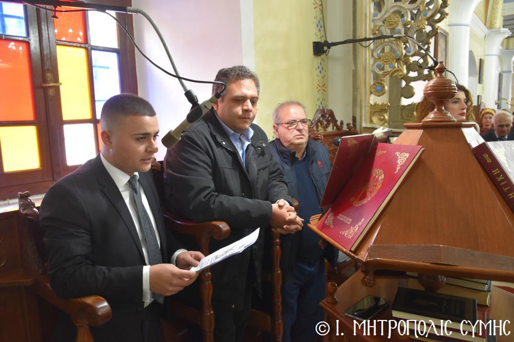 Τό ἑσπέρας τῆς Κυριακῆς περί ὥρα 18:30, ἐτελέσθη ὁ Μέγας Πανηγυρικός Ἑσπερινός ὑπό τοῦ Πανοσιολ. Καθηγουμένου τῆς Ἱ. Μονῆς Πανορμίτου Ἀρχιμ. Ἀντωνίου Πατροῦ, τοῦ Γεν. Ἀρχιερατικοῦ Ἐπιτρόπου Πρωτοπρ. Στεφ. Μακρῆ, τοῦ Αἰδεσ. Ἐφημερίου τῆς Ἐνορίας Πρεσβ. Ἀντωνίου Μανιᾶ, τῶν λοιπῶν Ἐφημερίων τῆς Νήσου καί τοῦ Ἱεροδιακόνου μας π. Παύλου Τερεζάκη, ἀπόντος ἐφέτος τοῦ Σεβασμιωτάτου εἰς τό Οἰκουμενικόν Πατριαρχεῖον διά τήν ἐκεῖ Πανήγυριν τῆς Κυριακῆς τῆς Ὀρθοδοξίας, ὑπό τήν ἰδιότητά του ὡς Συνοδικοῦ Παρέδρου. Τό δέ ἱ. ἀναλόγιον ἐκόσμησε χορός Ἱεροψαλτῶν ἀποτελούμενος ἀπό τόν Ἱεροψάλτη τοῦ Ἱ. Ναοῦ κ. Ἀγαπητό Μιχελλῆ καί τούς Ἱεροψάλτες κ. Ἰωάννη Τσίγκο καί κ. Ἐλευθέριο Ξηράκη.