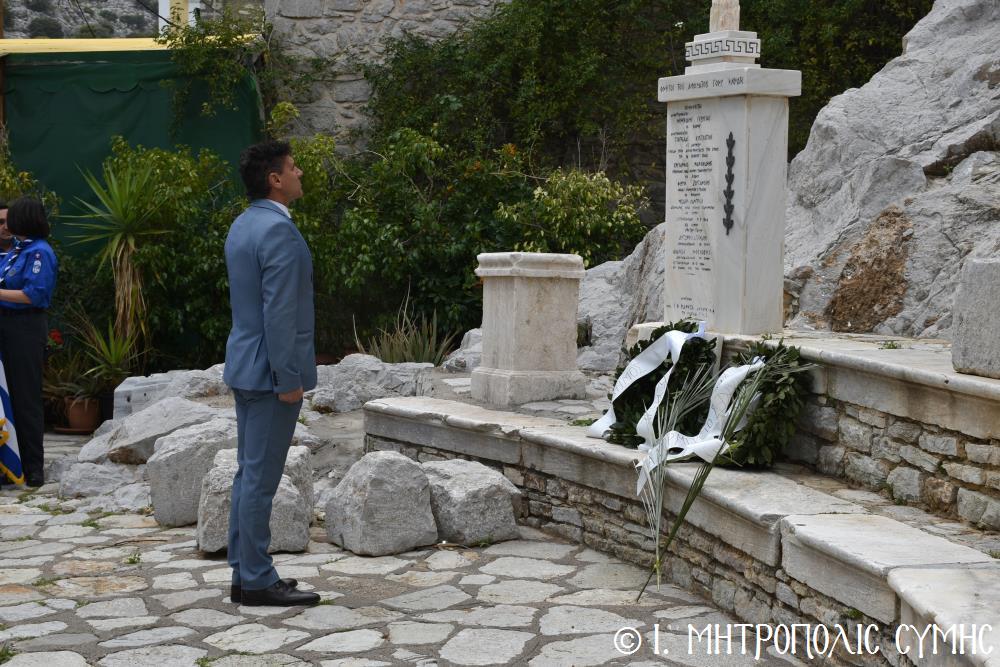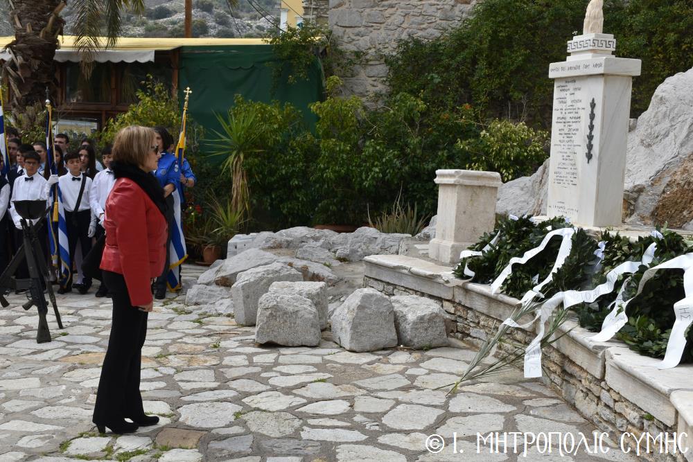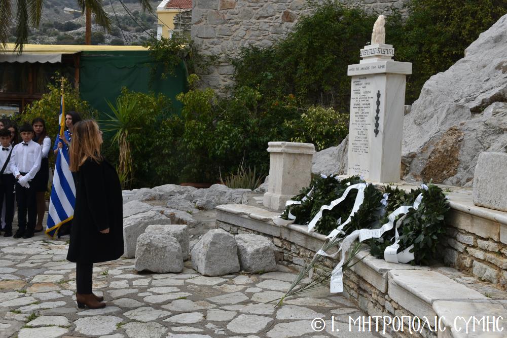 Μετά τήν Ἀπόλυση τῆς Δοξολογίας τόν Πανηγυρικό τῆς ἡμέρας ἐκφώνησε ἡ Καθηγήτρια τοῦ «Πανορμιτείου» Γυμνασίου Σύμης κ. Ἰφιγένεια Μάνθου καί ὁ ἱ. Κλῆρος μέ τίς Ἀρχές, τούς Μαθητές καί τόν Λαό, μετέβησαν στό χῶρο τοῦ Ἡρώου τῶν Πεσόντων, ὅπου ἀνεπέμφθη, προεξάρχοντος τοῦ Σεβασμιωτάτου, ἐπιμνημόσυνη δέηση ὑπέρ ἀναπαύσεως τῶν ψυχῶν «Πάντων τῶν ἐν τοῖς ἱεροῖς ἡμῶν ἀγῶσιν ὑπὲρ πίστεως καὶ πατρίδος ἀγωνισαμένων καὶ ἐνδόξως πεσόντων» καί κατετέθησαν στεφάνια ἀπό τούς ἐκπροσώπους τῶν Ἀρχῶν.