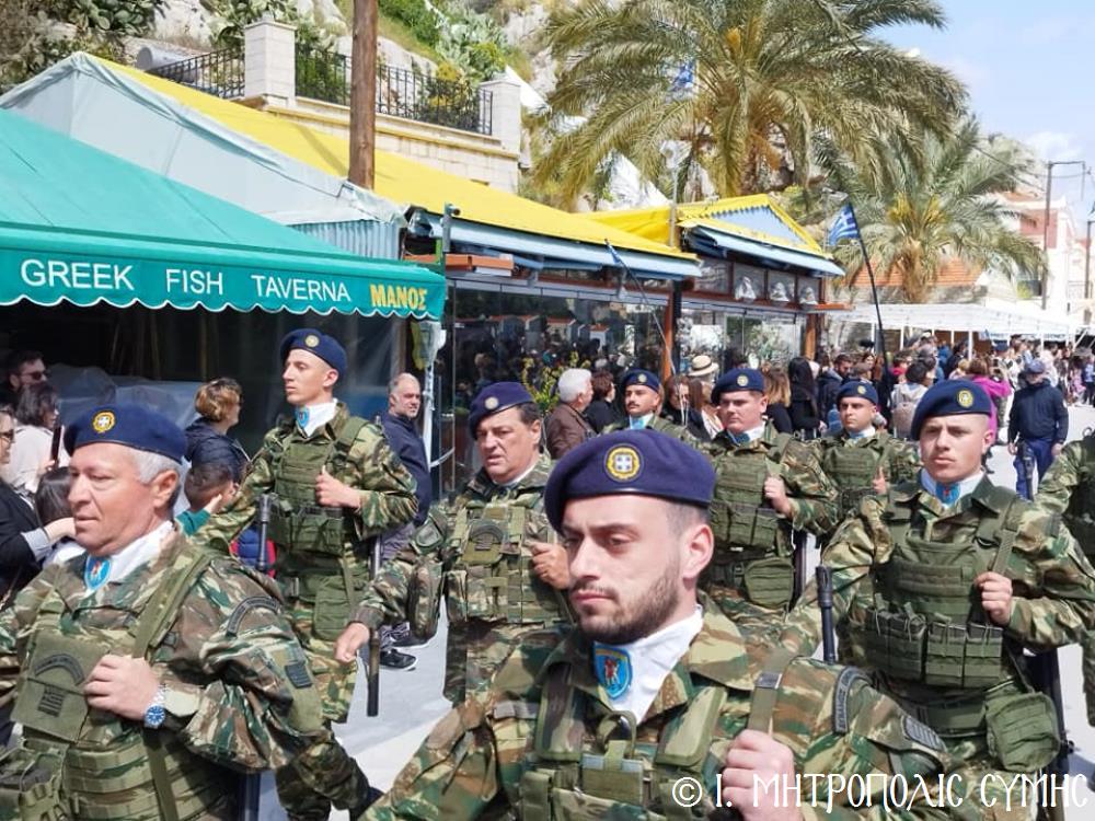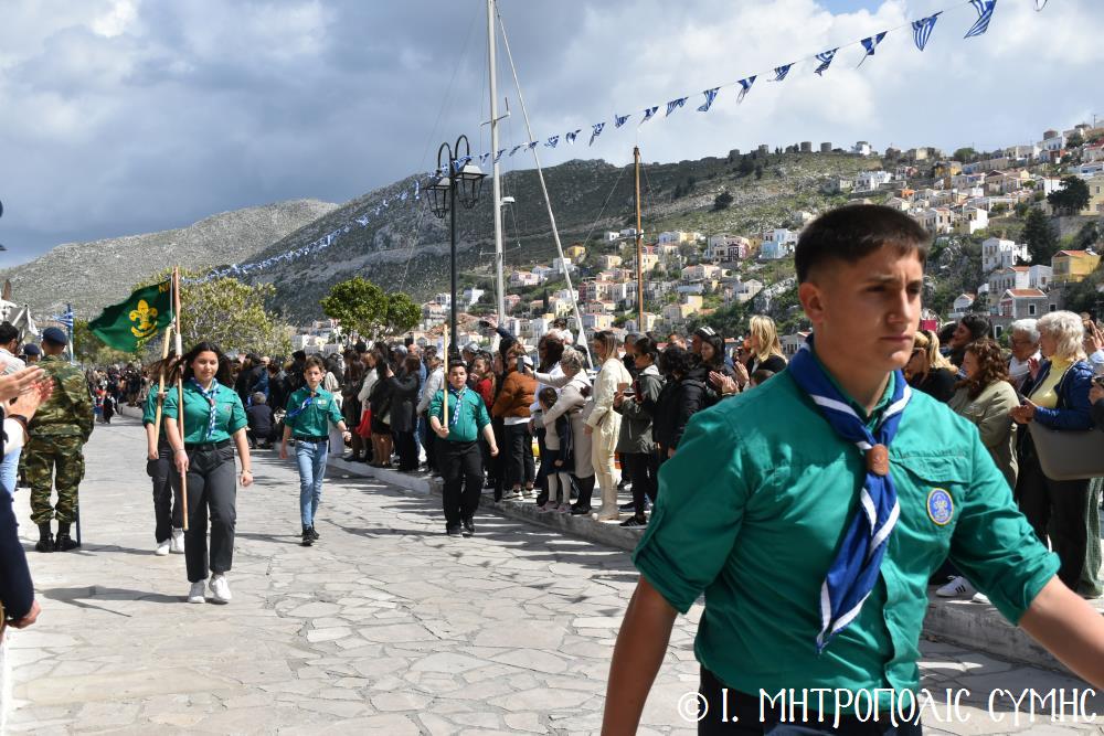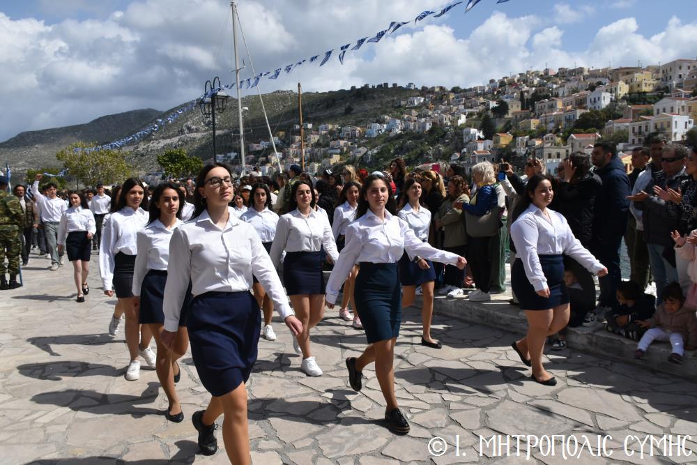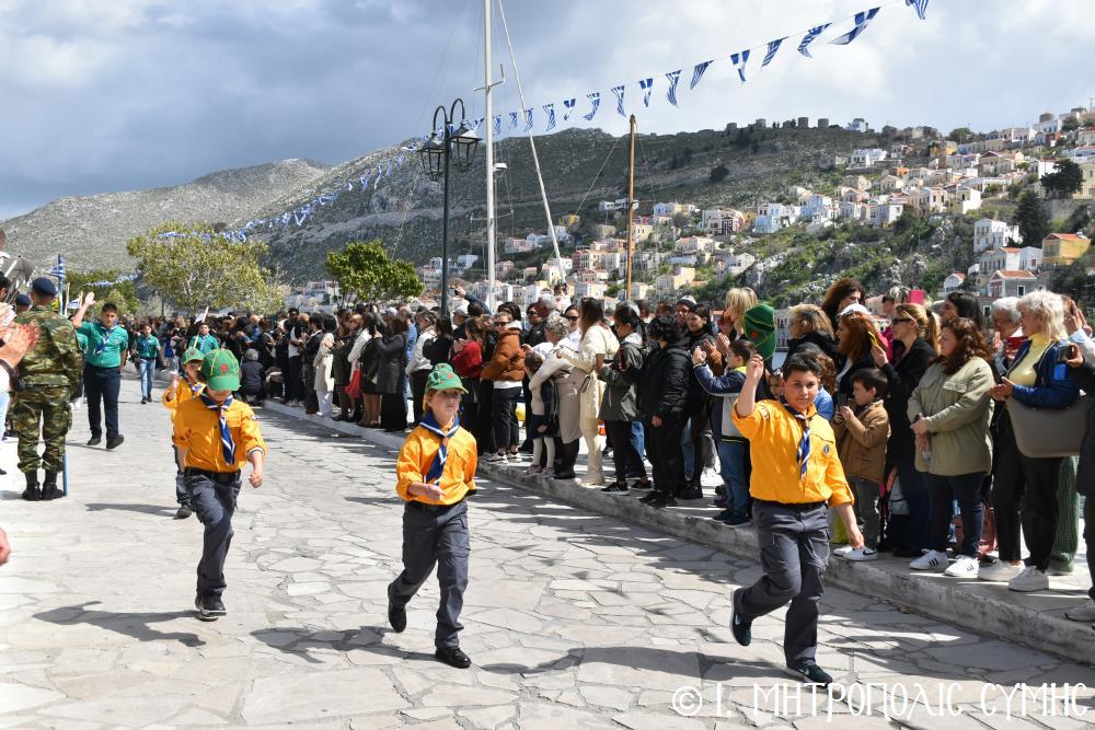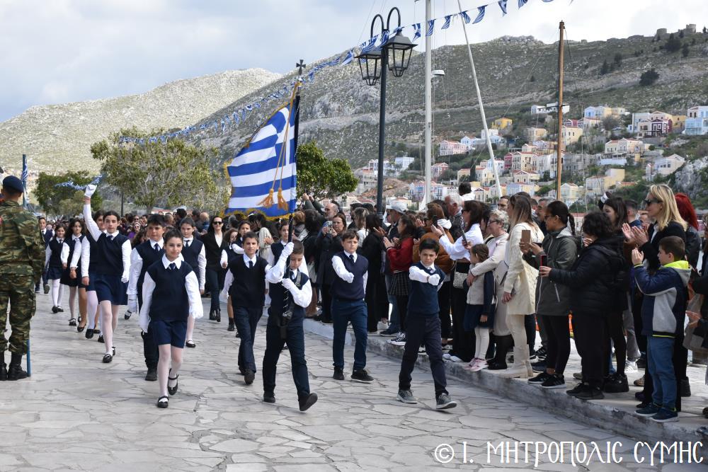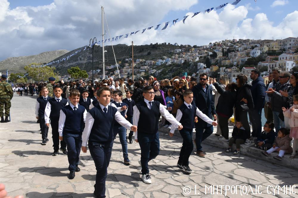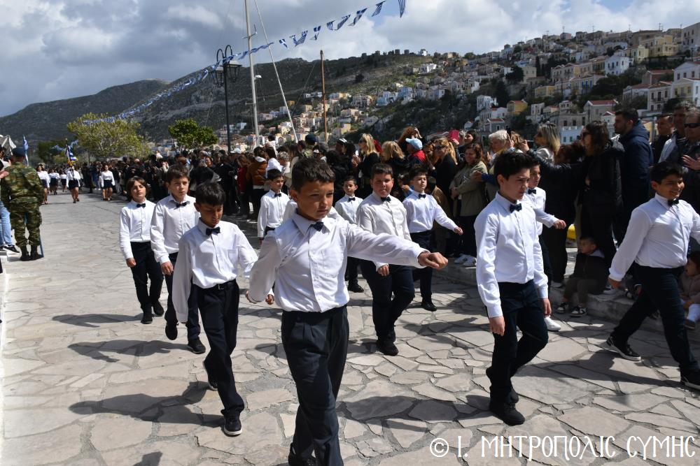 Ἀκολούθησε ἡ παρέλαση ὑπό τούς ἤχους ἐθνικῶν μας ἐμβατηρίων, μέ τόν κόσμο νά χειροκροτᾶ μέ σθένος καί ἐνθουσιασμό. Τήν παρέλαση ξεκίνησαν οἱ μικροί μαθητές τῶν Νηπιαγωγείων καί ἀκολούθησαν ἐκεῖνοι τῶν Δημοτικῶν Σχολείων, οἱ Πρόσκοποι, Μέλη τῆς Ἑνώσεως Γυναικῶν Σύμης μέ τίς τοπικές ἐνδυμασίες τους, ἐν συνεχείᾳ οἱ Μαθητές τοῦ Πανορμιτείου Γυμνασίου καί τῶν Λυκείων τοῦ Νησιοῦ. Τήν παρέλαση ὁλοκλήρωσαν μέ ἐθνική ὑπερηφάνεια καί «ἠθικόν ἀκμαιότατον» οἱ μάχιμοι στρατιῶτες τῆς Δ.Α.Ν. Σύμης καί οἱ ὑπερήφανοι Συμαῖοι Ἔφεδροι Ἐθνοφύλακες.