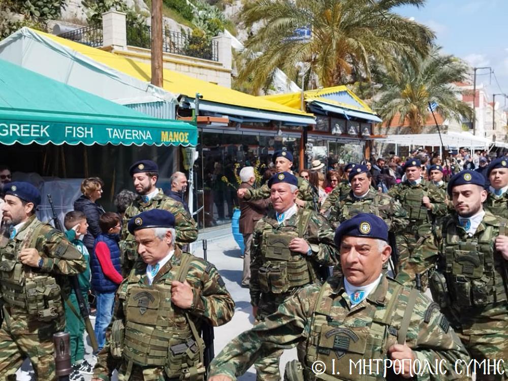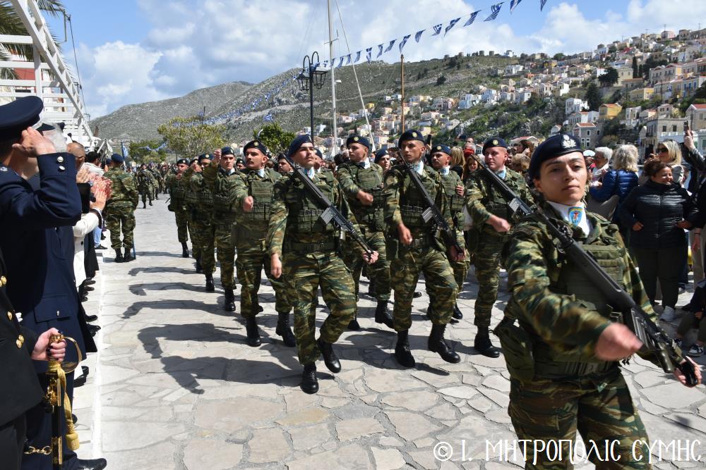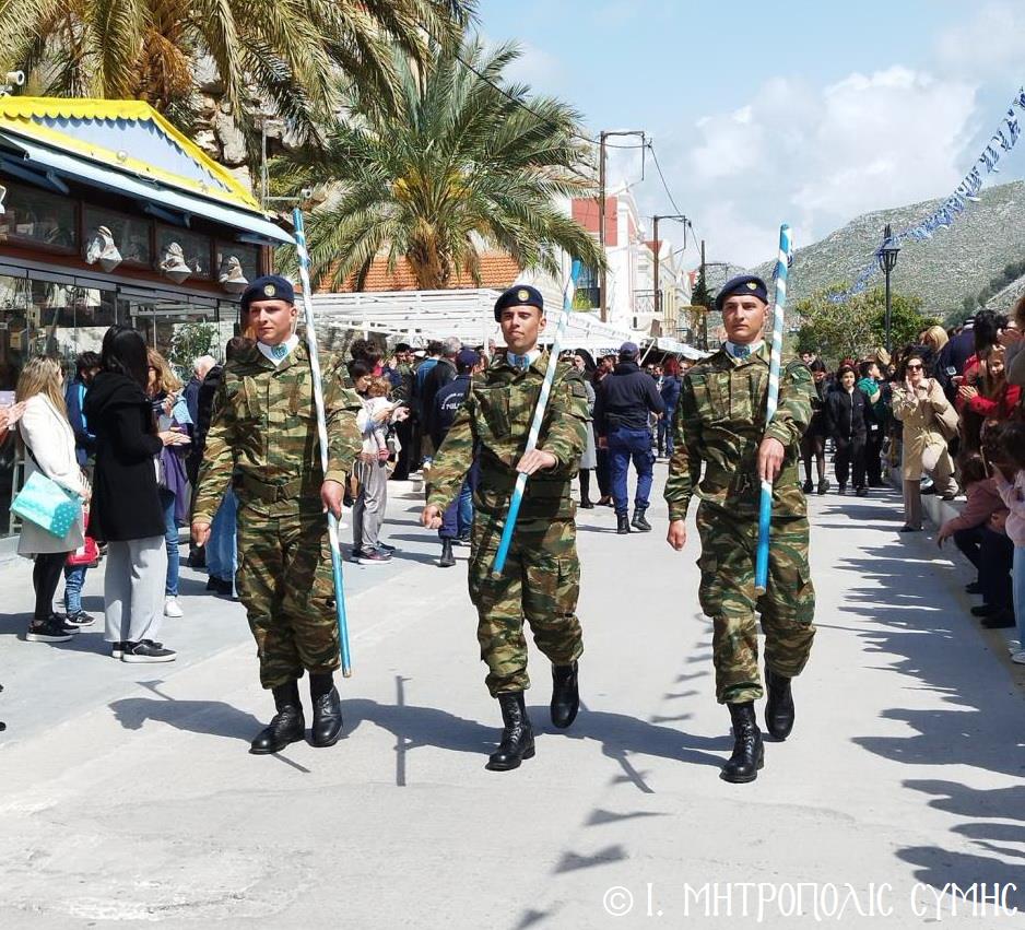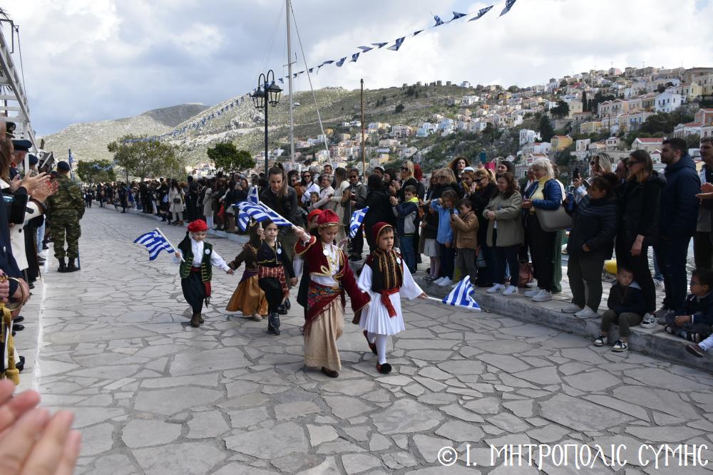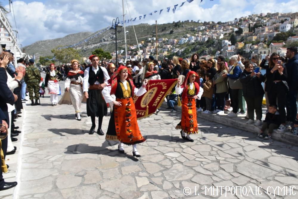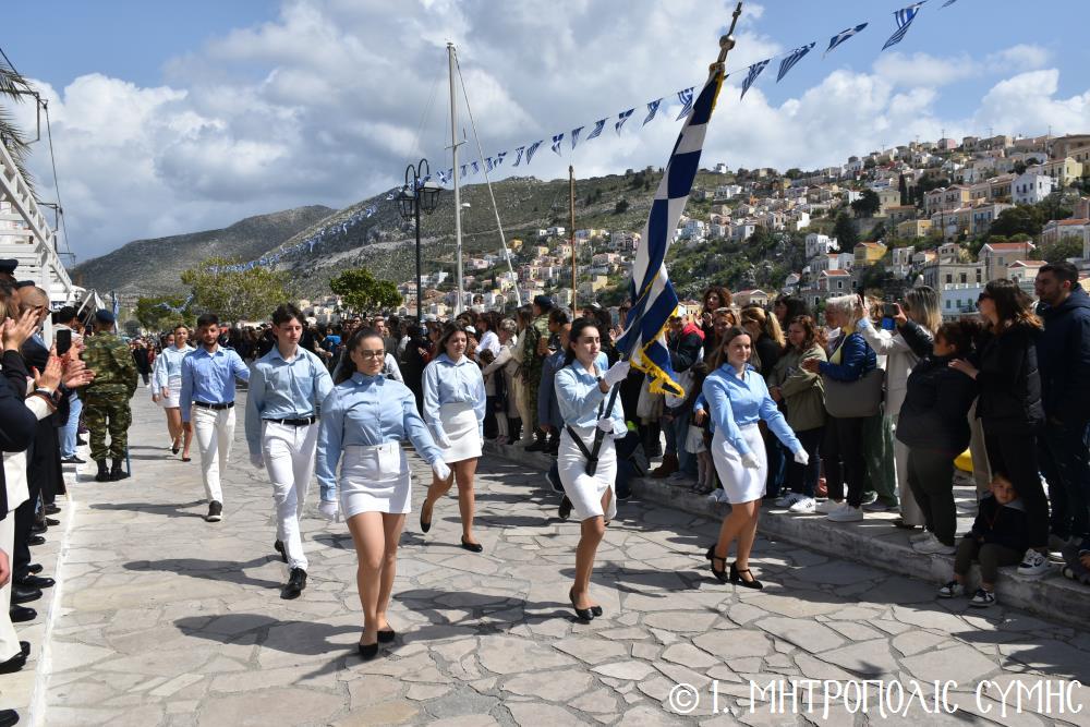 Ἀκολούθησε ἡ παρέλαση ὑπό τούς ἤχους ἐθνικῶν μας ἐμβατηρίων, μέ τόν κόσμο νά χειροκροτᾶ μέ σθένος καί ἐνθουσιασμό. Τήν παρέλαση ξεκίνησαν οἱ μικροί μαθητές τῶν Νηπιαγωγείων καί ἀκολούθησαν ἐκεῖνοι τῶν Δημοτικῶν Σχολείων, οἱ Πρόσκοποι, Μέλη τῆς Ἑνώσεως Γυναικῶν Σύμης μέ τίς τοπικές ἐνδυμασίες τους, ἐν συνεχείᾳ οἱ Μαθητές τοῦ Πανορμιτείου Γυμνασίου καί τῶν Λυκείων τοῦ Νησιοῦ. Τήν παρέλαση ὁλοκλήρωσαν μέ ἐθνική ὑπερηφάνεια καί «ἠθικόν ἀκμαιότατον» οἱ μάχιμοι στρατιῶτες τῆς Δ.Α.Ν. Σύμης καί οἱ ὑπερήφανοι Συμαῖοι Ἔφεδροι Ἐθνοφύλακες.