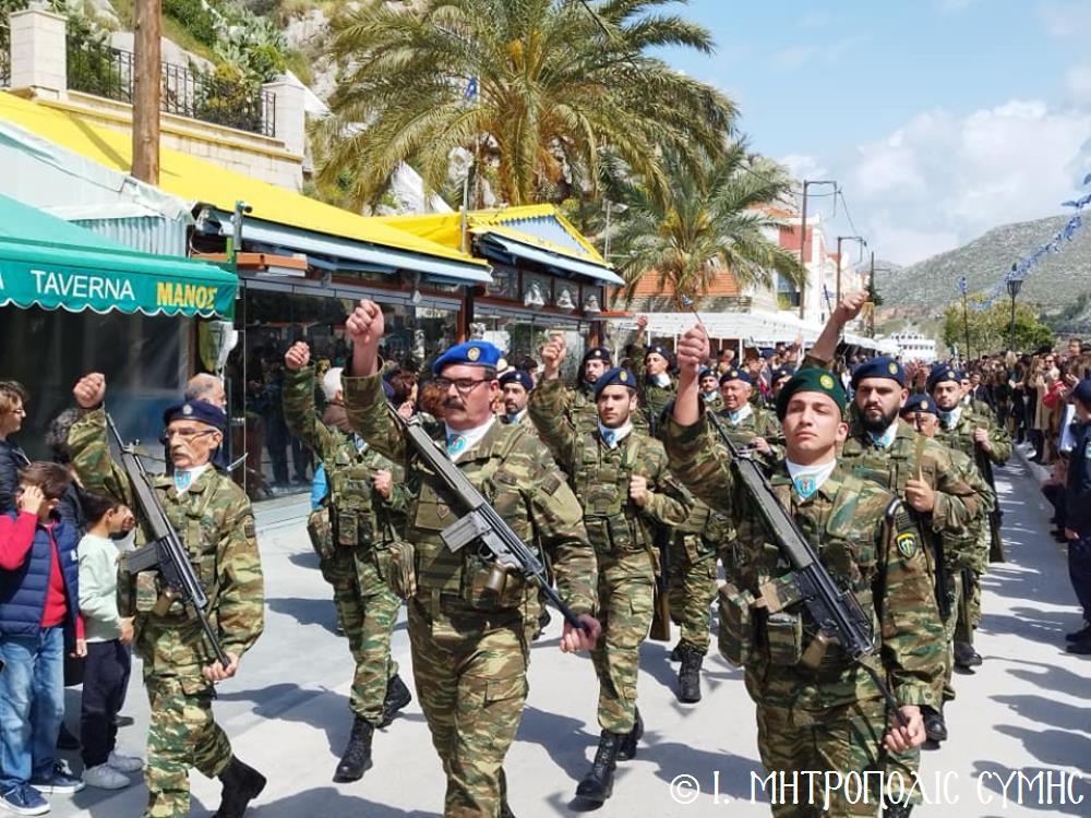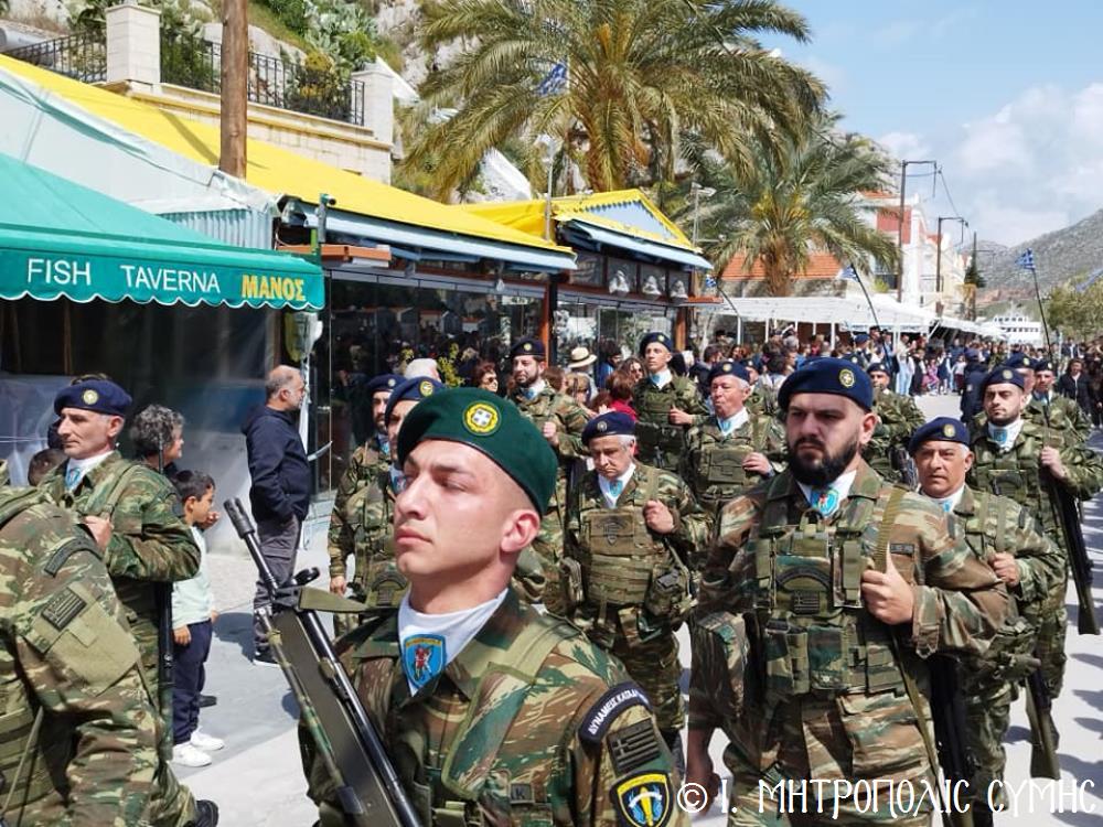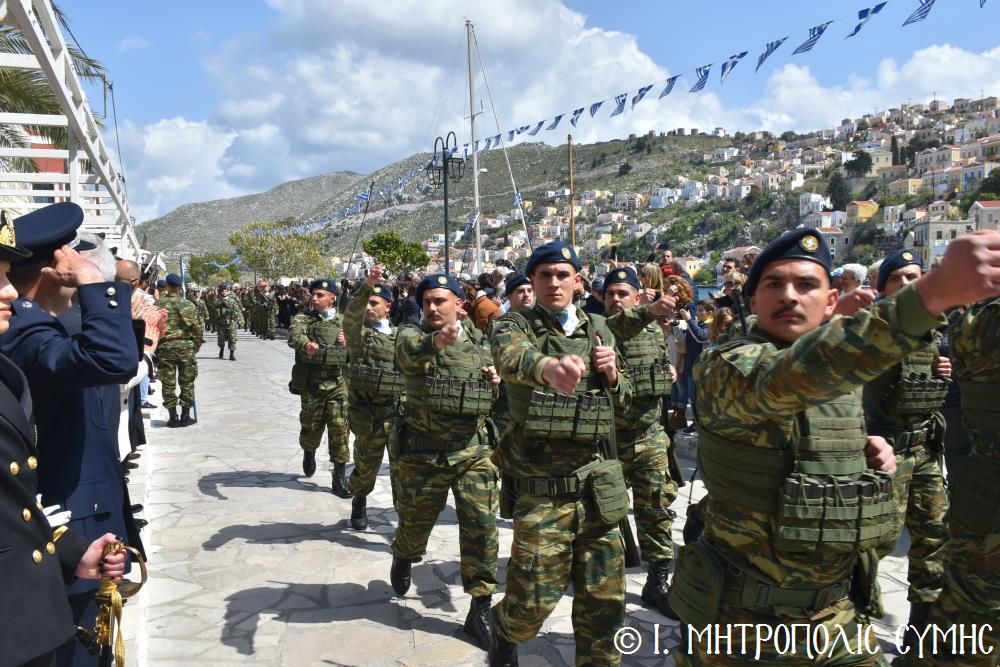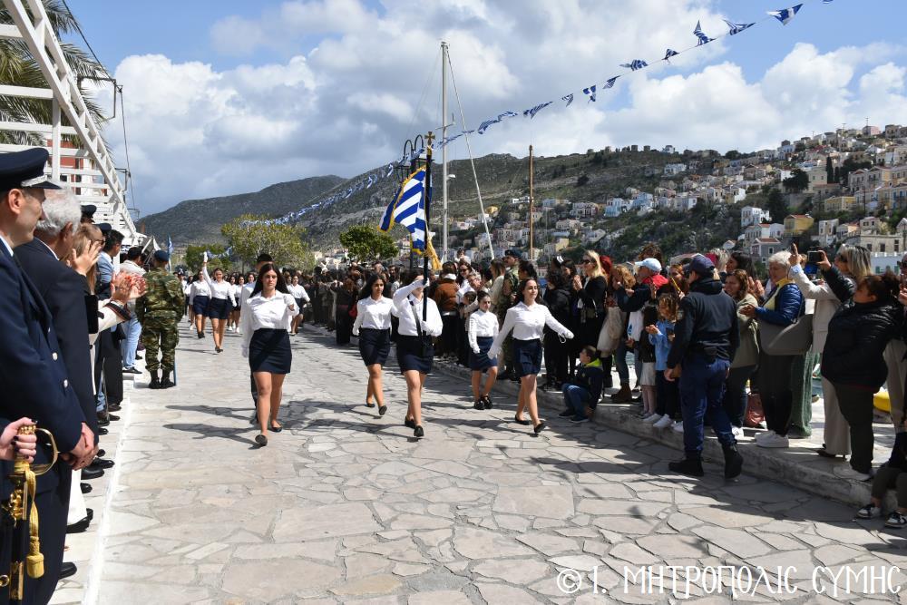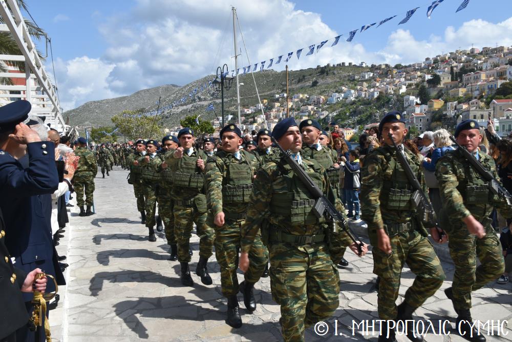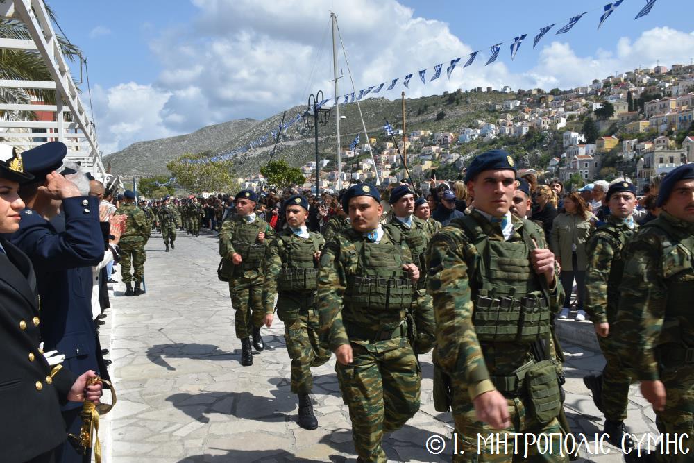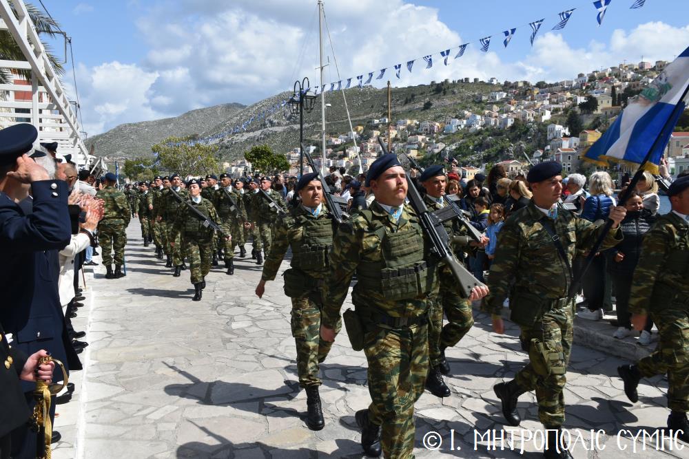 Ἀκολούθησε ἡ παρέλαση ὑπό τούς ἤχους ἐθνικῶν μας ἐμβατηρίων, μέ τόν κόσμο νά χειροκροτᾶ μέ σθένος καί ἐνθουσιασμό. Τήν παρέλαση ξεκίνησαν οἱ μικροί μαθητές τῶν Νηπιαγωγείων καί ἀκολούθησαν ἐκεῖνοι τῶν Δημοτικῶν Σχολείων, οἱ Πρόσκοποι, Μέλη τῆς Ἑνώσεως Γυναικῶν Σύμης μέ τίς τοπικές ἐνδυμασίες τους, ἐν συνεχείᾳ οἱ Μαθητές τοῦ Πανορμιτείου Γυμνασίου καί τῶν Λυκείων τοῦ Νησιοῦ. Τήν παρέλαση ὁλοκλήρωσαν μέ ἐθνική ὑπερηφάνεια καί «ἠθικόν ἀκμαιότατον» οἱ μάχιμοι στρατιῶτες τῆς Δ.Α.Ν. Σύμης καί οἱ ὑπερήφανοι Συμαῖοι Ἔφεδροι Ἐθνοφύλακες.