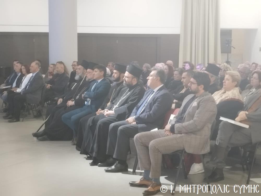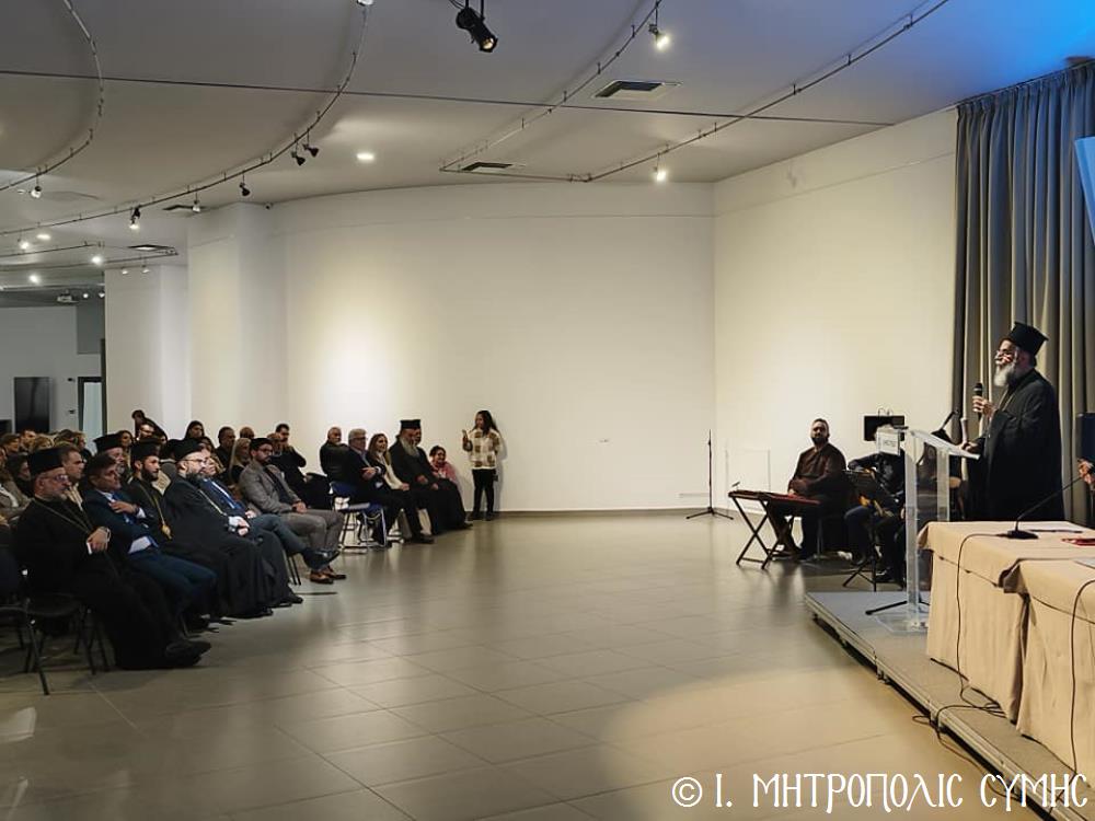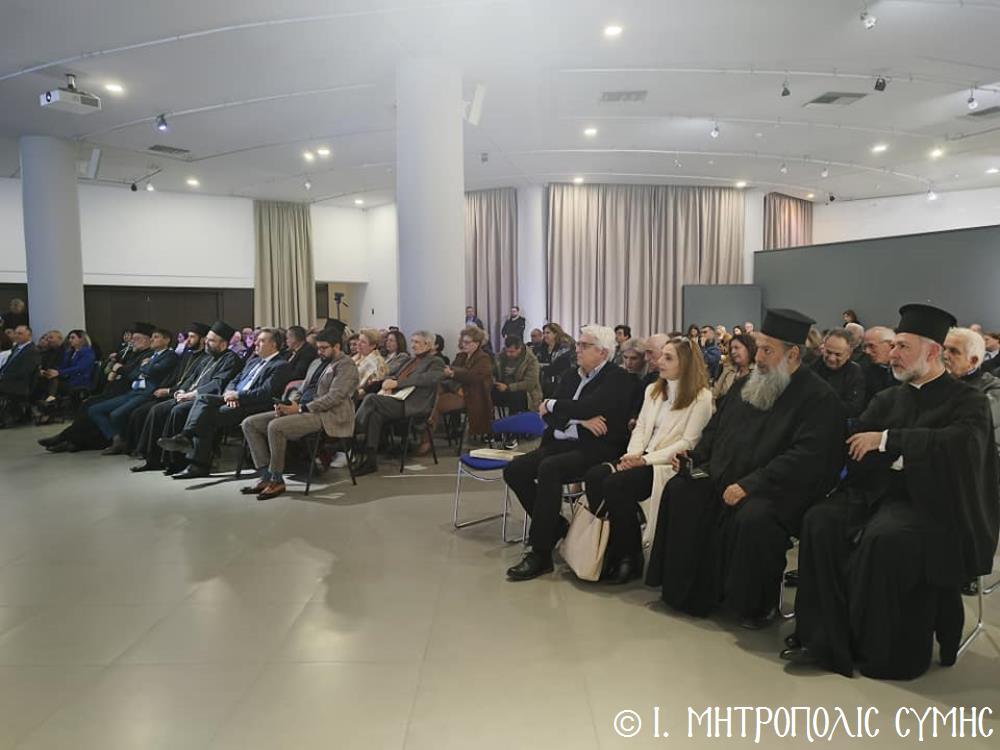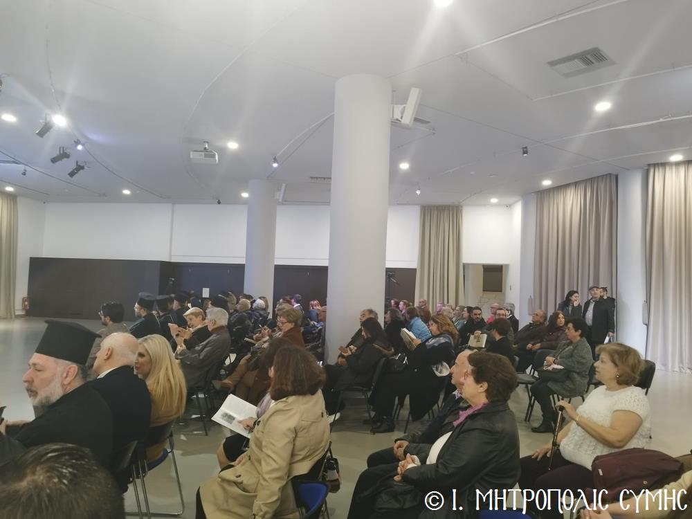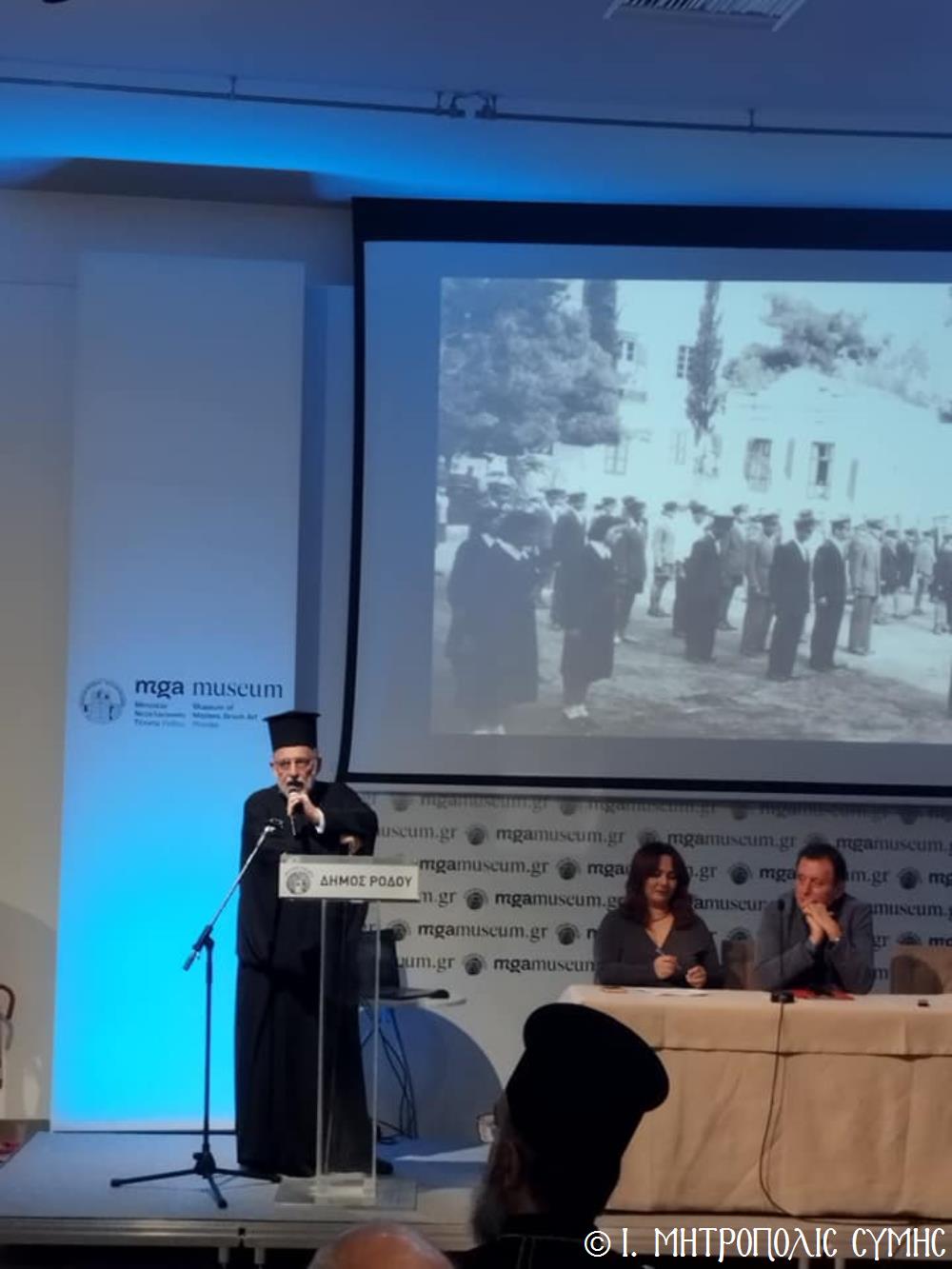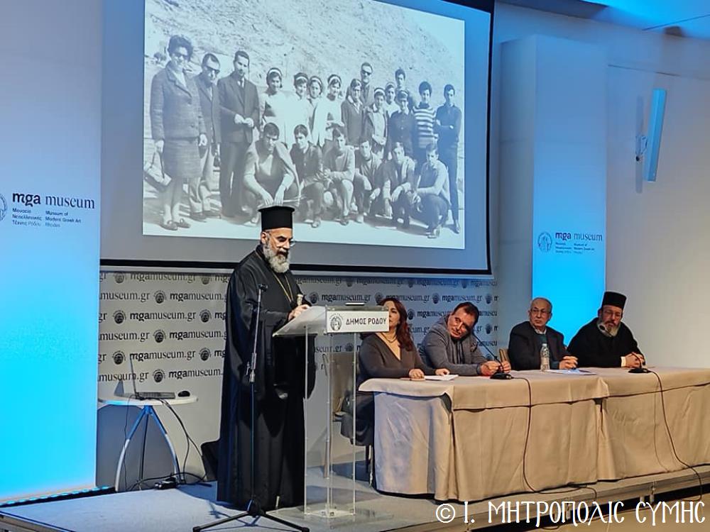 Τόν καταληκτικό χαιρετισμό ἔκανε ὁ Σεβ. Μητροπολίτης μας κ. Χρυσόστομος, ἀναφερόμενος στήν ἔκδοση τοῦ Τόμου, ἐπισημαίνοντας ὅτι ἐπινοήθηκε ὡς τιμή καί χρέος ἀπέναντι σέ ὅσους ἀνάλωσαν τούς ἑαυτούς τους καί «παντοιοτρόπως συνέβαλαν στήν ἐπίτευξη τοῦ ἱεροῦ τούτου σκοποῦ, καί δή ἐν μέσῳ τῆς Ἰταλικῆς κατοχῆς, προσφέροντας ἀποτέλεσμα ἀνέλπιστο διά τά δεδομένα τῆς ἐποχῆς ἐκείνης, τῆς ἱδρύσεως δηλαδή τοῦ πνευματικοῦ αὐτοῦ πνεύμονος, ὁ ὁποῖος ἀπεδείχθη ζωτικός καί καταλυτικός στήν κατίσχυση τοῦ Ἑλληνικοῦ πνεύματος ἔναντι τῆς ἀνίερης καί λυσσαλέας τότε προσπάθειας ἀφελληνισμοῦ καί προσκολλήσεως στόν ἰταλικό κορμό, τόσον τῆς Νήσου μας, ὅσον καί ὅλης τῆς Δωδεκανήσου». Ὁ Σεβασμιώτατος συνέχισε μέ θερμές εὐχαριστίες σ’ ὅλους τούς ἄξιους συντελεστές τῆς ἐκδηλώσεως, μνημονεύοντας ὅσους συνέγραψαν κείμενα καί πρωτοστάτησαν γιά τήν συλλογή τοῦ πλουσίου αὐτοῦ ἀρχειακοῦ ὑλικοῦ, τούς ὁμιλητές μέ ἐπικεφαλῆς τόν Πανοσιολ. Ἀρχιμανδρίτη τοῦ Οἰκουμενικοῦ Θρόνου Ἀντώνιο Πατρό, τόν κ. Μανώλη Ἀντωνόγλου καί τόν κ. Κώστα Σκανδαλίδη, τόν Σύλλογο Συμιακῶν Ρόδου «Ὁ Γλαῦκος» γιά τήν ἄψογη διοργάνωση καί ὅλους τούς Συμαϊκούς Συλλόγους, ἐπίσης τούς μουσικούς κ. Γεώργιο Χατζηπέτρο ἐκ Σύμης καί τό μουσικό σχῆμα τοῦ κ. Μιχ. Καλαϊτζῆ γιά τήν ὄμορφη μουσική βραδιά πού ἀκολούθησε.