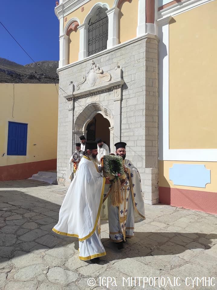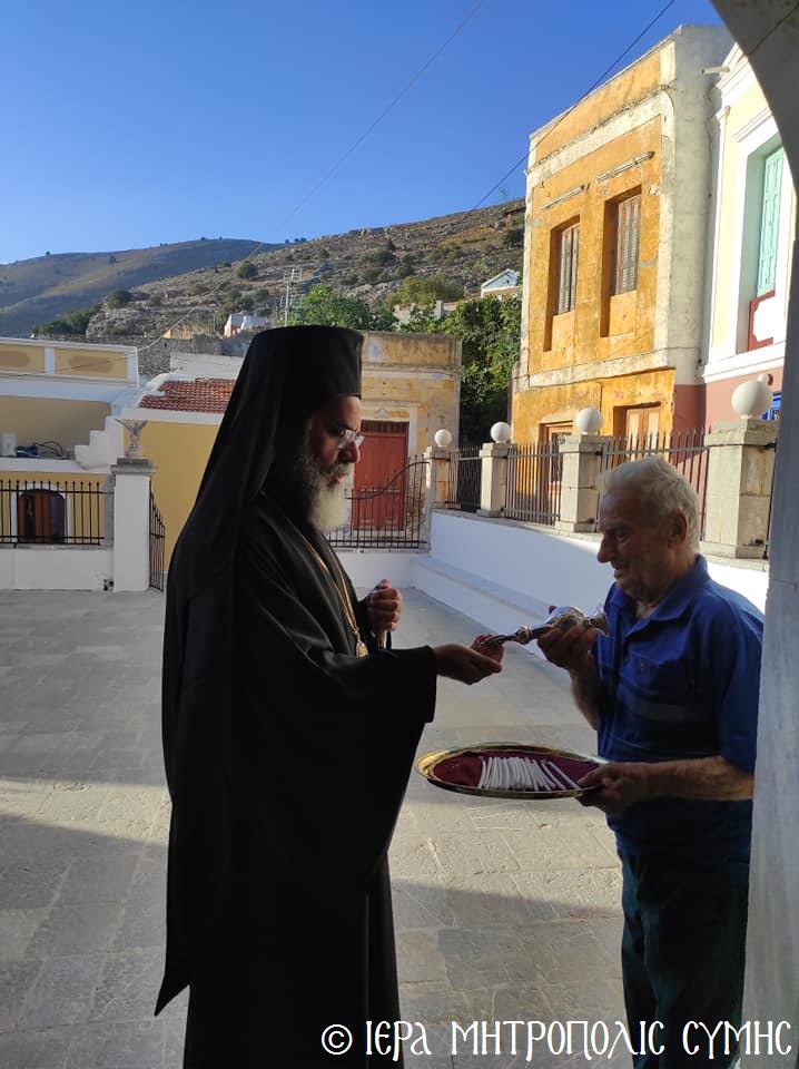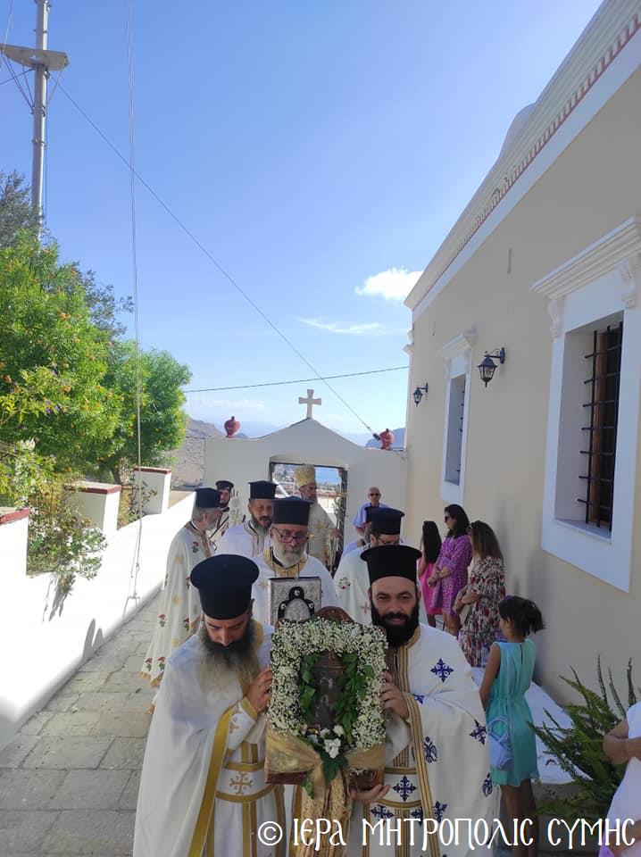 Πρό τῆς ἀπολύσεως, ὁ Σεβασμιώτατος προέστη τῆς λιτανεύσεως τῆς Ἱ. Εἰκόνας τῆς Παναγίας Γλυστριανῆς πέριξ τοῦ Ἱ. Ναοῦ, ἐνῶ μετά τό τέλος τῆς λατρευτικῆς Συνάξεως, προσεφέρθησαν εἰς τό παρακείμενο ἐνοριακό κέντρο τά πατροπαράδοτα κεράσματα τῆς Συμαϊκῆς φιλοξενίας, ὥστε τό κλίμα τῆς πνευματικῆς χαρᾶς καί εὐφροσύνης, νά ἐπισφραγισθεῖ καί μέ τήν εὐλογημένη εὐκαιρία τῆς διαπροσωπικῆς ἐπικοινωνίας καί ἐπαφῆς τῶν ἀνθρώπων. Τό βράδυ, πρόκειται νά λάβει χῶρα στόν προαύλιο χῶρο τοῦ Ἱεροῦ Ναοῦ Ἁγίου Ἀθανασίου καί τό παραδοσιακό πανηγύρι μέ μουσικοχορευτικό πρόγραμμα καί δωρεάν φαγητά καί ποτά, μέ εὐγενῆ χορηγία τοῦ Δήμου Σύμης.
