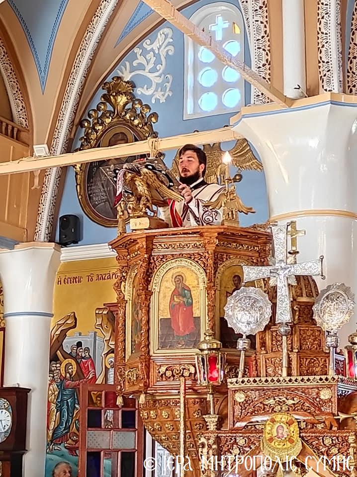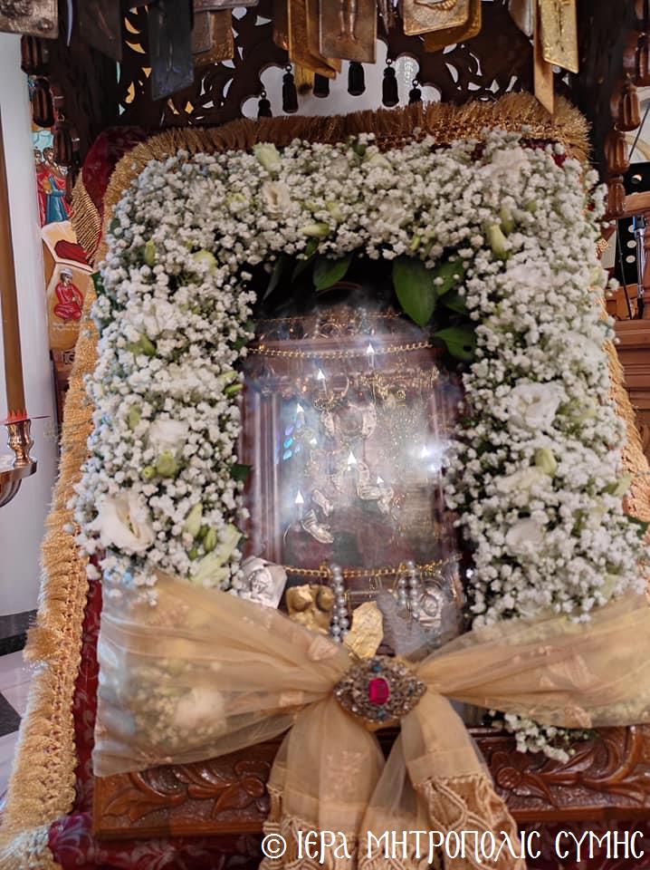 Ὁ Σεβασμιώτατος, ἀπευθυνόμενος στό εὐάριθμο ἐκκλησίασμα, ἀνεφέρθη εἰς τό περιεχόμενον τῆς ἑορτῆς τῆς Τιμίας Ζώνης, ἀλλά καί εἰς τό ἱστορικό τῆς Ἱερᾶς Εἰκόνος τῆς Παναγίας «Γλυστριανῆς», ἡ ὁποία προέρχεται ἀπό τά μαρτυρικά χώματα τῆς Μικρᾶς Ἀσίας καί ἀρχικά ἦταν κτῆμα τῆς οἰκογενείας Ἀννίκας Κάτρη - Καϊλλῆ (Μπουμπουριᾶς), πού τήν μετέφερε μέ τόν ξεριζωμό τοῦ 1922 στήν Σύμη καί σέ μεταγενέστερο χρόνο ἀφιέρωσε στόν ἱστορικό Ἐνοριακό Ναό τοῦ Ἁγίου Ἀθανασίου.