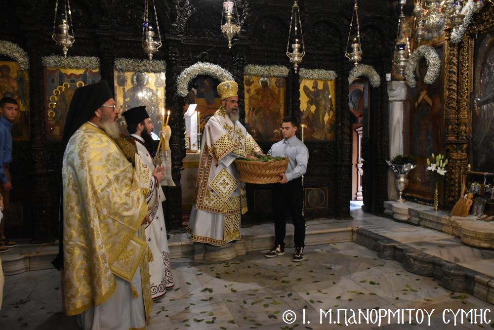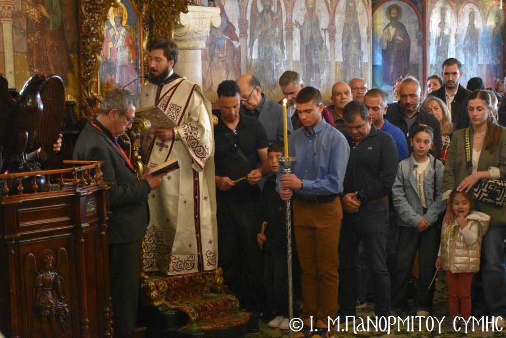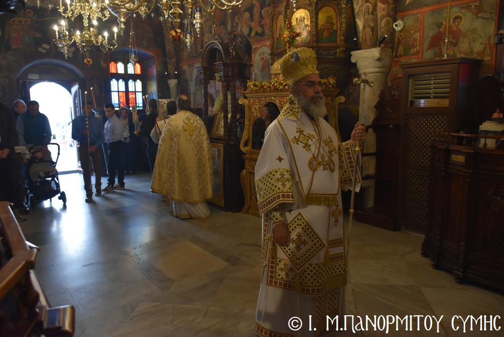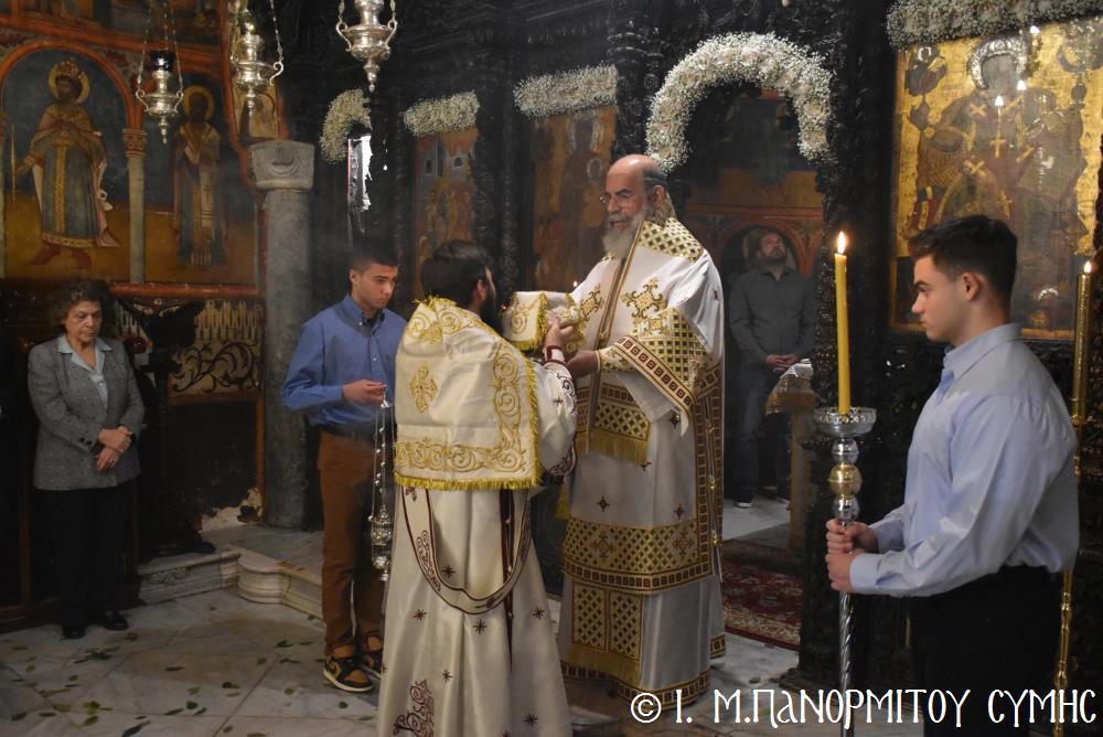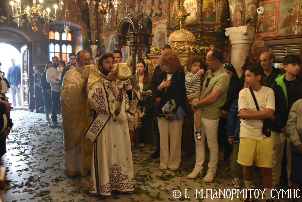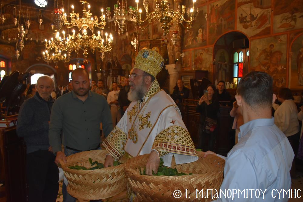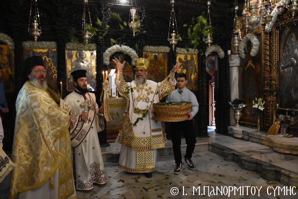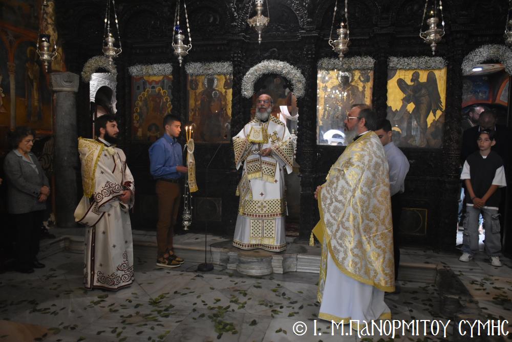 Ὁ Σεβασμιώτατος ψάλλοντας τό «Ἀνάστα ὁ Θεός» ἔρρανε τούς πιστούς καί τόν Ναό μέ δάφνες – τά τῆς νίκης σύμβολα – καί μετέλαβε πλῆθος προσκυνητῶν πού αὐτές τίς μέρες κατακλύζουν τόν Πανορμίτη, εὐχόμενος ἐκ βάθους καρδίας καλή Ἀνάσταση!