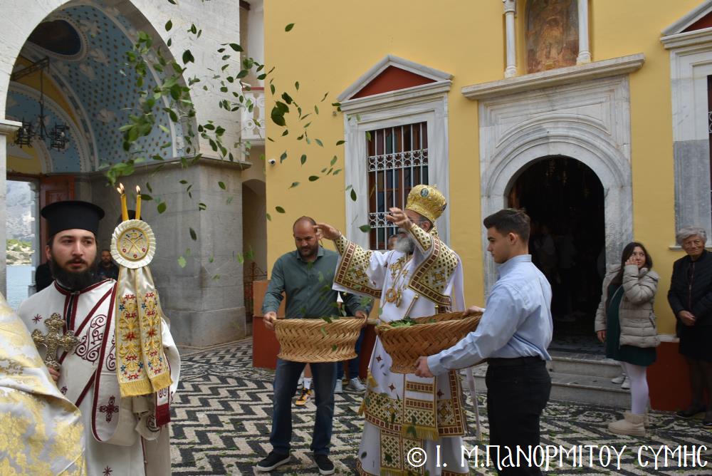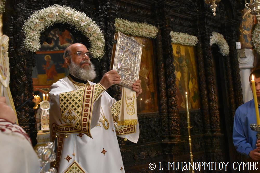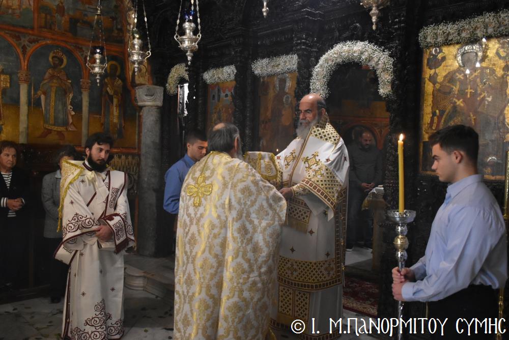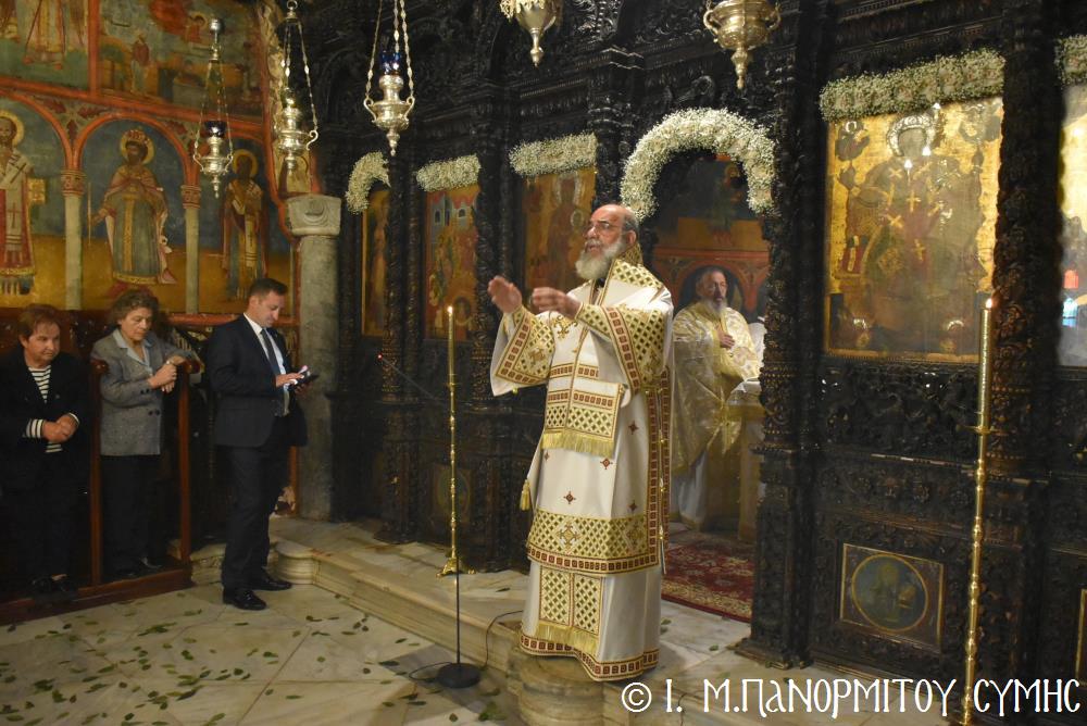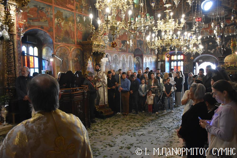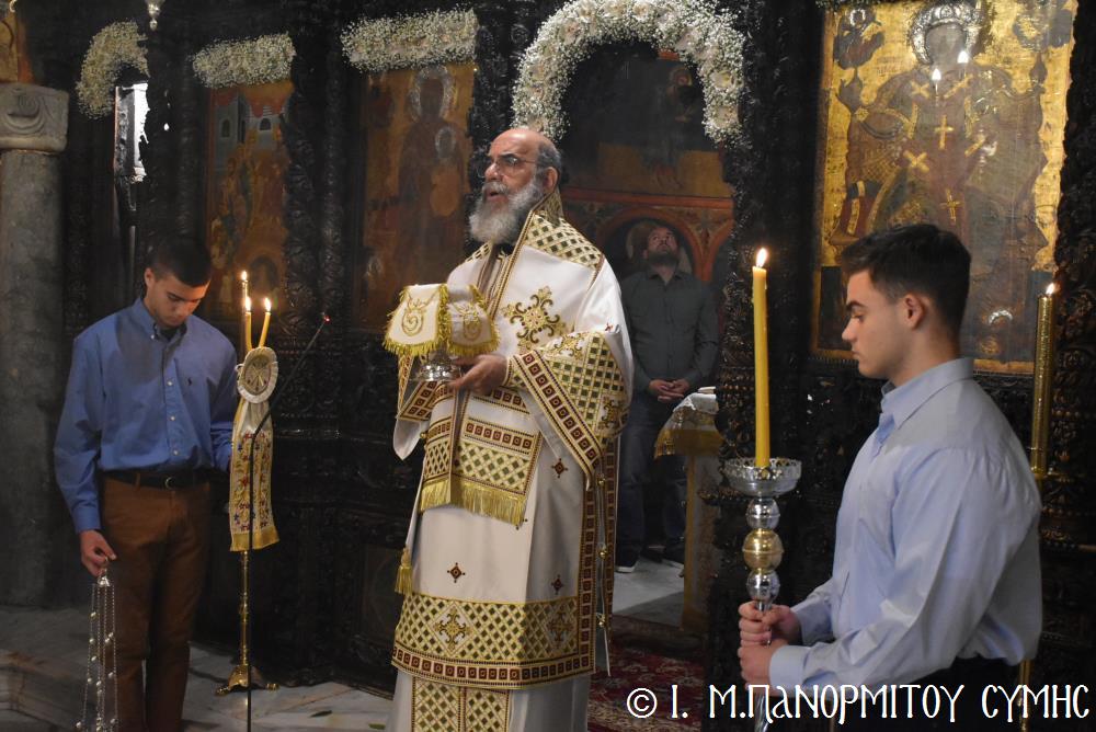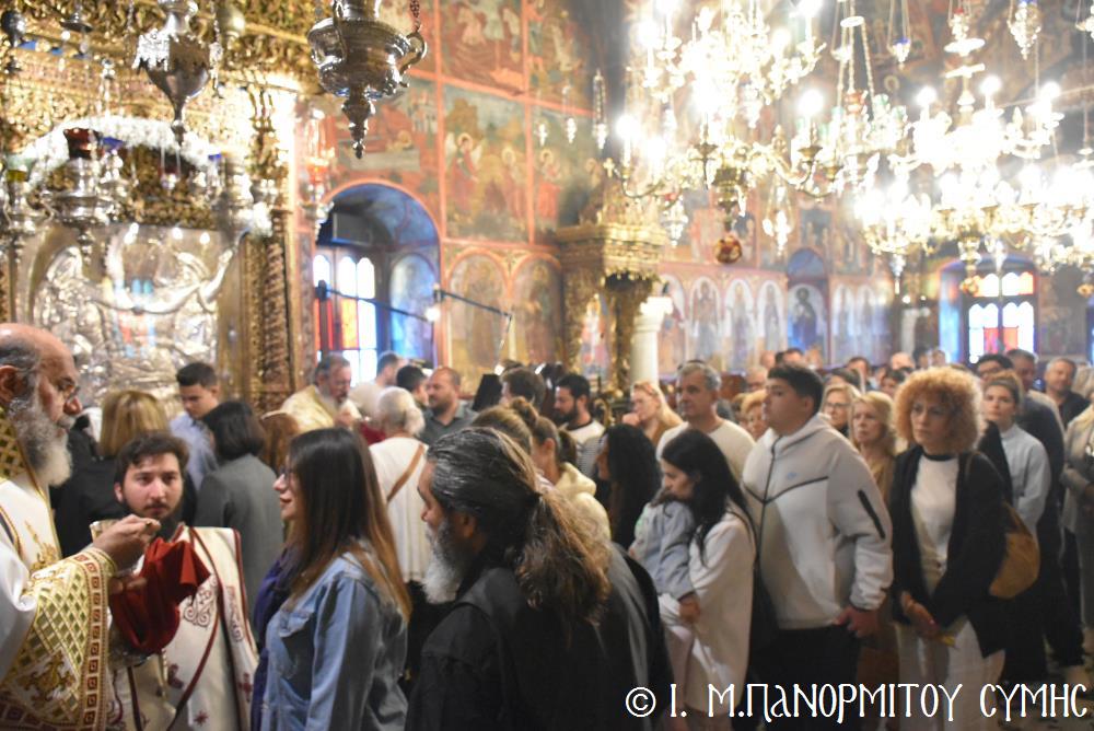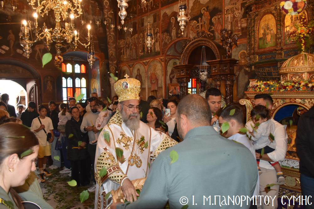 Ὁ Σεβασμιώτατος ψάλλοντας τό «Ἀνάστα ὁ Θεός» ἔρρανε τούς πιστούς καί τόν Ναό μέ δάφνες – τά τῆς νίκης σύμβολα – καί μετέλαβε πλῆθος προσκυνητῶν πού αὐτές τίς μέρες κατακλύζουν τόν Πανορμίτη, εὐχόμενος ἐκ βάθους καρδίας καλή Ἀνάσταση!