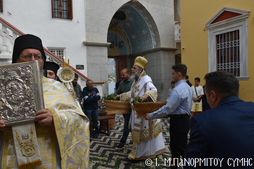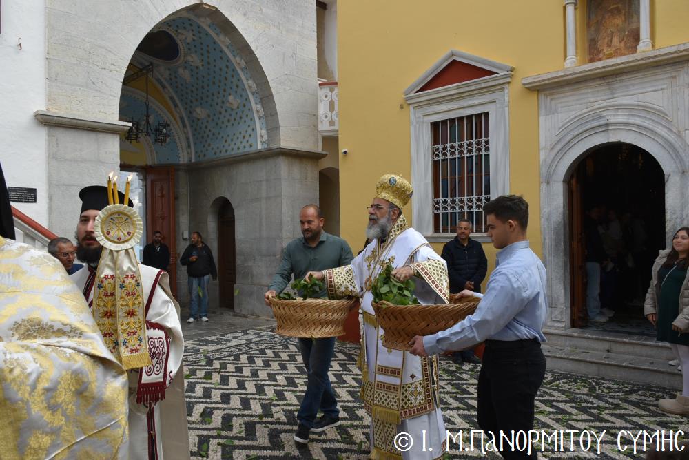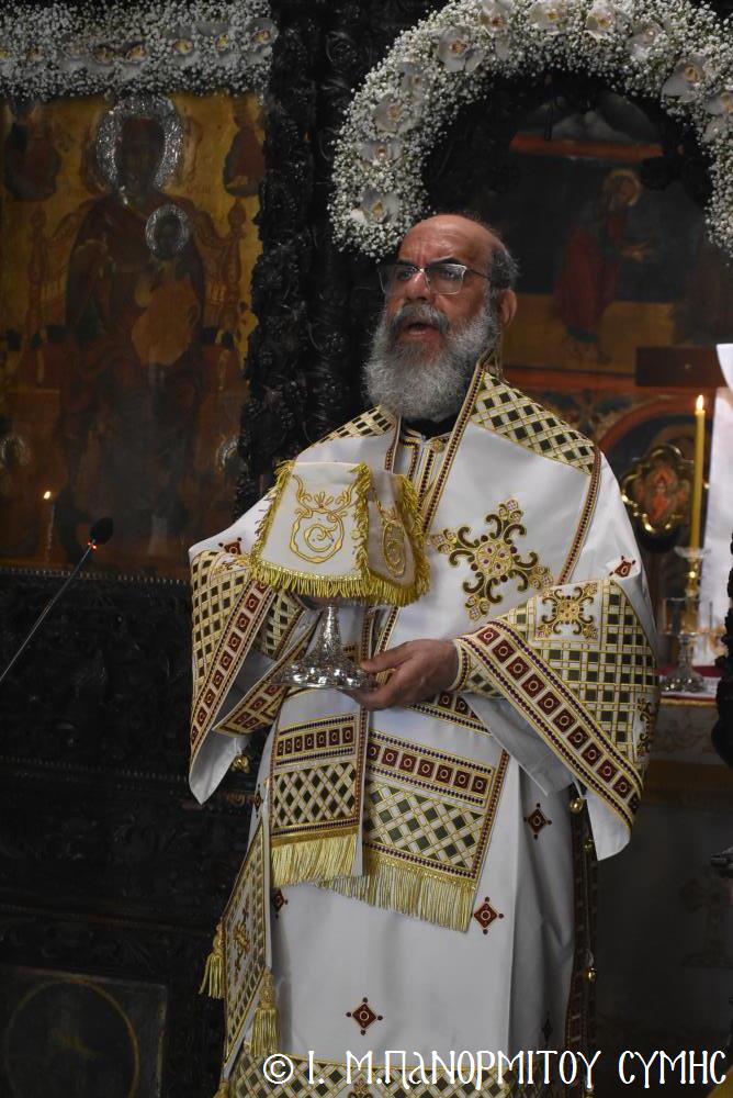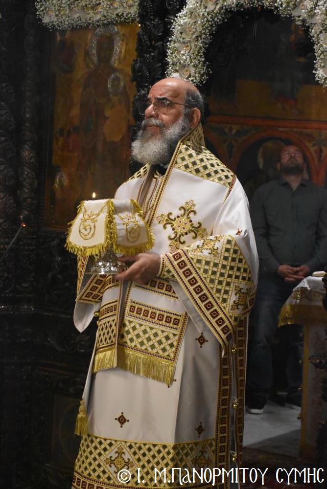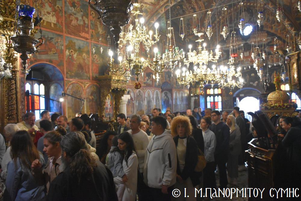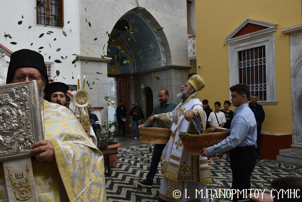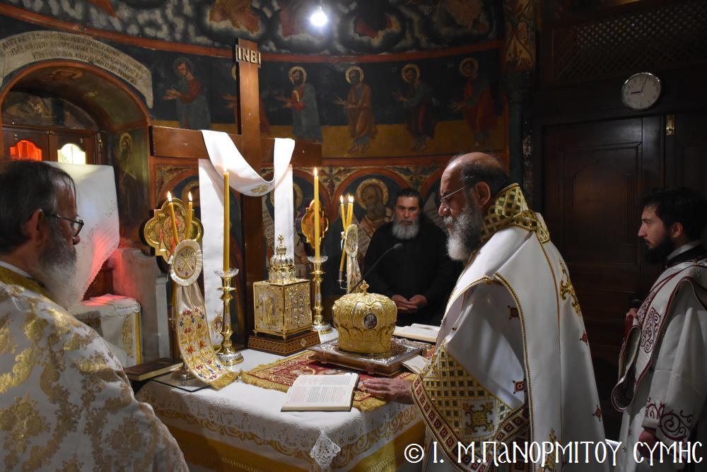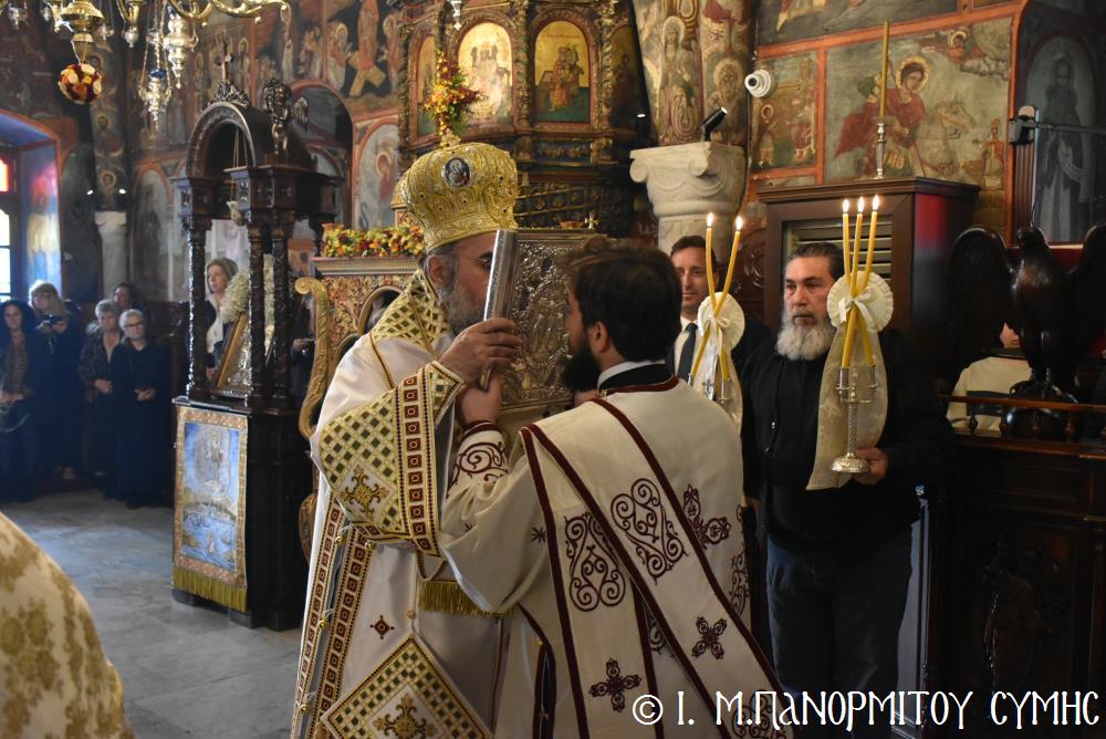 Ὁ Σεβασμιώτατος ψάλλοντας τό «Ἀνάστα ὁ Θεός» ἔρρανε τούς πιστούς καί τόν Ναό μέ δάφνες – τά τῆς νίκης σύμβολα – καί μετέλαβε πλῆθος προσκυνητῶν πού αὐτές τίς μέρες κατακλύζουν τόν Πανορμίτη, εὐχόμενος ἐκ βάθους καρδίας καλή Ἀνάσταση!