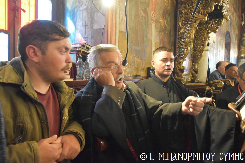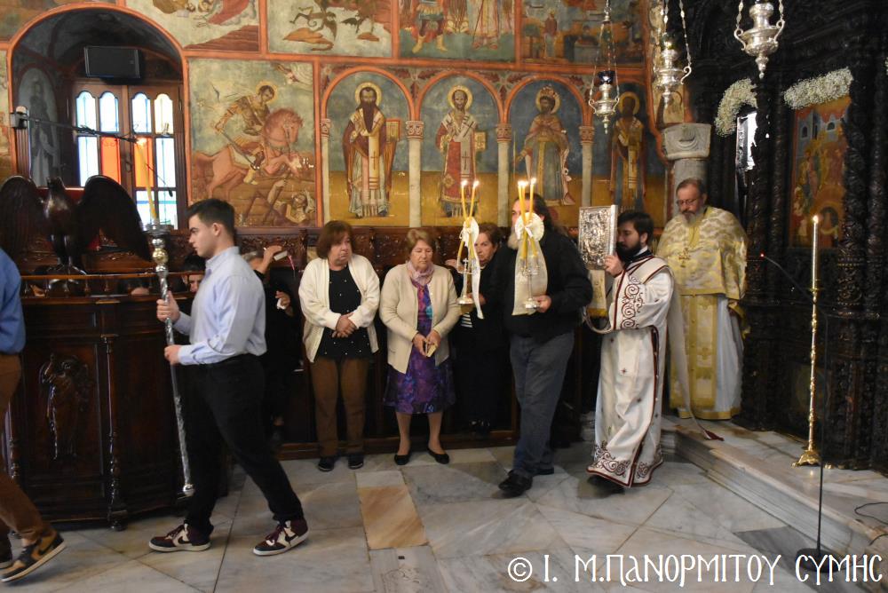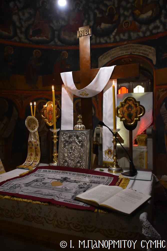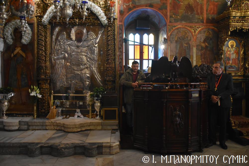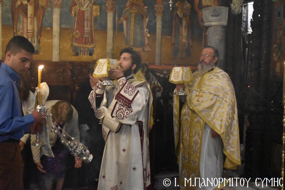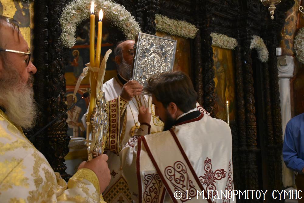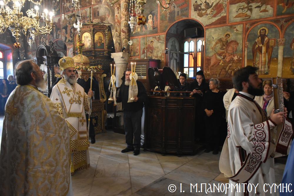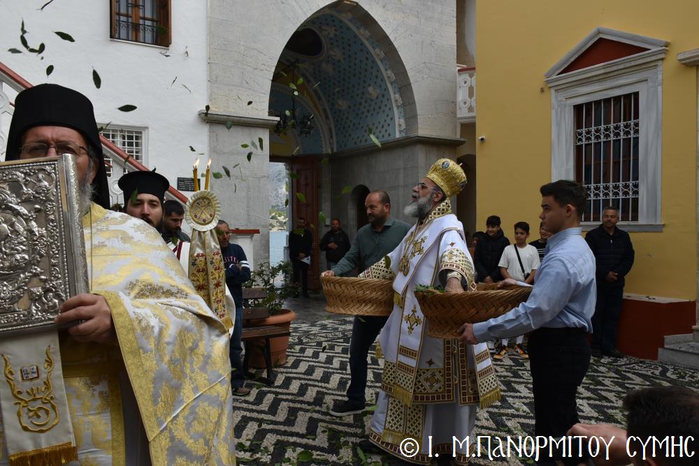 Ὁ Σεβασμιώτατος ψάλλοντας τό «Ἀνάστα ὁ Θεός» ἔρρανε τούς πιστούς καί τόν Ναό μέ δάφνες – τά τῆς νίκης σύμβολα – καί μετέλαβε πλῆθος προσκυνητῶν πού αὐτές τίς μέρες κατακλύζουν τόν Πανορμίτη, εὐχόμενος ἐκ βάθους καρδίας καλή Ἀνάσταση!