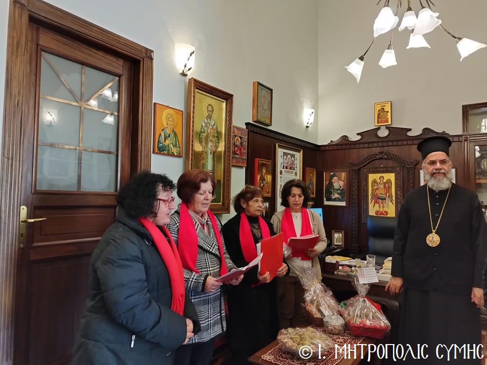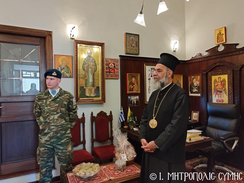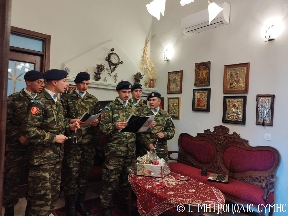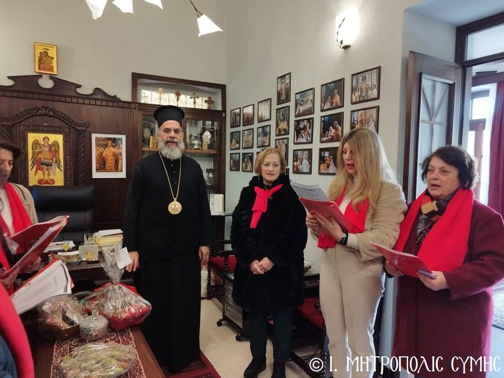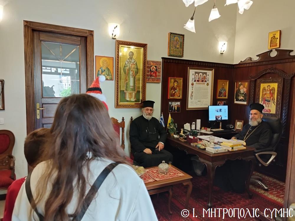 Μετά τήν ἀπόλυση, ὁ Σεβασμιώτατος ἐπέστρεψε εἰς τό Μητροπολιτικό Μέγαρο, ὅπου ἐδέχθη έν χαρᾷ τούς Στρατιῶτες τῆς Δ.Α.Ν. Σύμης πού τοῦ ἔψαλαν τά κάλαντα, ἐν συνεχείᾳ τίς Κυρίες τῆς Ἑνώσεως Γυναικῶν Σύμης καί ἀκολούθως μέχρι ἀργά δεκάδες παιδιά, τά ὁποῖα μέ τόν πατροπαράδοτο αὐτό τρόπο, τηρώντας τά ἁγνά αὐτά ἔθιμα τοῦ λαοῦ μας, μετέφεραν τό μήνυμα τῆς Ένσαρκώσεως τοῦ Θεοῦ Λόγου. Ὁ Σεβασμιώτατος εὐχήθη σέ ὅλους τά δέοντα καί προσέφερε τά συνήθη ἑόρτια κεράσματα καί παιδικά φιλοδωρήματα.