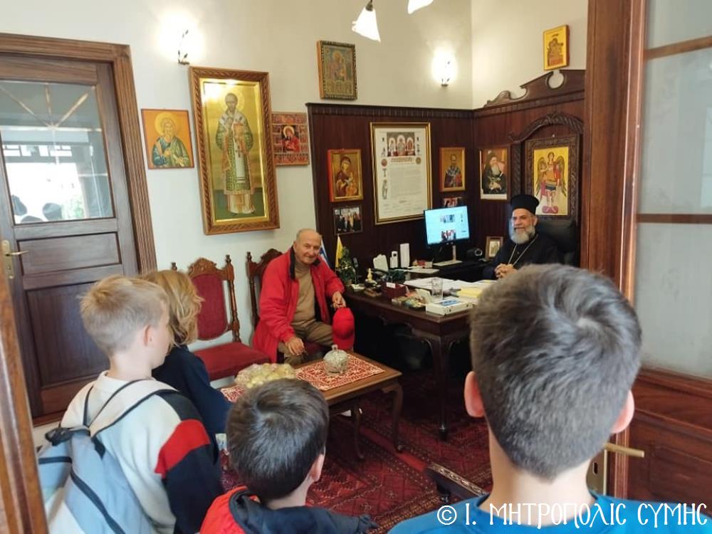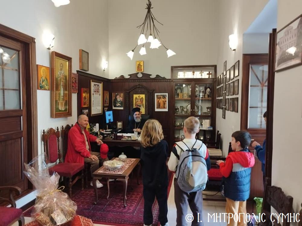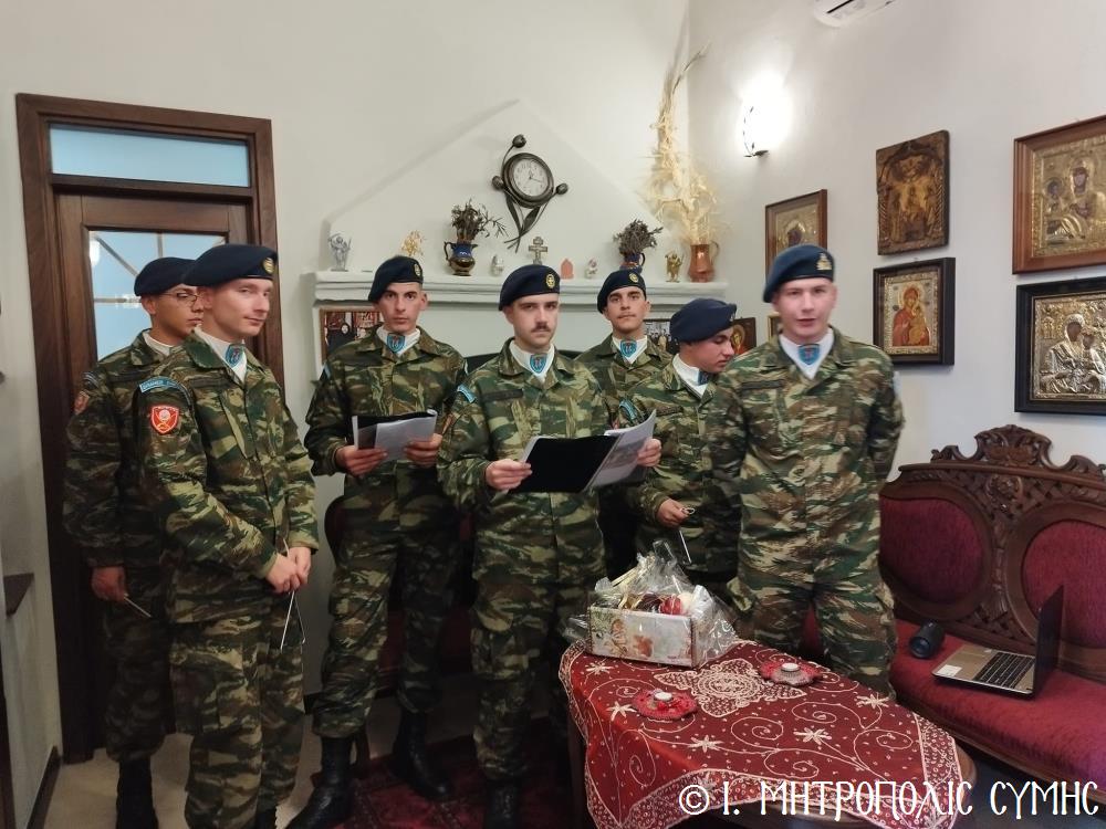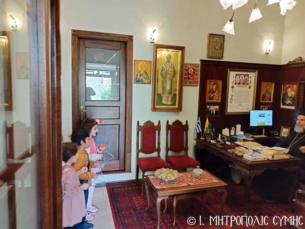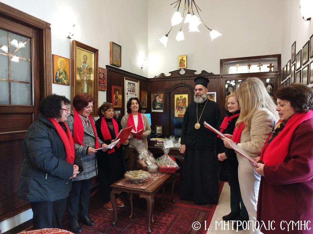 Μετά τήν ἀπόλυση, ὁ Σεβασμιώτατος ἐπέστρεψε εἰς τό Μητροπολιτικό Μέγαρο, ὅπου ἐδέχθη έν χαρᾷ τούς Στρατιῶτες τῆς Δ.Α.Ν. Σύμης πού τοῦ ἔψαλαν τά κάλαντα, ἐν συνεχείᾳ τίς Κυρίες τῆς Ἑνώσεως Γυναικῶν Σύμης καί ἀκολούθως μέχρι ἀργά δεκάδες παιδιά, τά ὁποῖα μέ τόν πατροπαράδοτο αὐτό τρόπο, τηρώντας τά ἁγνά αὐτά ἔθιμα τοῦ λαοῦ μας, μετέφεραν τό μήνυμα τῆς Ένσαρκώσεως τοῦ Θεοῦ Λόγου. Ὁ Σεβασμιώτατος εὐχήθη σέ ὅλους τά δέοντα καί προσέφερε τά συνήθη ἑόρτια κεράσματα καί παιδικά φιλοδωρήματα.
