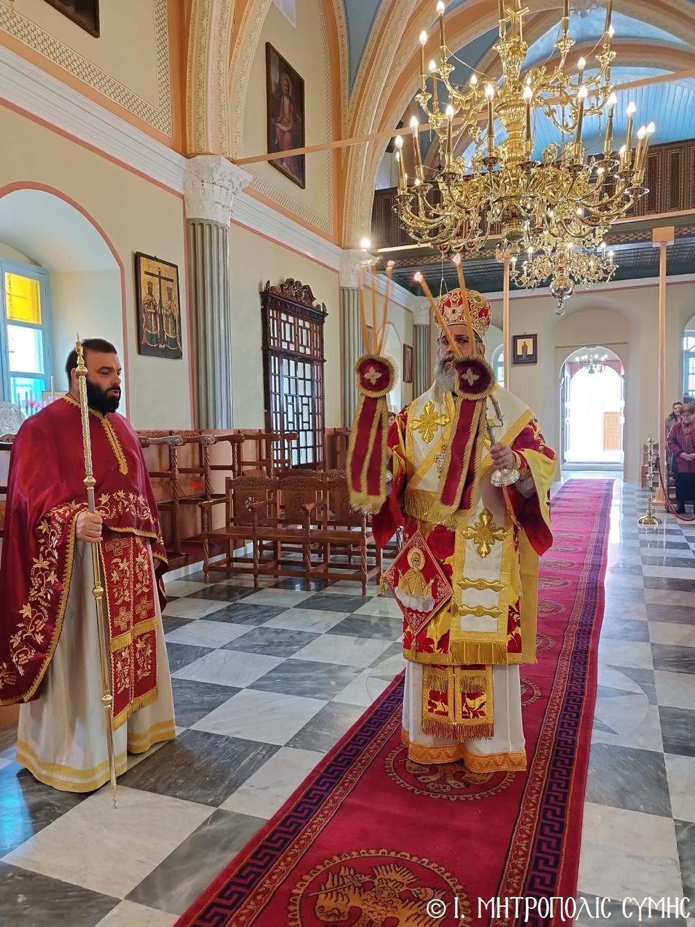Σήμερα, 17η Μαρτίου 2024 Κυριακή τῆς Τυροφάγου, ἡμέρα πικρᾶς ἀναμνήσεως «τῆς ἀπὸ τοῦ Παραδείσου τῆς τρυφῆς ἐξορίας τοῦ Πρωτοπλάστου Ἀδάμ», ὁ Σεβ. Μητροπολίτης μας κ. Χρυσόστομος χοροστάτησε στόν Ὄρθρο καί τέλεσε τήν Θ. Λειτουργία στόν Ἐνοριακό Ἱ. Ναό τοῦ Ἁγίου Ἐλευθερίου Σύμης, μέ συλλειτουργούς του τόν Ἐφημέριο τῆς Ἐνορίας π. Φιλόθεο Κάλφα καί τόν Ἱεροδιάκονο π. Παῦλο Τερεζάκη, ἑορτάζων καί τήν 6η ἐπέτειο τῆς Ἐνθρονήσεώς του. Τό δέ ἱερό ἀναλόγιο διακόνησαν γλυκυφθόγγως οἱ καλλικέλαδοι Ἱεροψάλτες, κ. Ἐλευθέριος Ξηράκης καί κ. Ἀναστάσιος Μπαλής.