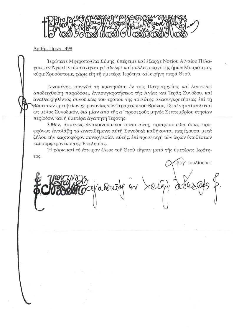 Κατωτέρω παραθέτομεν τήν σεπτήν Πατριαρχικήν ἐπιστολήν τῆς Α.Θ.Π. τοῦ Οἰκουμενικοῦ μας Πατριάρχου κ. κ. Βαρθολομαίου, καί τήν ἀπάντησιν εὐχαριστίας τοῦ Σεβ. Μητροπολίτου μας κ. Χρυσοστόμου.