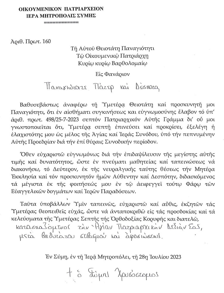 Συμφώνως μέ τήν ὑπ’ ἀριθ. Πρωτ. 498/25-7-2023 σεπτήν Πατριαρχικήν ἐπιστολήν τῆς Α.Θ.Π. τοῦ Οἰκουμενικοῦ μας Πατριάρχου κ.κ. Βαρθολομαίου, ὁ Σεβασμιώτατος Μητροπολίτης μας κ. Χρυσόστομος ἐξελέγη καί ἐκλήθη ὡς μέλος τῆς Ἁγίας καί Ἱερᾶς Συνόδου τοῦ Οἰκουμενικοῦ Πατριαρχείου, προεδρευομένης ὑπό τῆς Α.Θ. Παναγιότητος διά τήν νέαν ἐτήσιαν περίοδον, τουτέστιν ἀπό 1ης Σεπτεμβρίου 2023 ἕως 31ης Αὐγούστου 2024.