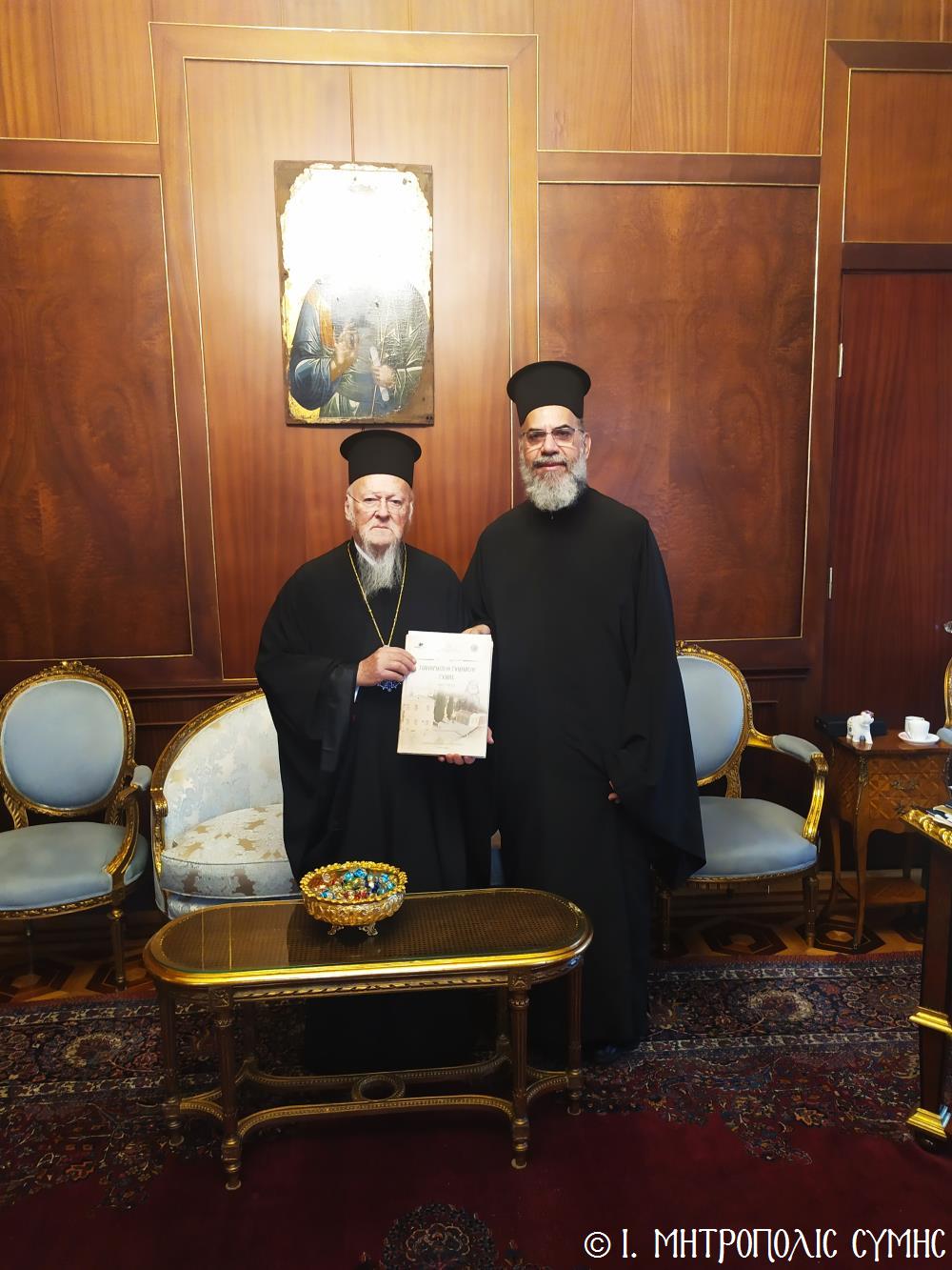 Μέ ἰδιαιτέρα χαρά ἀνακοινώνεται, ὅτι ἐχθές Πέμπτη 16η Νοεμβρίου 2023, ὁ Σεβ. Μητροπολίτης μας κ. Χρυσόστομος, εὑρισκόμενος στό Οἰκουμενικό Πατριαρχεῖο ἐν Κωνσταντινουπόλει διά τήν συμμετοχή του στήν συνεδρίαση τῆς Ἁγίας καί Ἱερᾶς Συνόδου, ὡς τακτικό Μέλος Αὐτῆς διά τήν παροῦσα περίοδο, ἐγένετο δεκτός ἀπό τήν Αὐτοῦ Θειοτάτη Παναγιότητα τόν Οἰκουμενικό μας Πατριάρχη Κ.κ. Βαρθολομαῖον, πρός τόν Ὁποῖον προσέφερε τόν ἄρτι τυπωθέντα ἐπετειακό Τόμο: «100 χρόνια, Πανορμίτειο Γυμνάσιο Σύμης, 1922-2022», ἔκδοσιν τῆς καθ’ ἡμᾶς Ἱερᾶς Μητροπόλεως καί τόν ὁποῖο προλογίζει ὁ Ἴδιος ὁ Πατριάρχης τοῦ Γένους, περιποιώντας ἐπιπλέον τιμή καί αἴγλη στήν Νῆσο μας.
