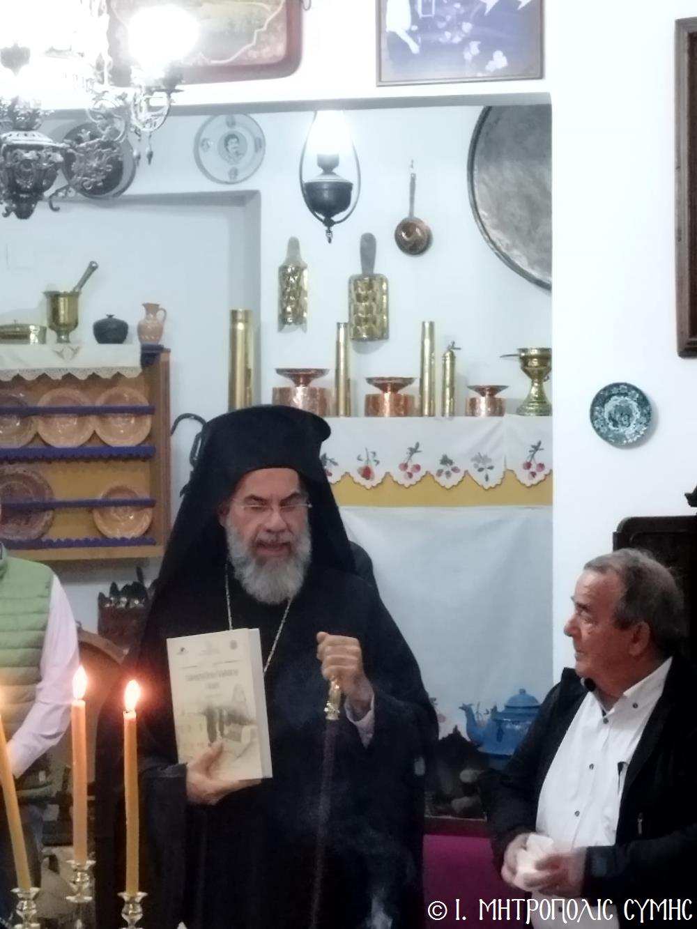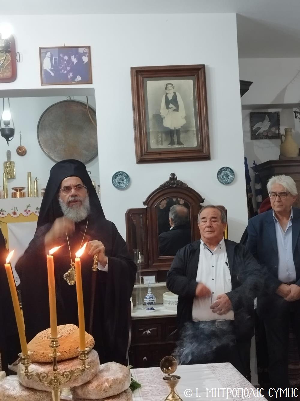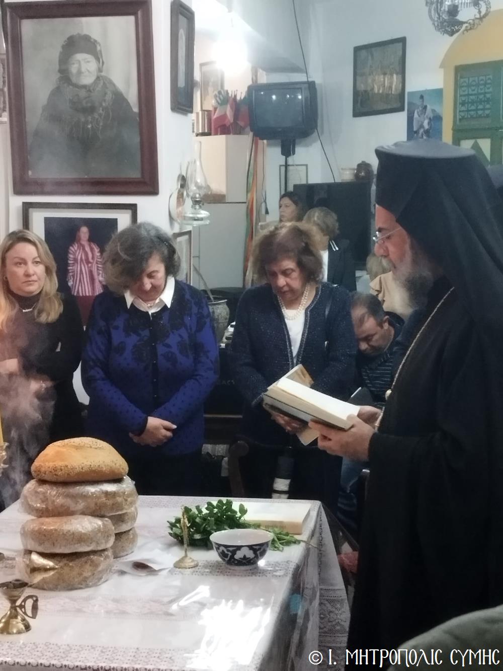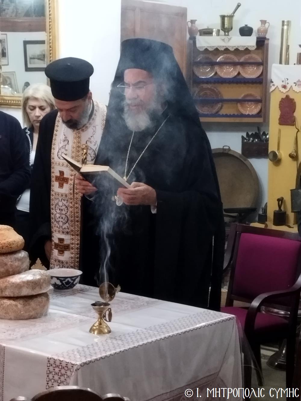 Τό βράδυ τοῦ Σαββάτου, ὁ Σεβασμιώτατος ἐπισκέφθηκε τό «Συμιακό σπίτι» μέ τόν ὑπέροχο ἐκθεσιακό του χῶρο, ὅπου εὐλόγησε τήν Ἀρτοκλασία καί τέλεσε Ἁγιασμό. Ἐν συνεχείᾳ, παρουσίασε μέ ἰδιαιτέρα χαρά καί ἱκανοποίηση τόν ἄρτι τυπωθέντα ἐπετειακό Τόμο: «100 χρόνια, Πανορμίτειο Γυμνάσιο Σύμης, 1922-2022», ἔκδοση τῆς καθ’ ἡμᾶς Ἱερᾶς Μητροπόλεως, ὁ ὁποῖος ἐξεδόθη μέ τήν συνεργασία καί ἀρωγή, μεταξύ ἄλλων, καί τοῦ Συλλόγου «Γλαῦκος» καί ἰδιαιτέρως τοῦ ἐξέχοντος στελέχους του κ. Ἐμμανουήλ Ἀντωνόγλου, ὁ ὁποῖος μετεῖχε στήν ἐκδοτική ἐπιτροπή.